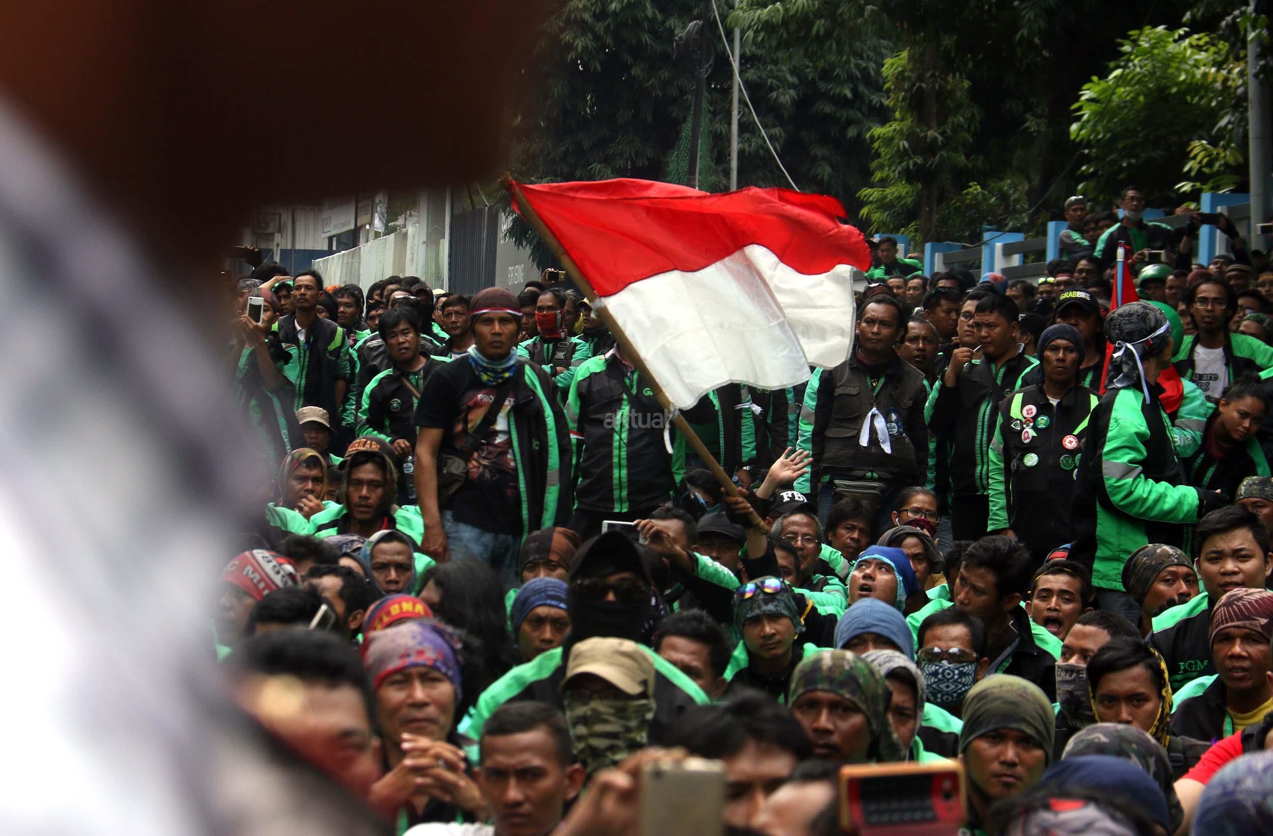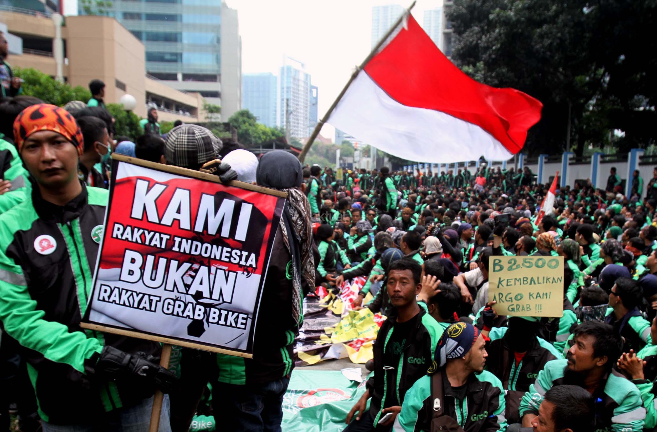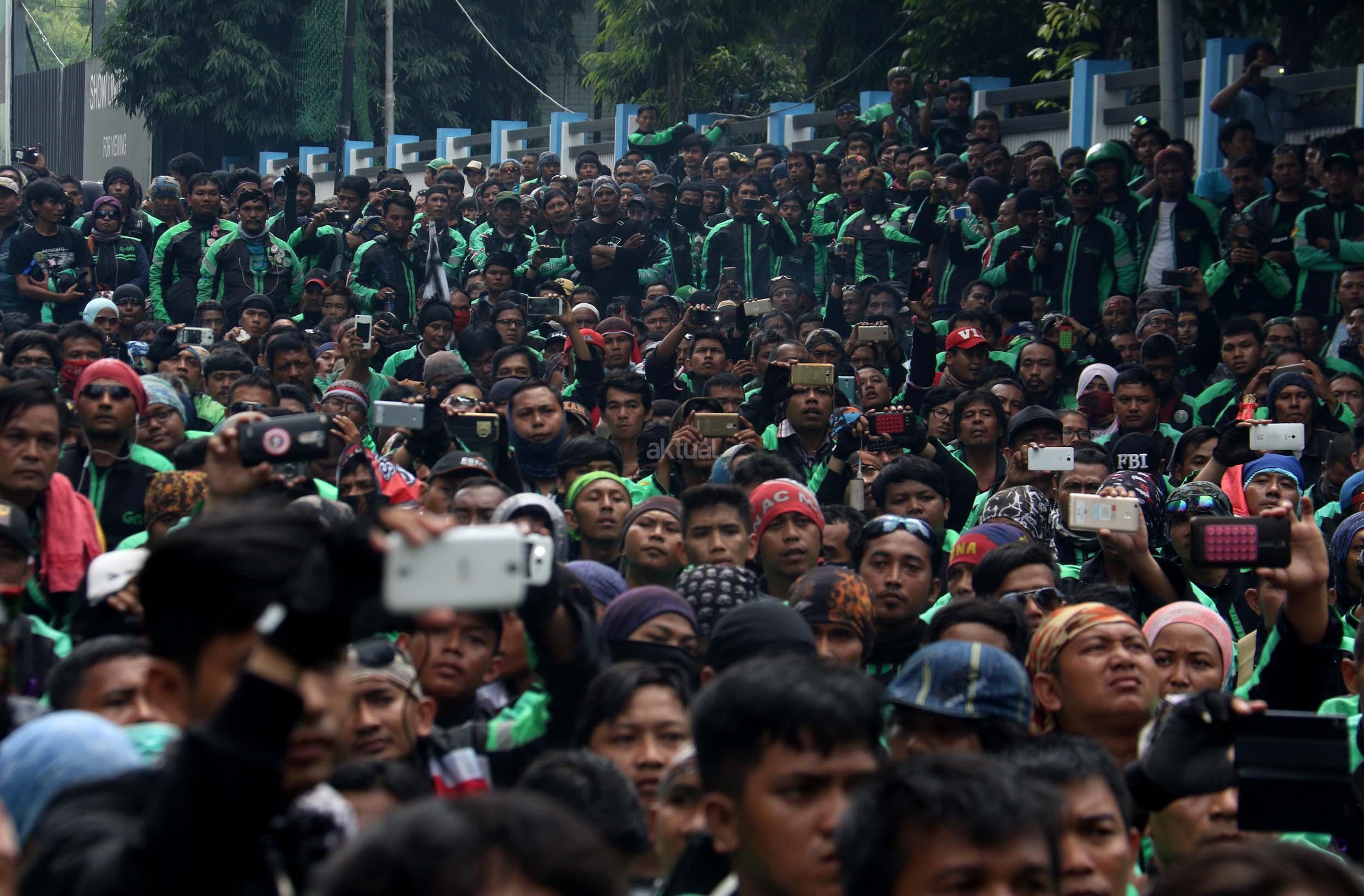Ratusan driver GrabBike melakukan unjuk rasa di Kantor Grab Indonesia di Jalan Denpasar, Kuningan, Jakarta, Kamis (5/1/2017).Dalam aksinya para driver Grabike meminta perusahaan menaikkan tarif dari Rp 1.500 per kilometer menjadi Rp 2.500 per kilometer, Forum Gabungan GrabBike Bersatu juga meminta perusahaan mempekerjakan lagi driver GrabBike yang diputus kemitraannya karena aksi one day no bit atau tidak beroperasi pada tanggal 16 Desember 2016 lalu. AKTUAL/Munzir