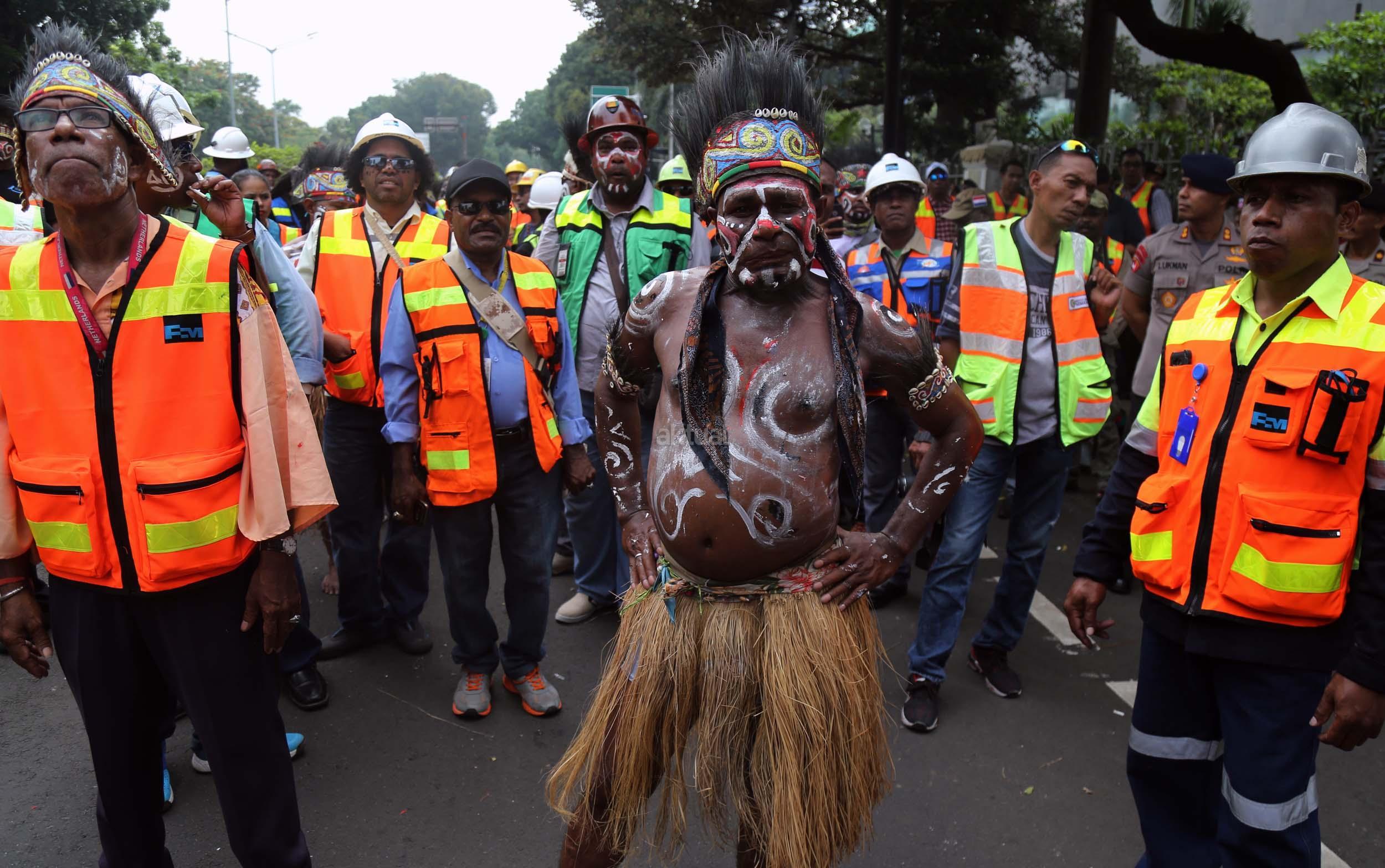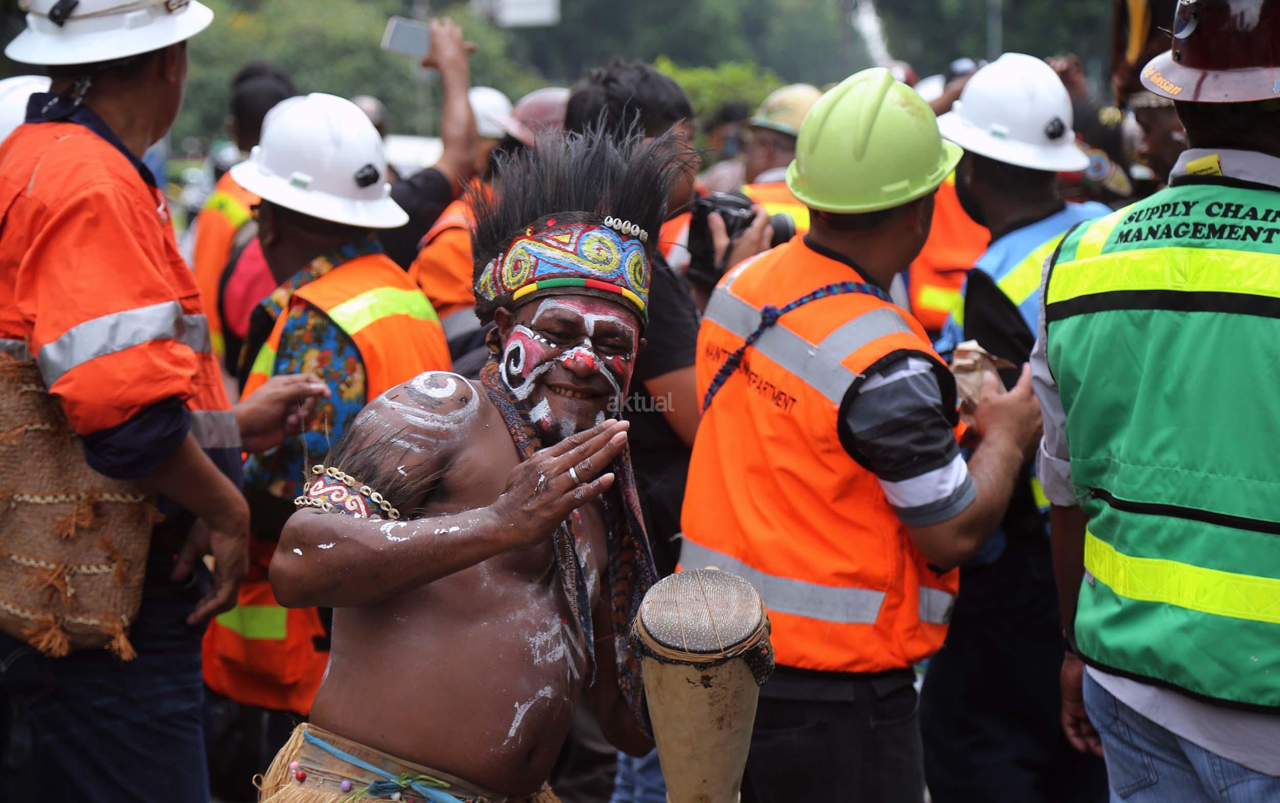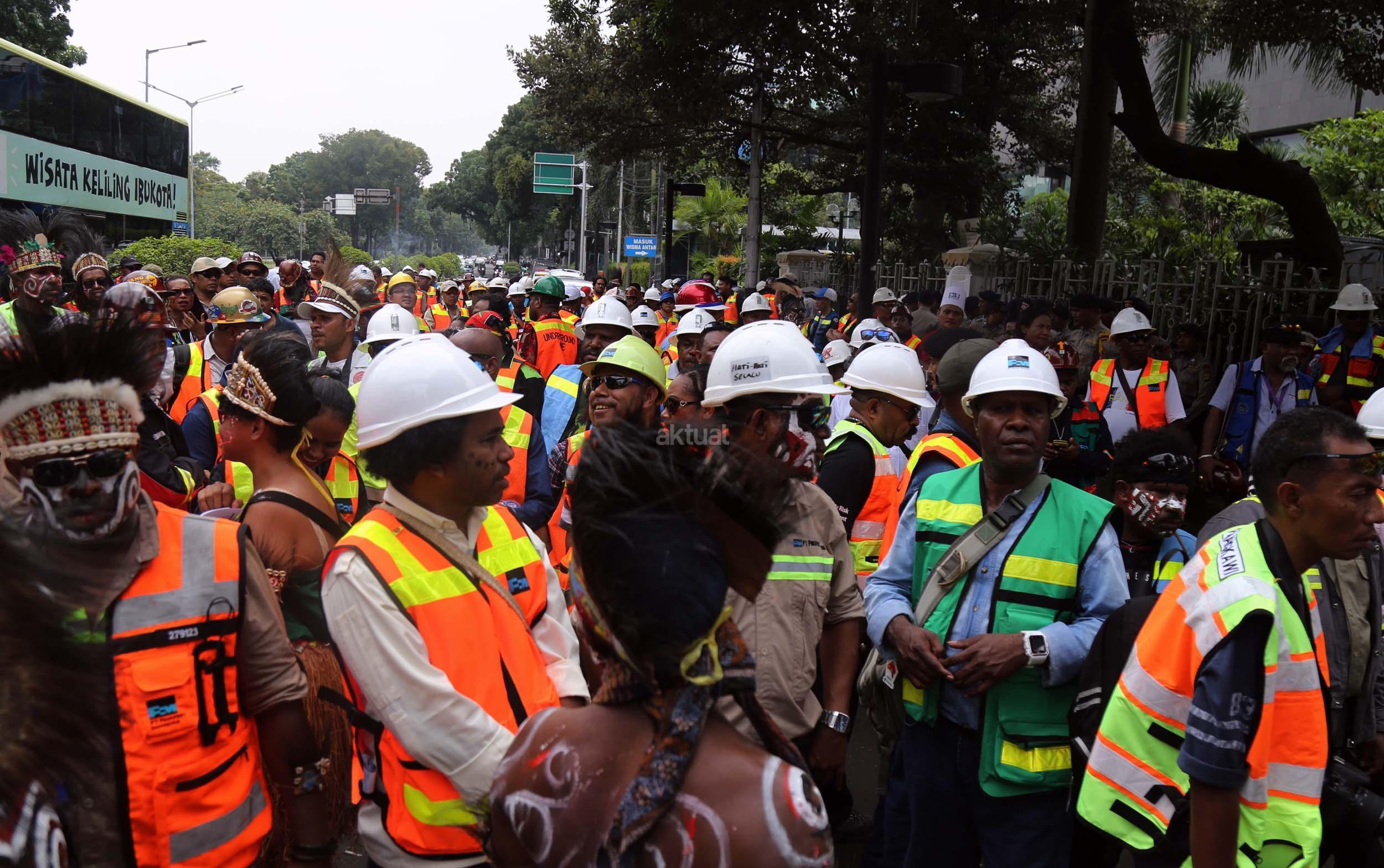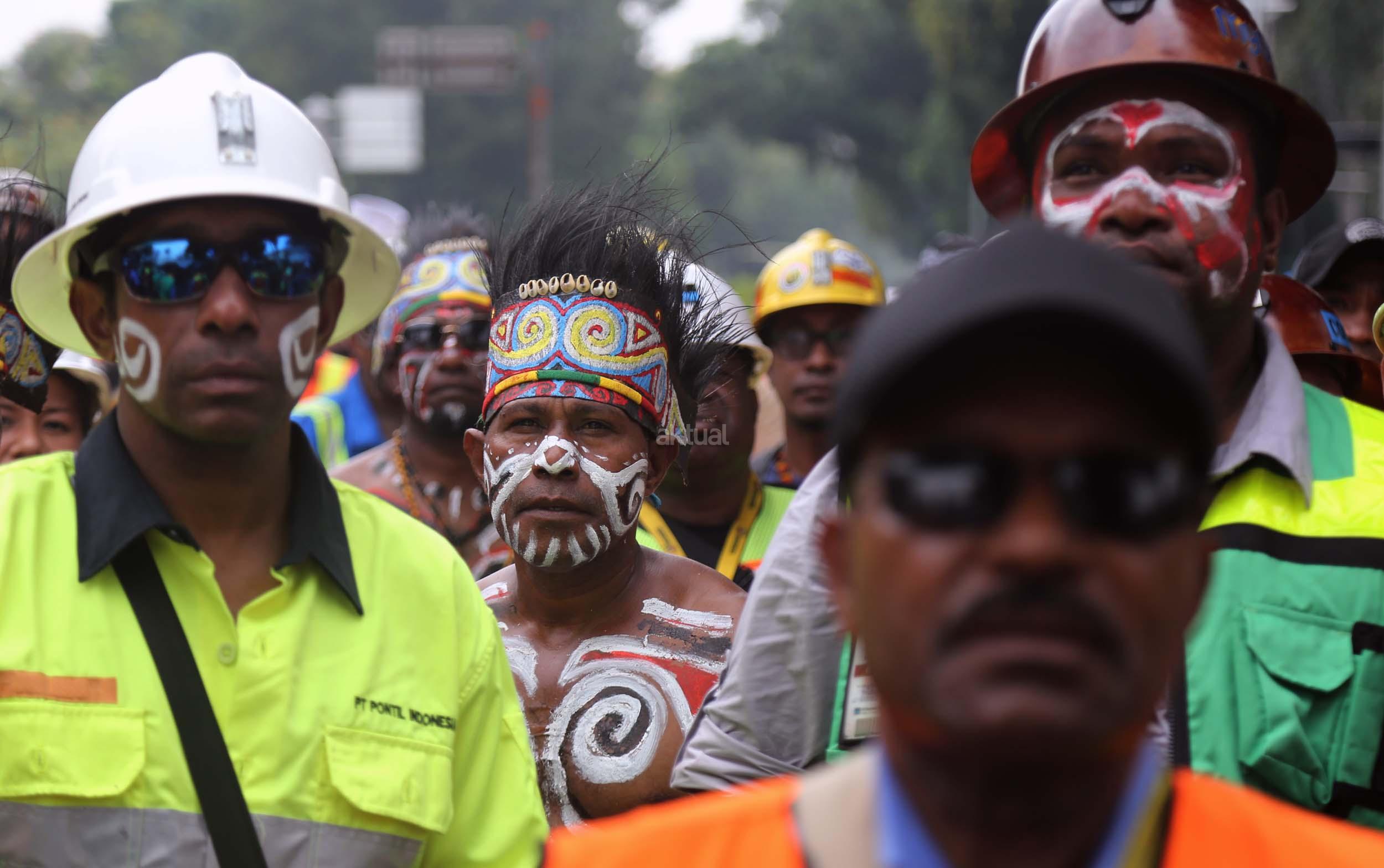 Dalam aksinya ratusan karyawan PT Freeport Indonesia (FI) menuntut pemerintah agar tidak memaksakan perubahan Kontrak Karya (KK) ke Izin Usaha Khusus Pertambangan (IUPK). Sebagian besar karyawan FPI mengenakan seragam tambang, sebagian lagi mengenakan pakaian adat khas Papua. AKTUAL/Munzir
