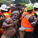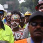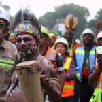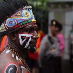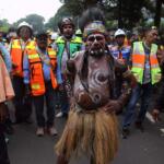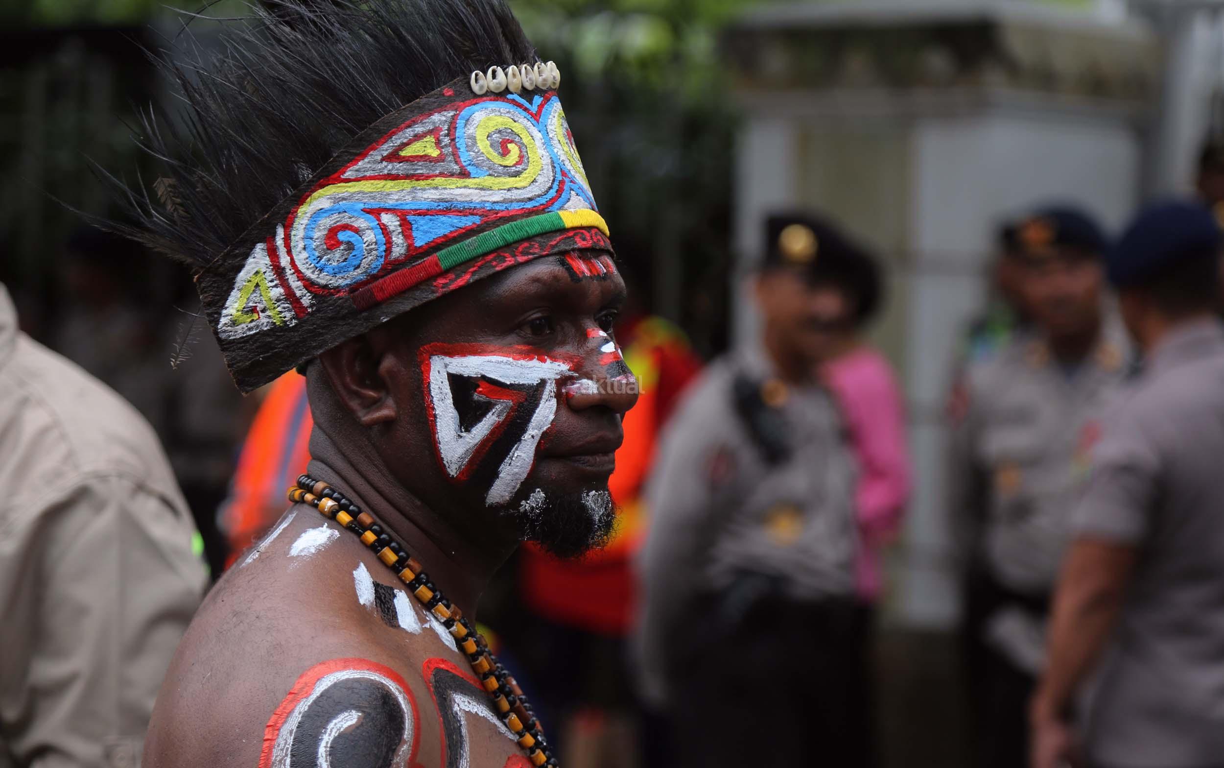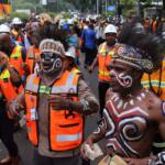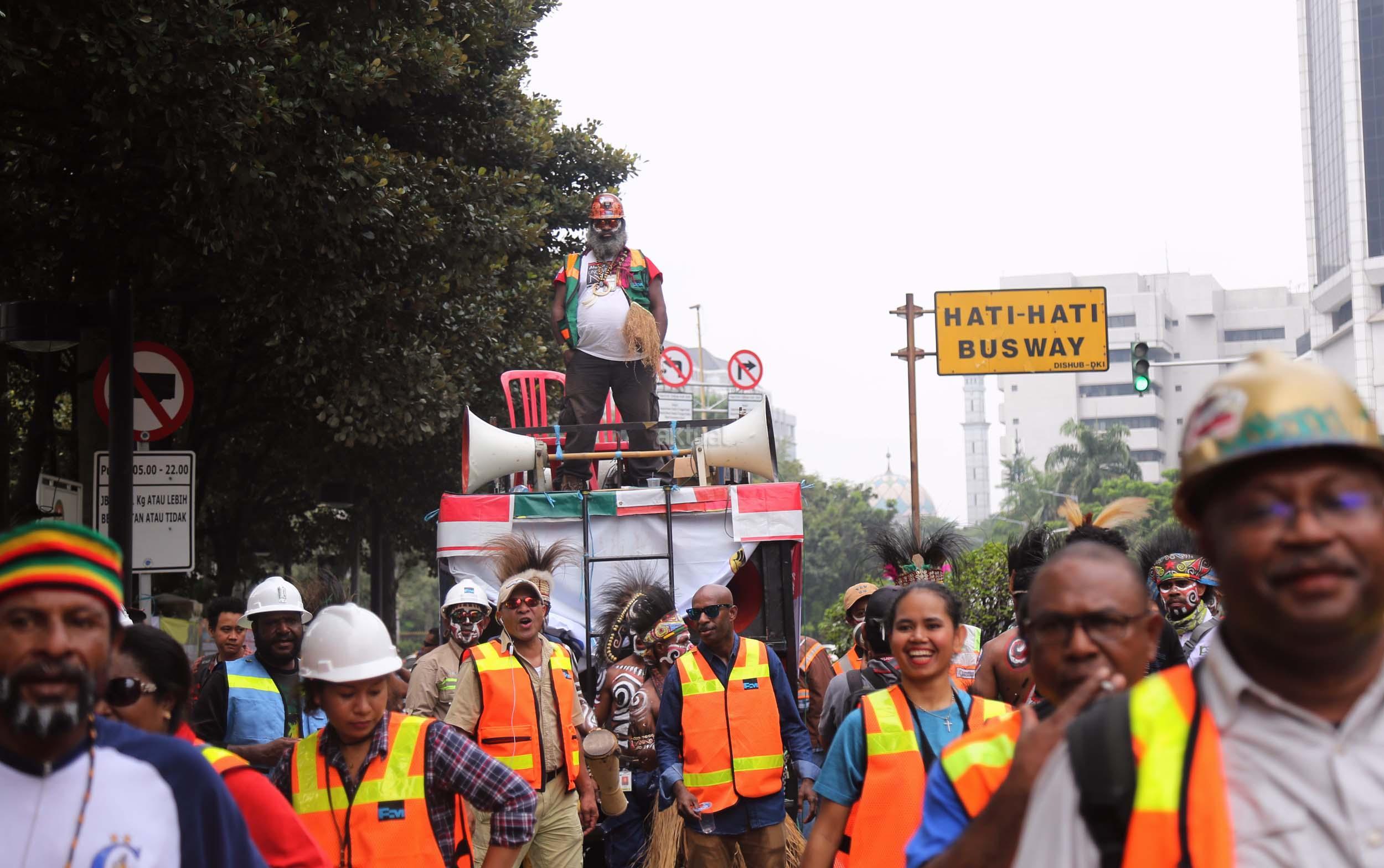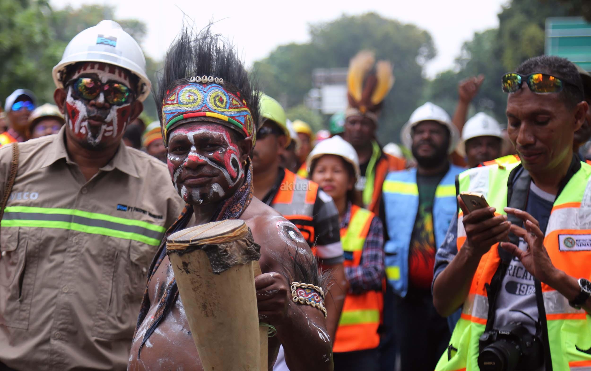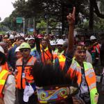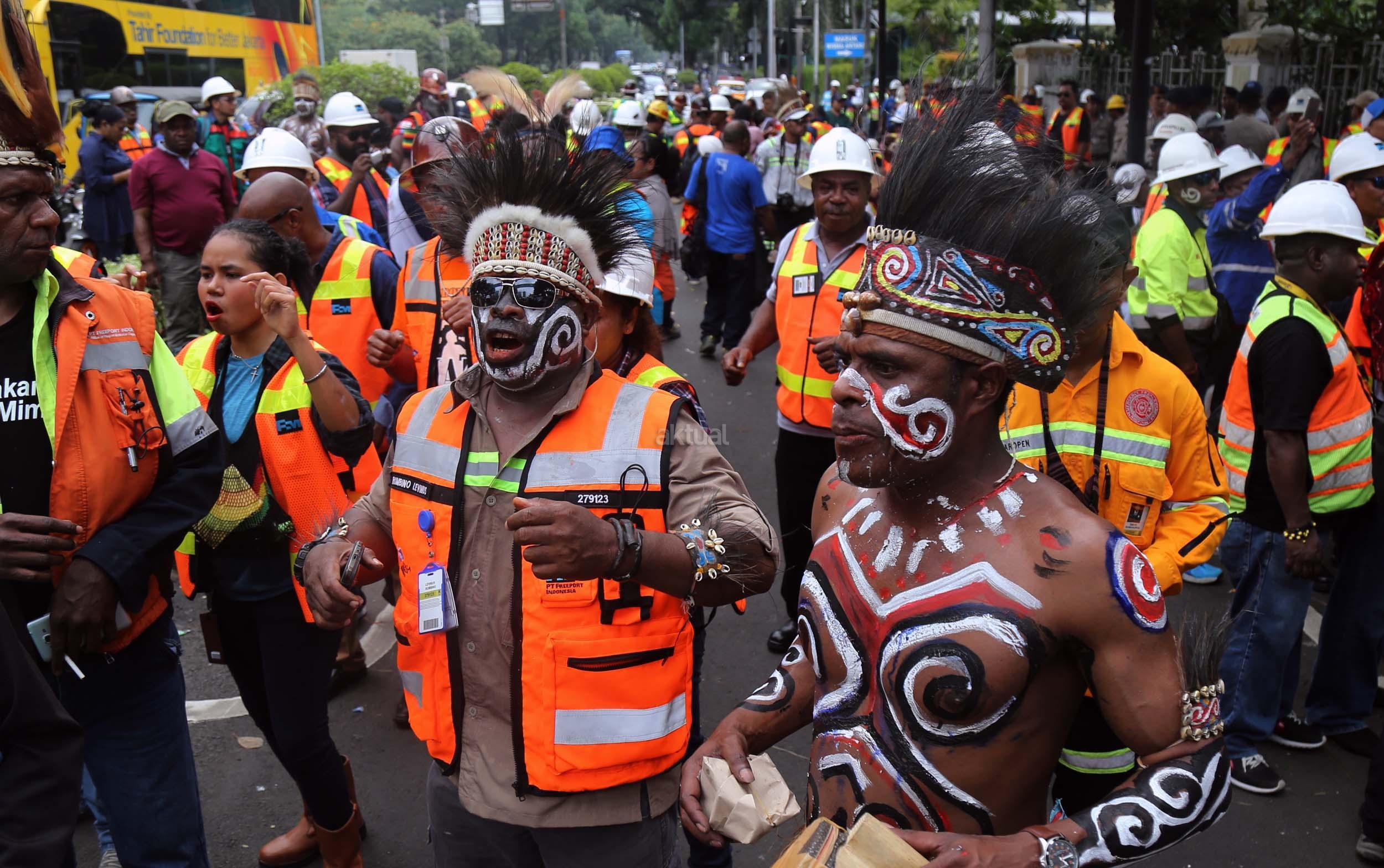 Dalam aksinya ratusan karyawan PT Freeport Indonesia (FI) menuntut pemerintah agar tidak memaksakan perubahan Kontrak Karya (KK) ke Izin Usaha Khusus Pertambangan (IUPK). Sebagian besar karyawan FPI mengenakan seragam tambang, sebagian lagi mengenakan pakaian adat khas Papua. AKTUAL/Munzir