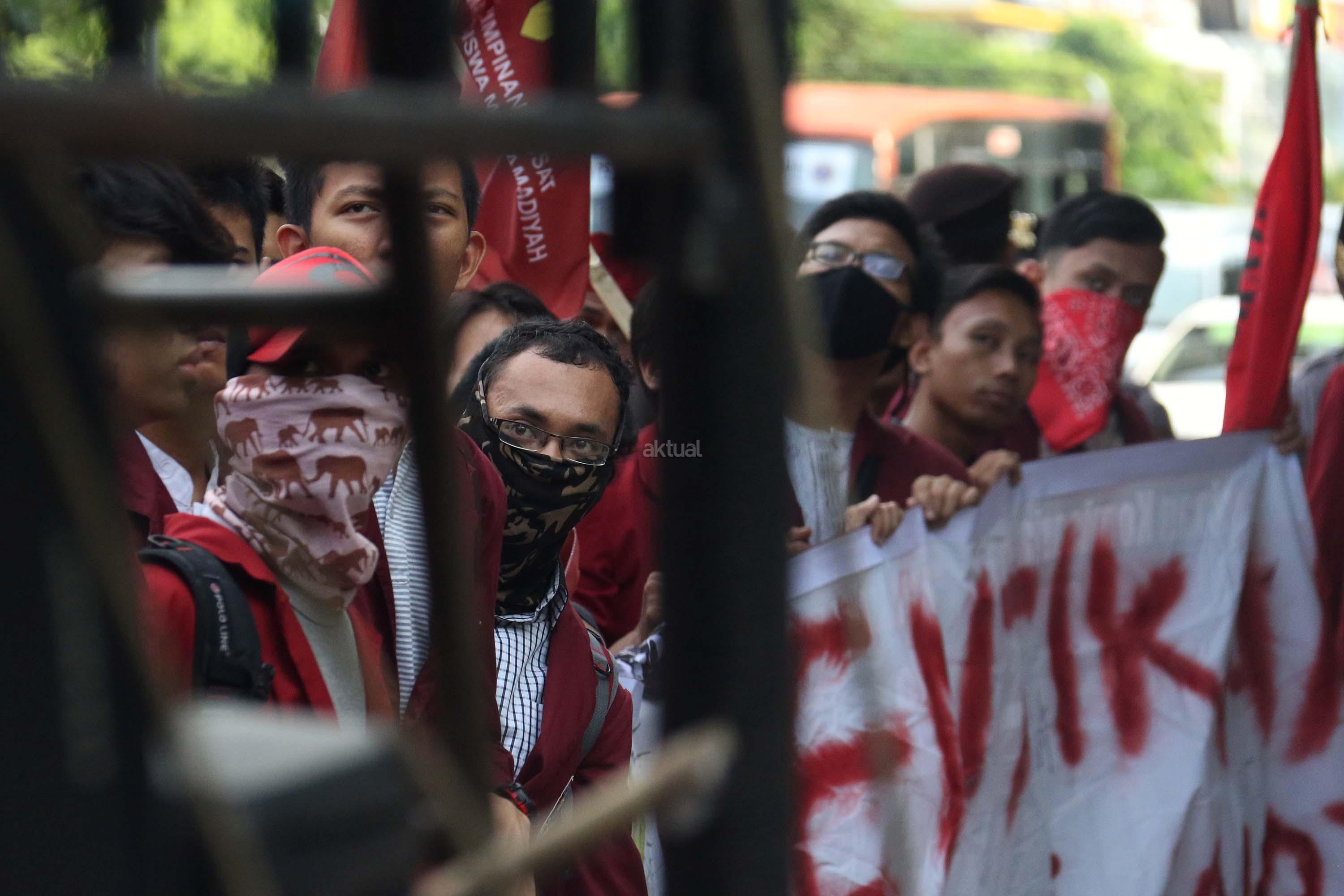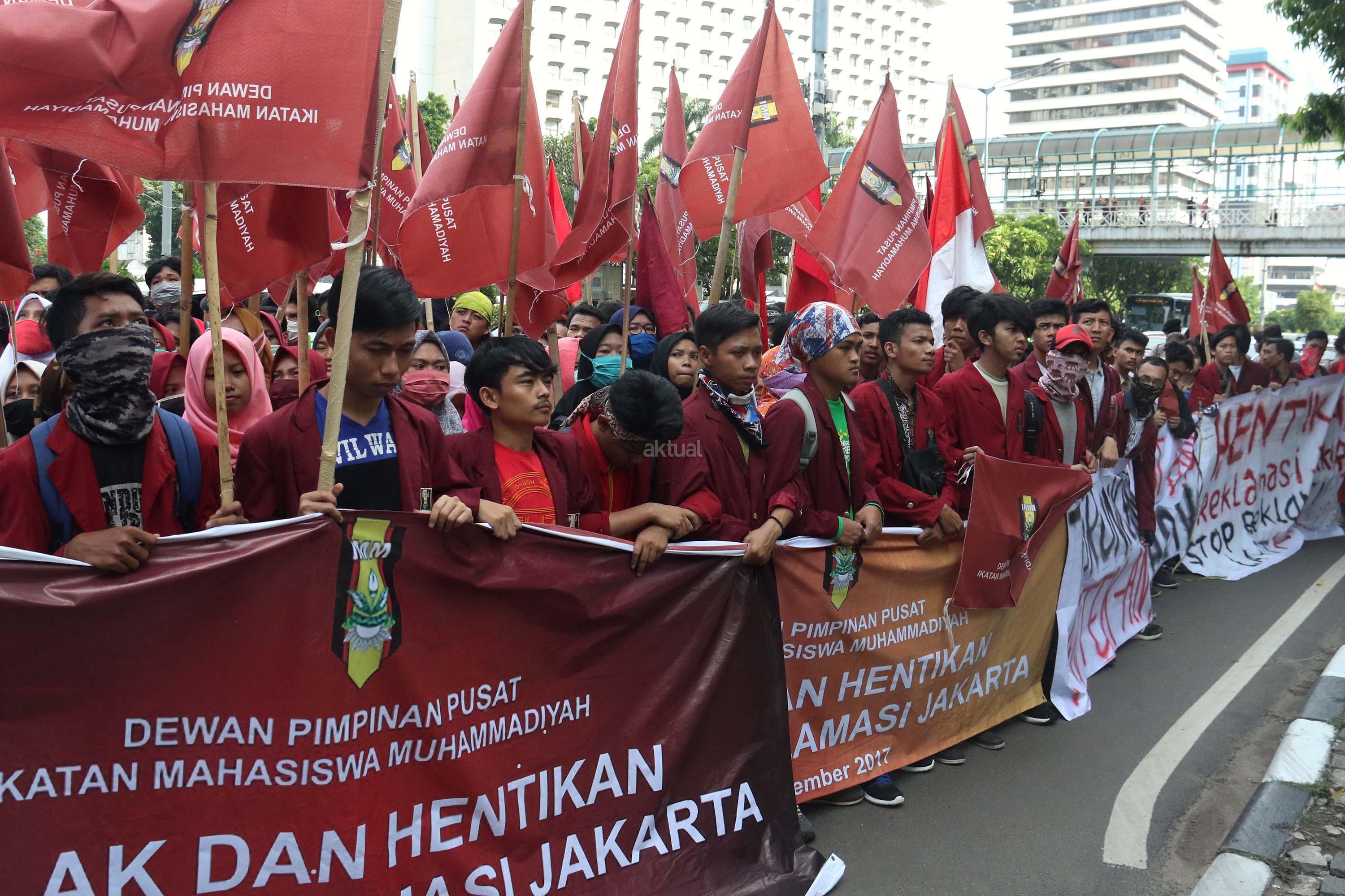Ratusan mahasiswa yang tergabung dalam Ikatan Mahasiswa Muhammadiyah (IMM) melakukan aksi didepan kantor Menko Maritim, Jakarta, Jumat (10/11/2017). Dalam aksinya para mahasiswa IMM mendesak agar segera menghentikan Reklamasi Teluk Jakarta dan mendesak Menko Maritim Luhut Binsar Panjaitan untuk turun dari jabatannya. AKTUAL/Munzir