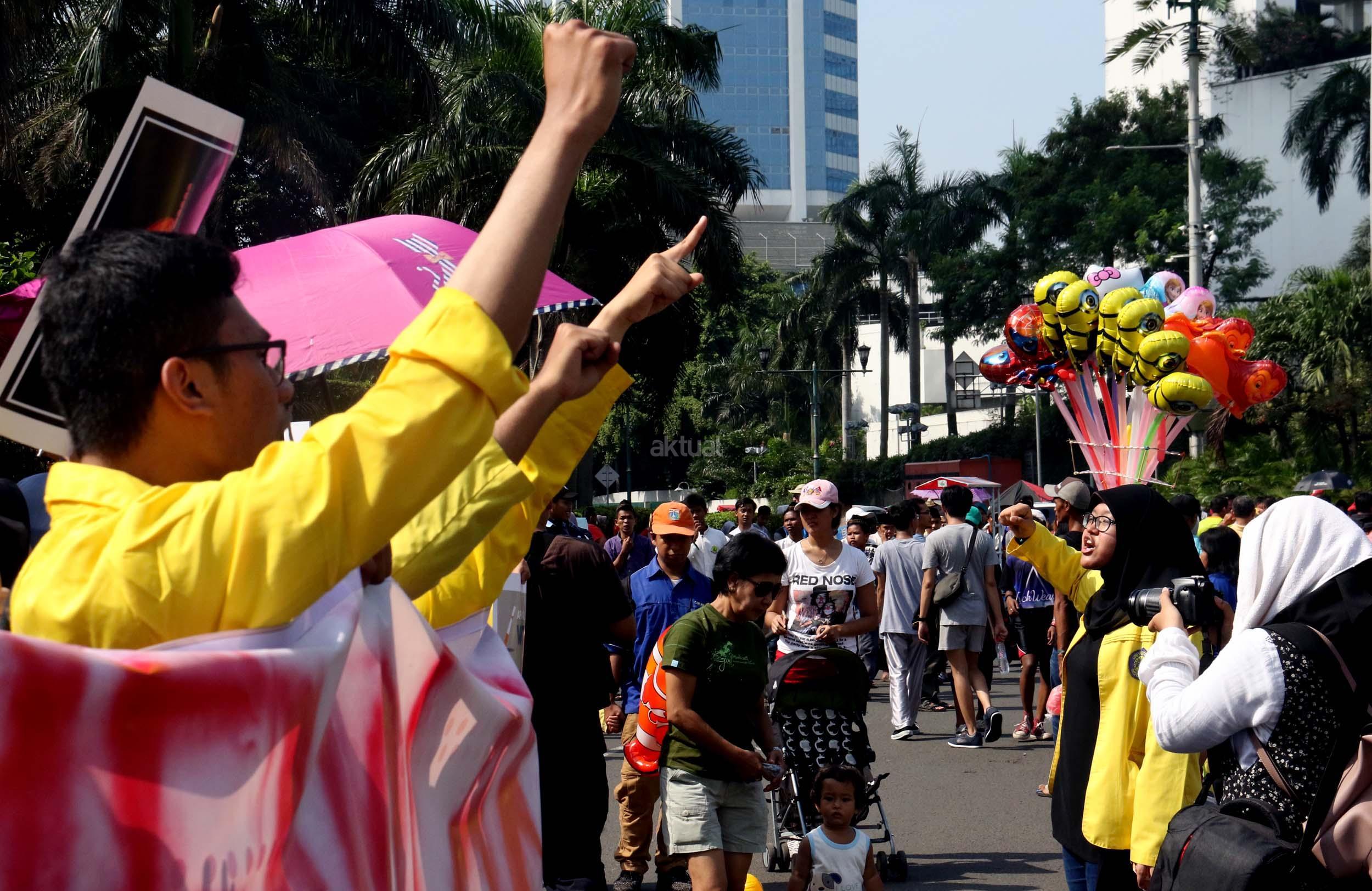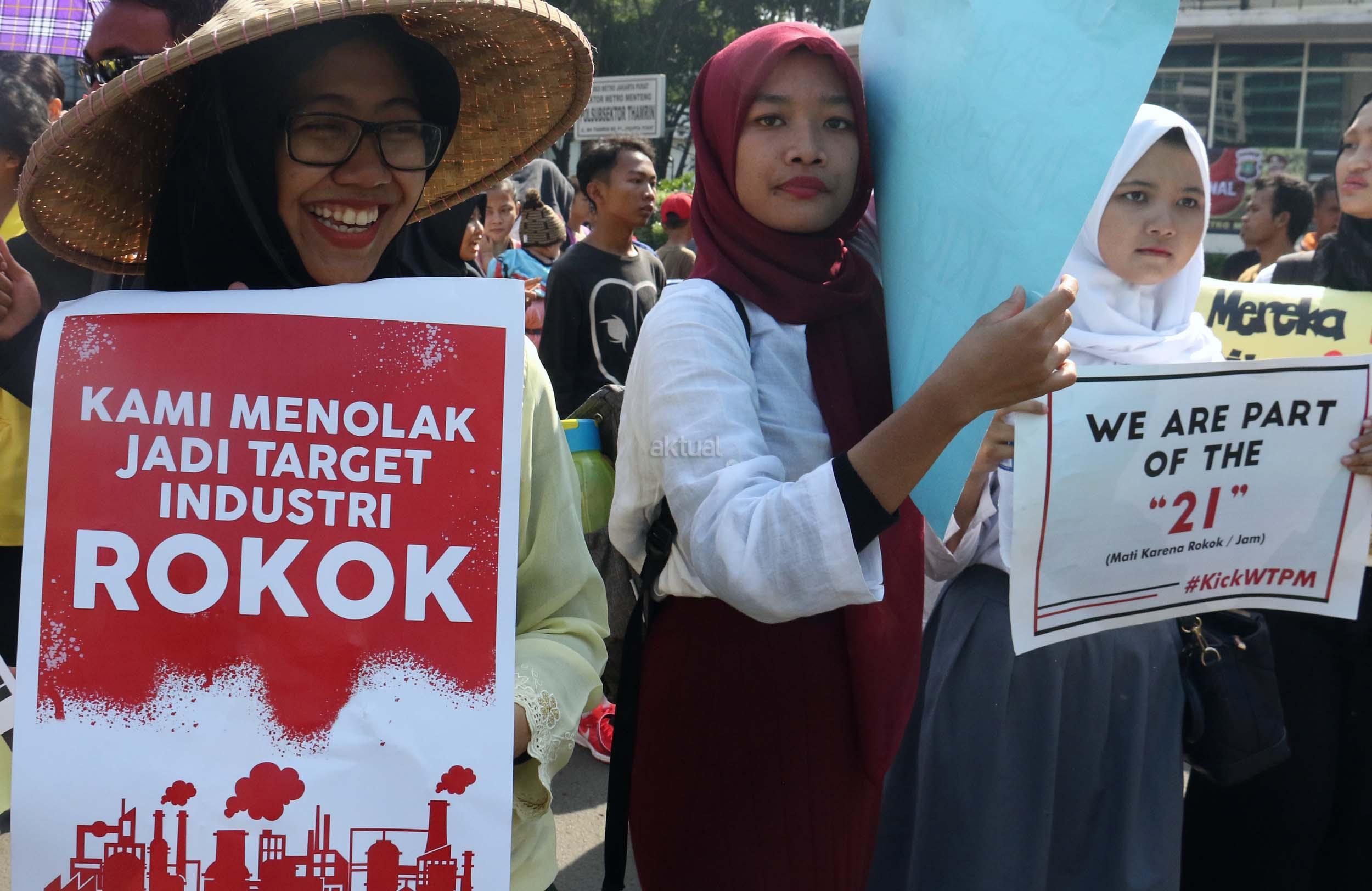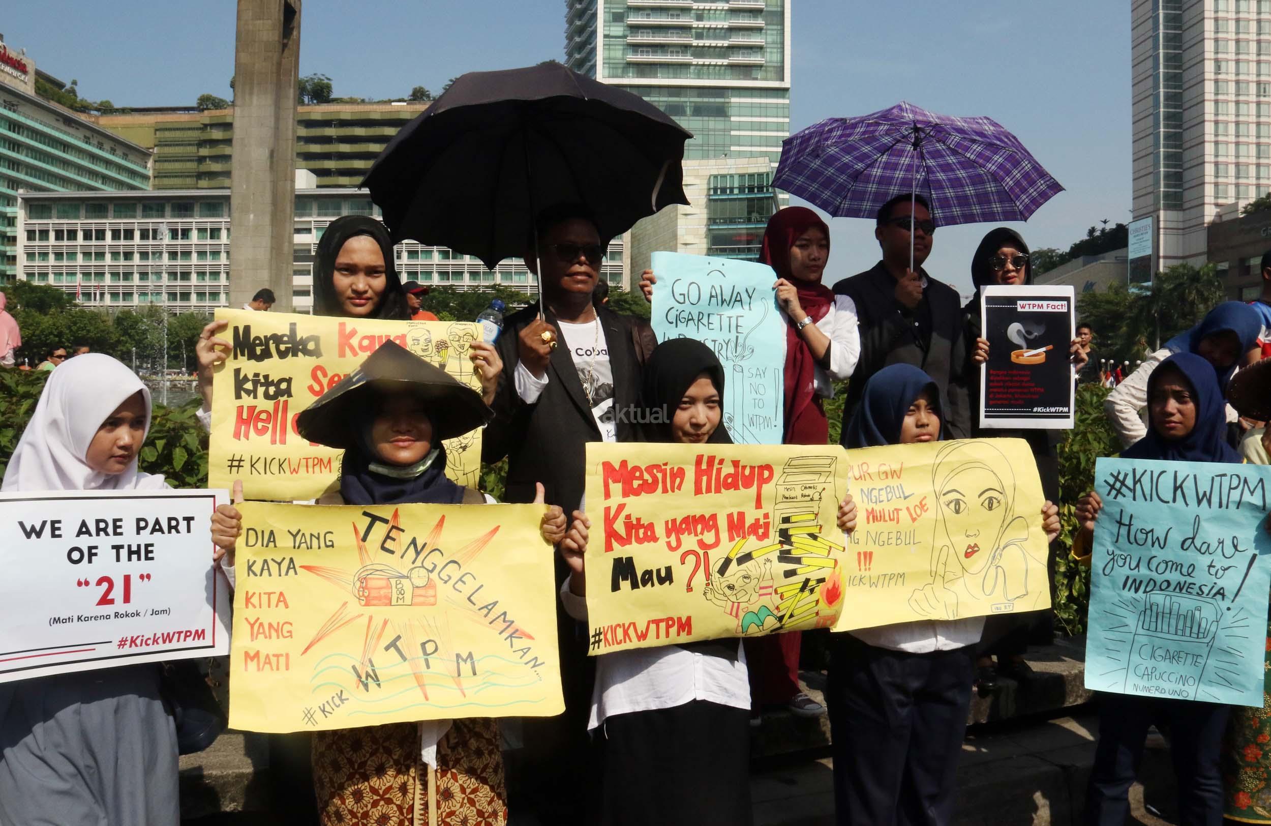 Sejumlah mahasiswa dari berbagai kampus yang tergbung dalam Aliansi Mahasiswa Kesehatan Masyarakat (AMKM) melakukan aksi unjuk rasa di kawasan CFD, Bunderan HI, Jakarta, Minggu (30/4/2017). Dalam aksinya para mahasiswa menolak penyelenggaraan WTPM (World Tobacco Process and Machinery) di Indonesia dan penyelenggaraan WTPM (World Tobacco Process and Machinery) 2017 di Indonesia merupakan bentuk penjajahan modern di Indonesia. AKTUAL/Munzir