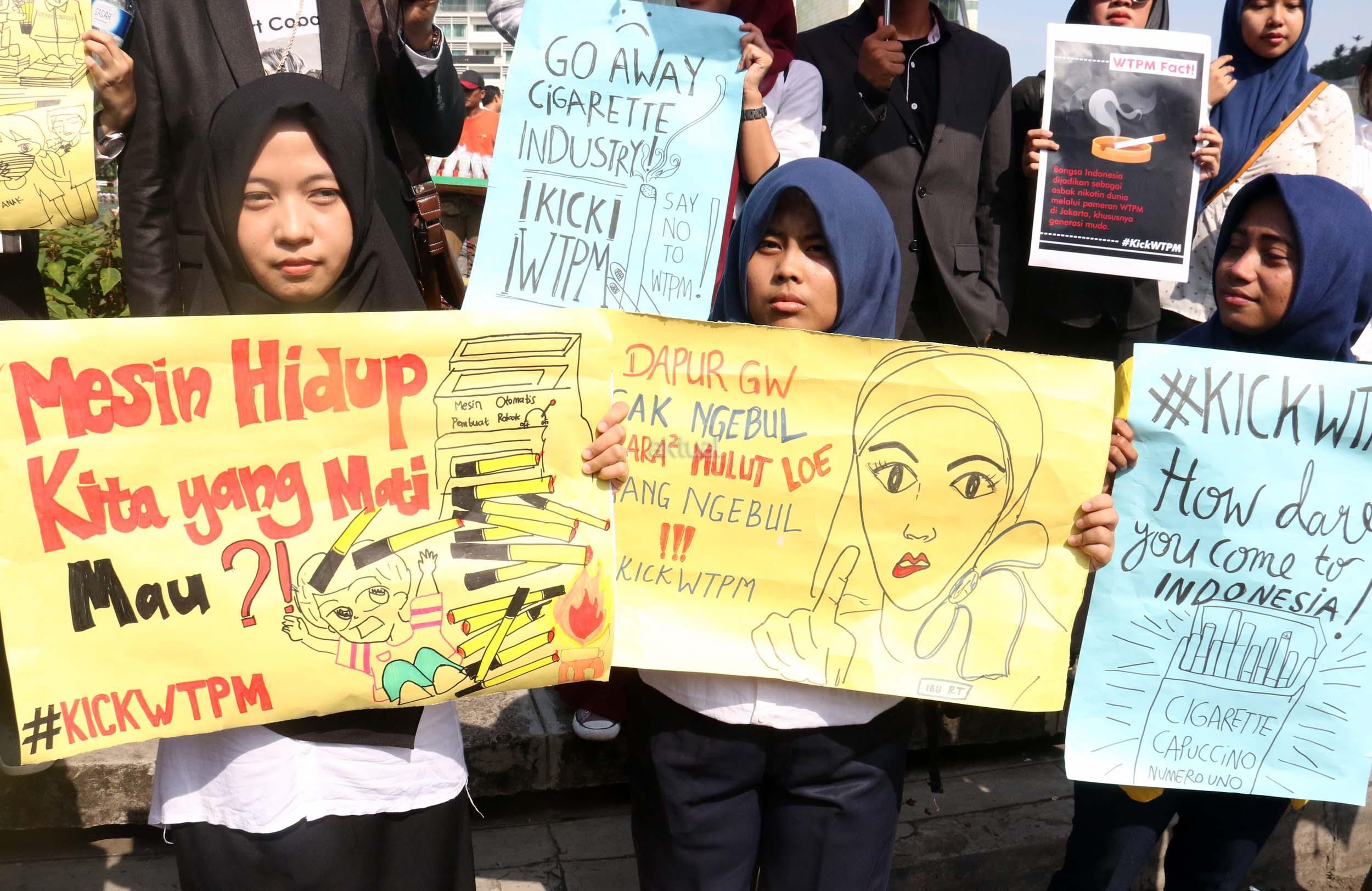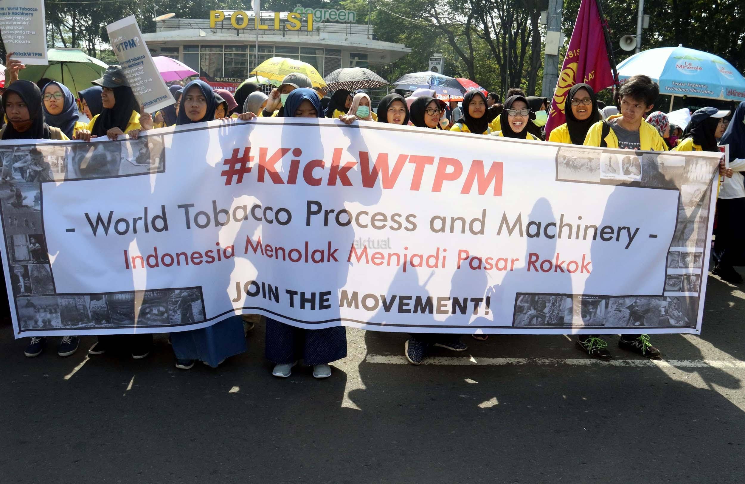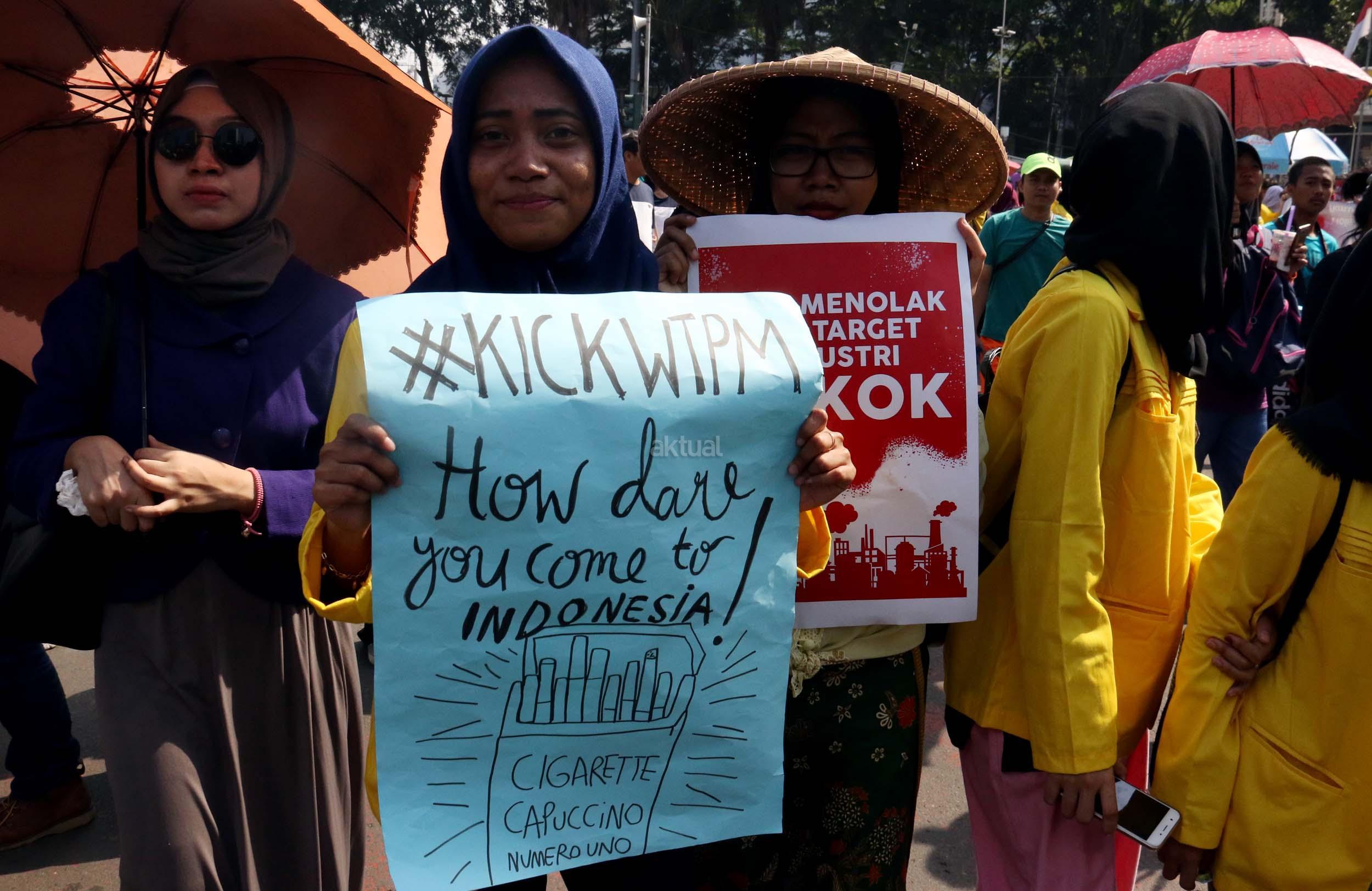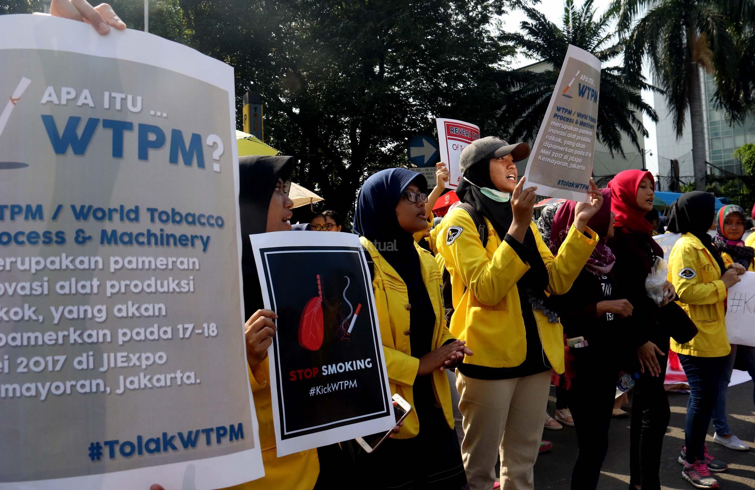 Dalam aksinya para mahasiswa menolak penyelenggaraan WTPM (World Tobacco Process and Machinery) di Indonesia dan penyelenggaraan WTPM (World Tobacco Process and Machinery) 2017 di Indonesia merupakan bentuk penjajahan modern di Indonesia. AKTUAL/Munzir