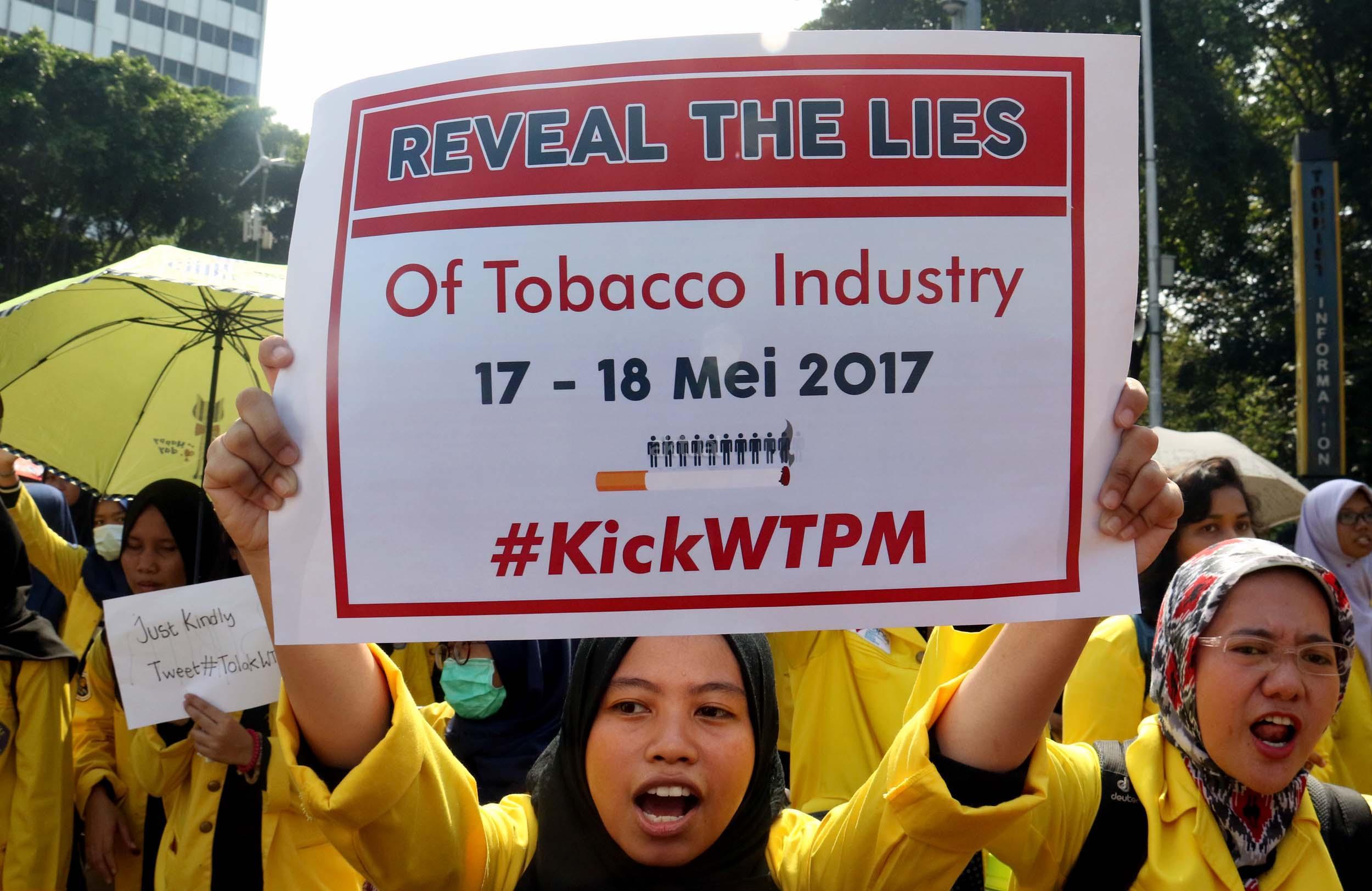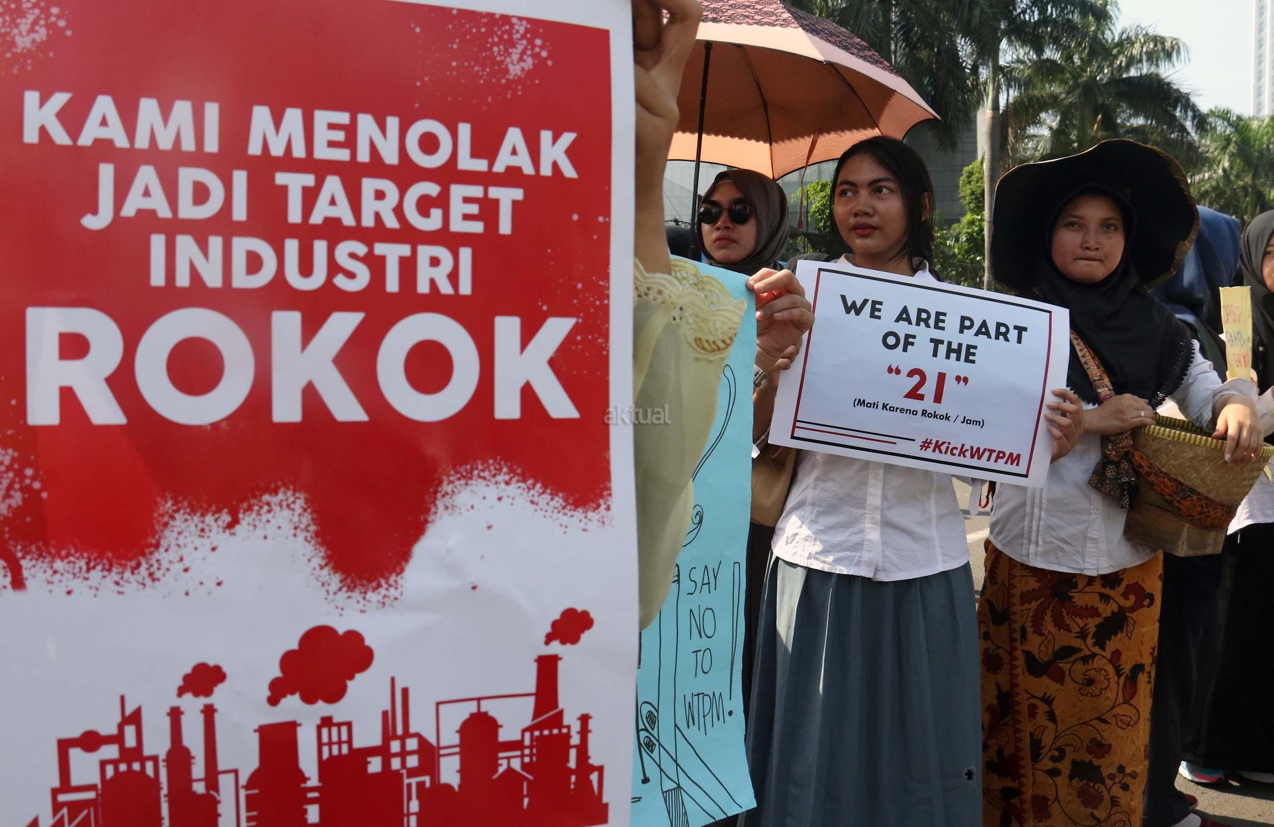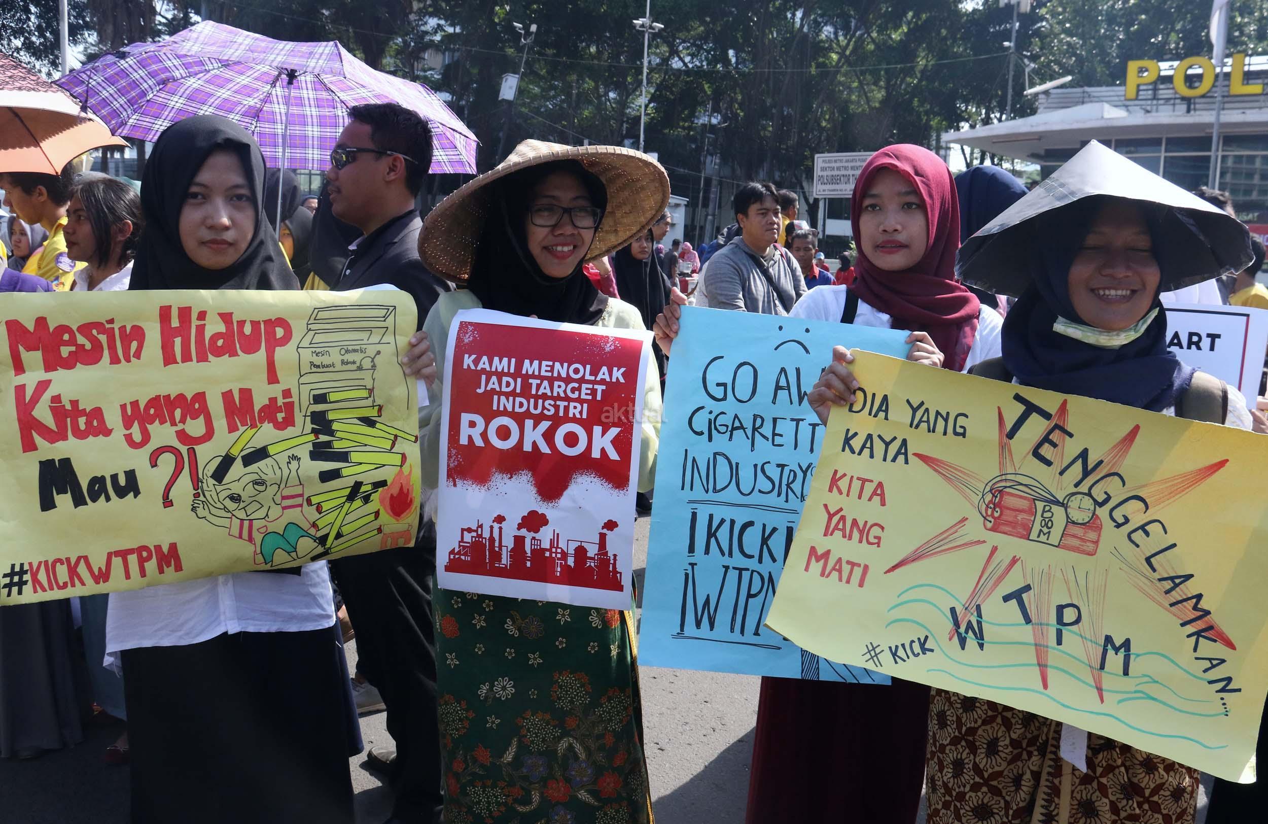 Dalam aksinya para mahasiswa menolak penyelenggaraan WTPM (World Tobacco Process and Machinery) di Indonesia dan penyelenggaraan WTPM (World Tobacco Process and Machinery) 2017 di Indonesia merupakan bentuk penjajahan modern di Indonesia. AKTUAL/Munzir