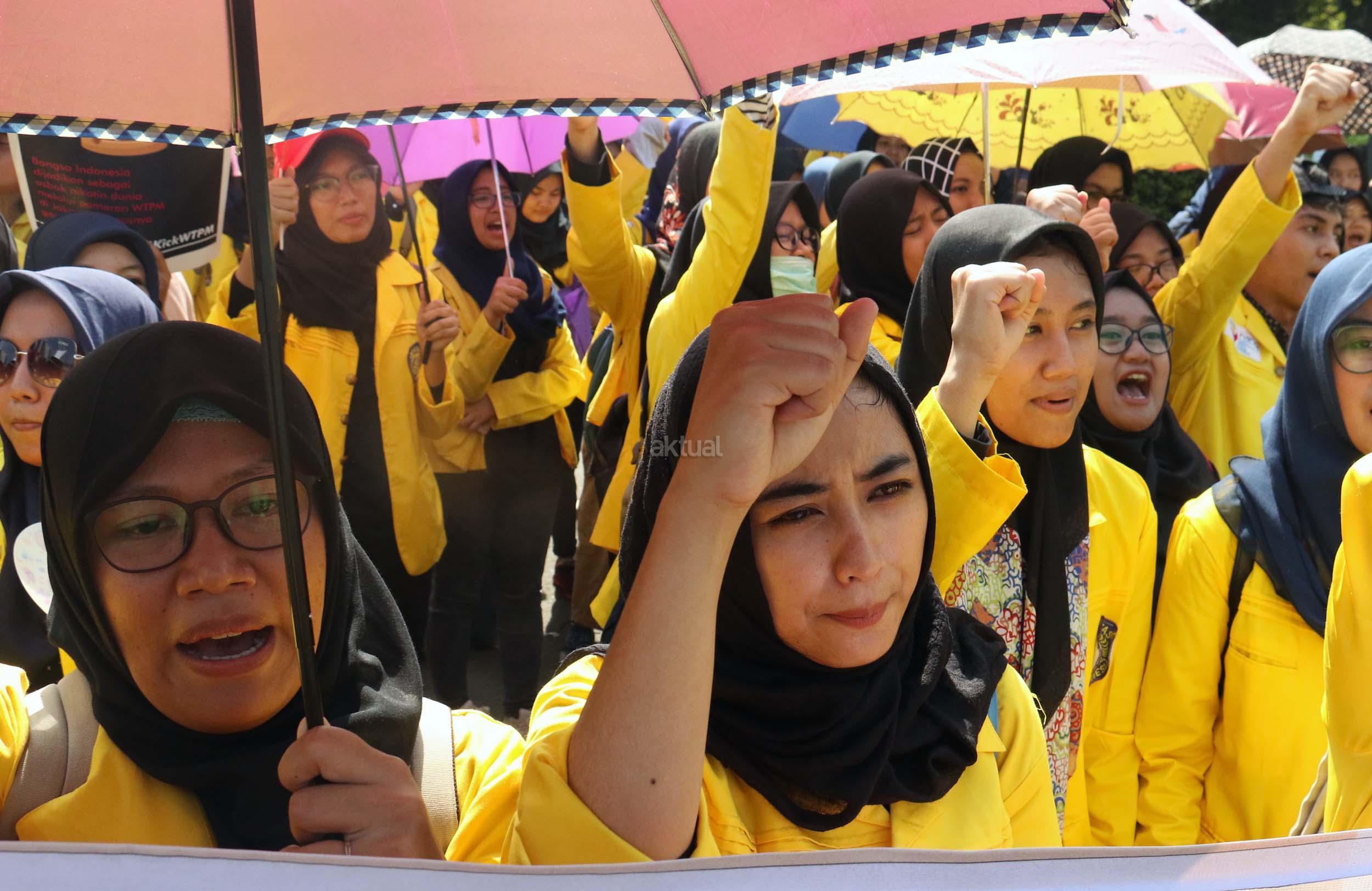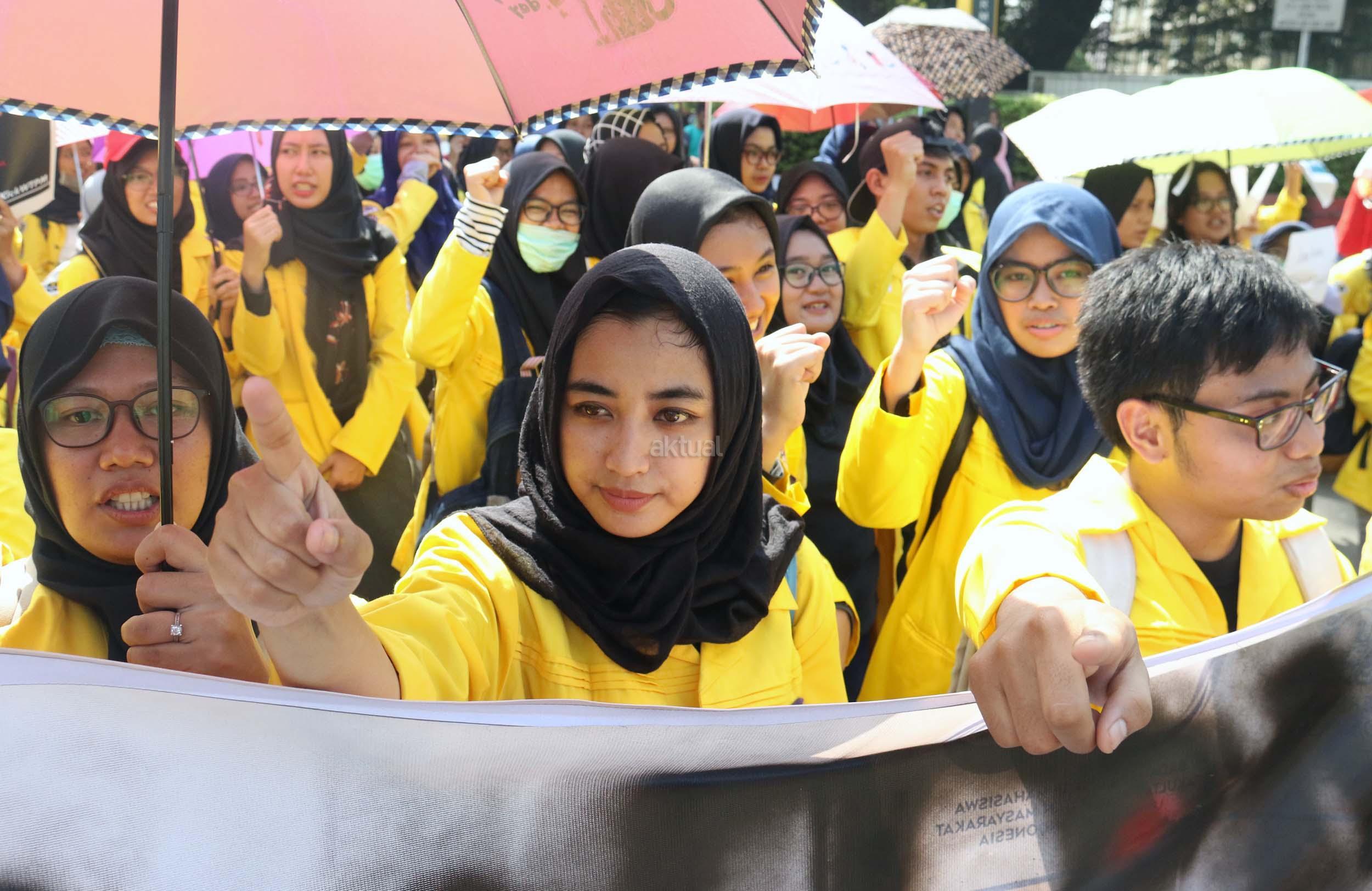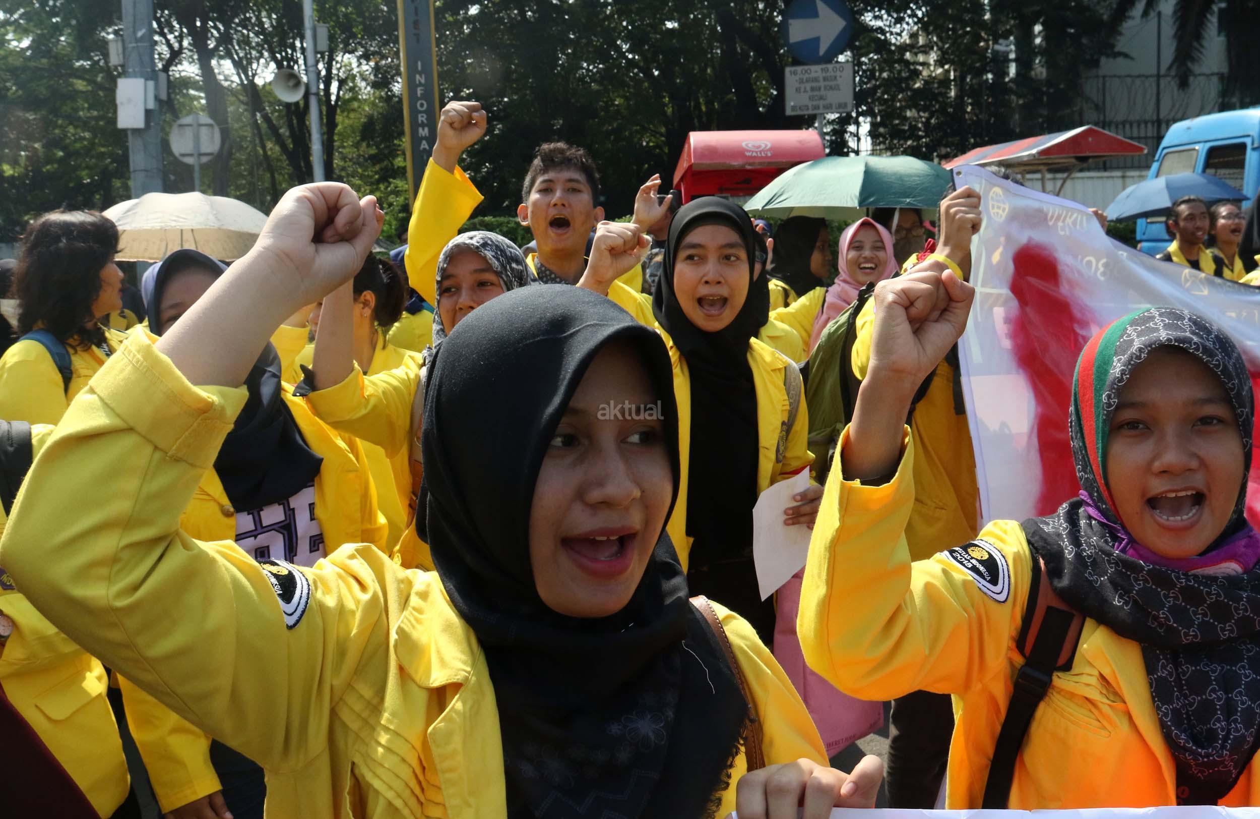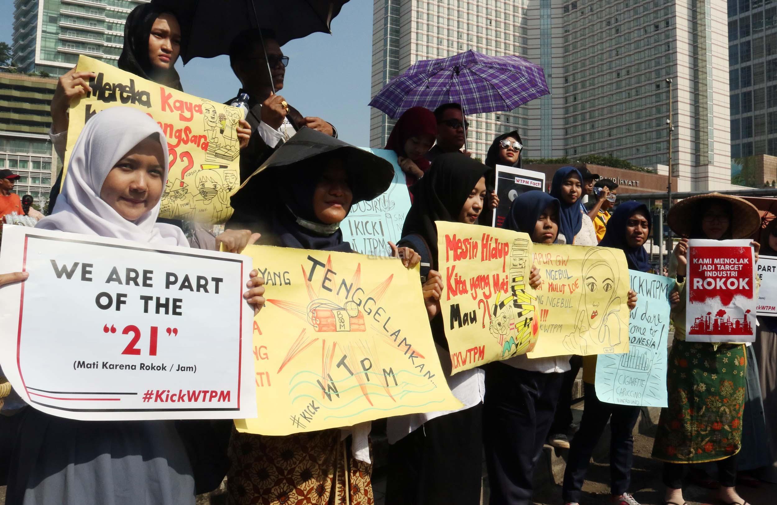 Dalam aksinya para mahasiswa menolak penyelenggaraan WTPM (World Tobacco Process and Machinery) di Indonesia dan penyelenggaraan WTPM (World Tobacco Process and Machinery) 2017 di Indonesia merupakan bentuk penjajahan modern di Indonesia. AKTUAL/Munzir