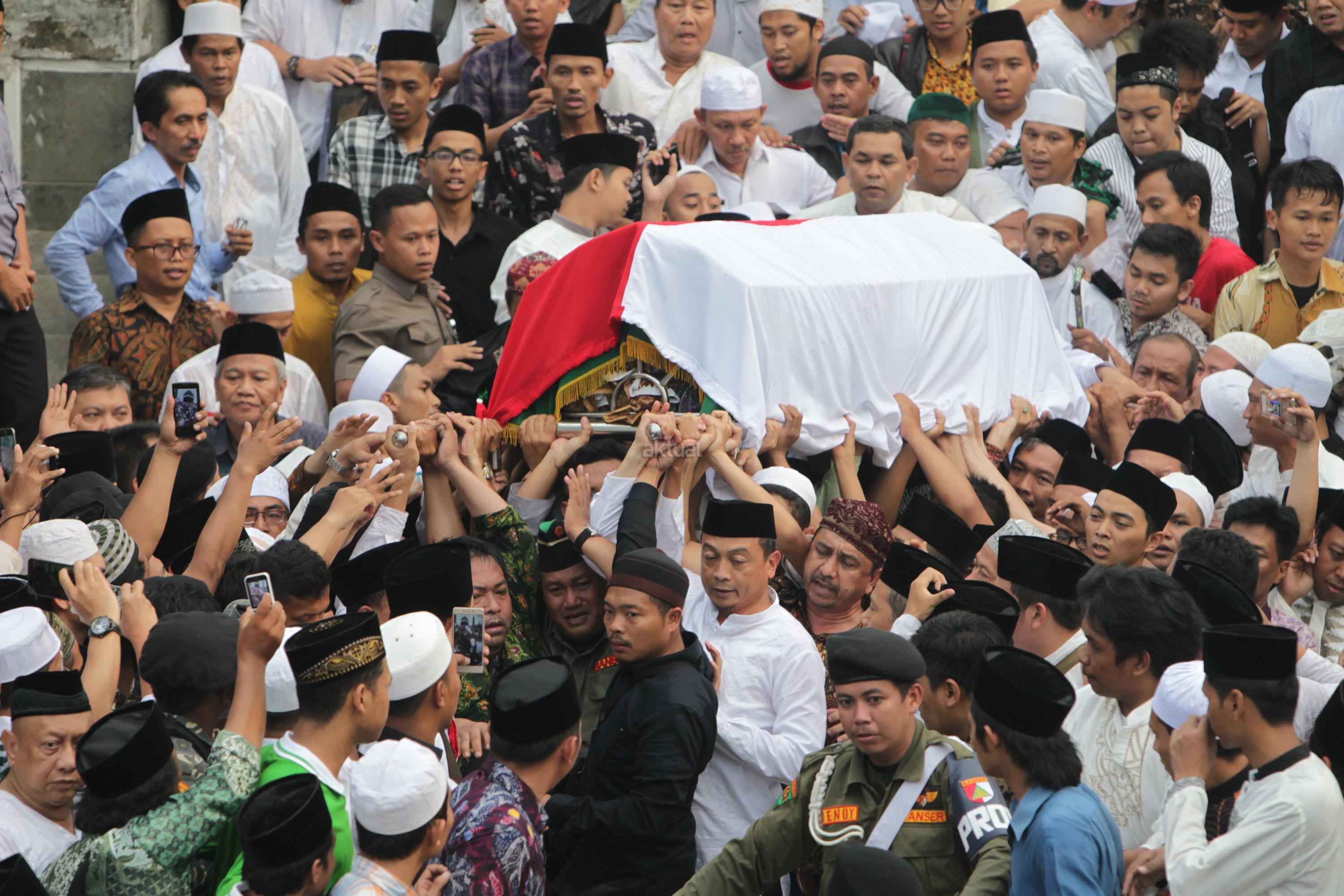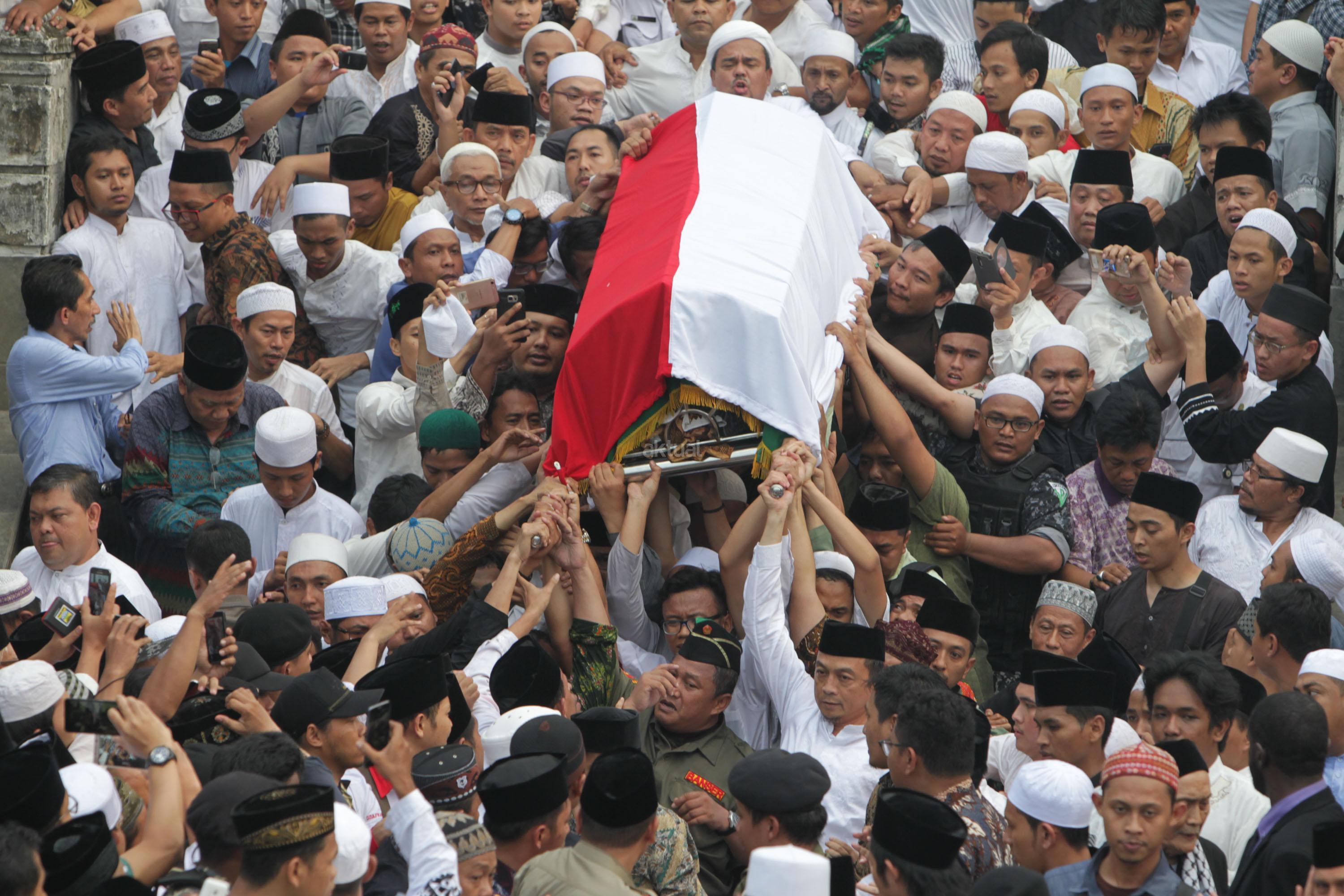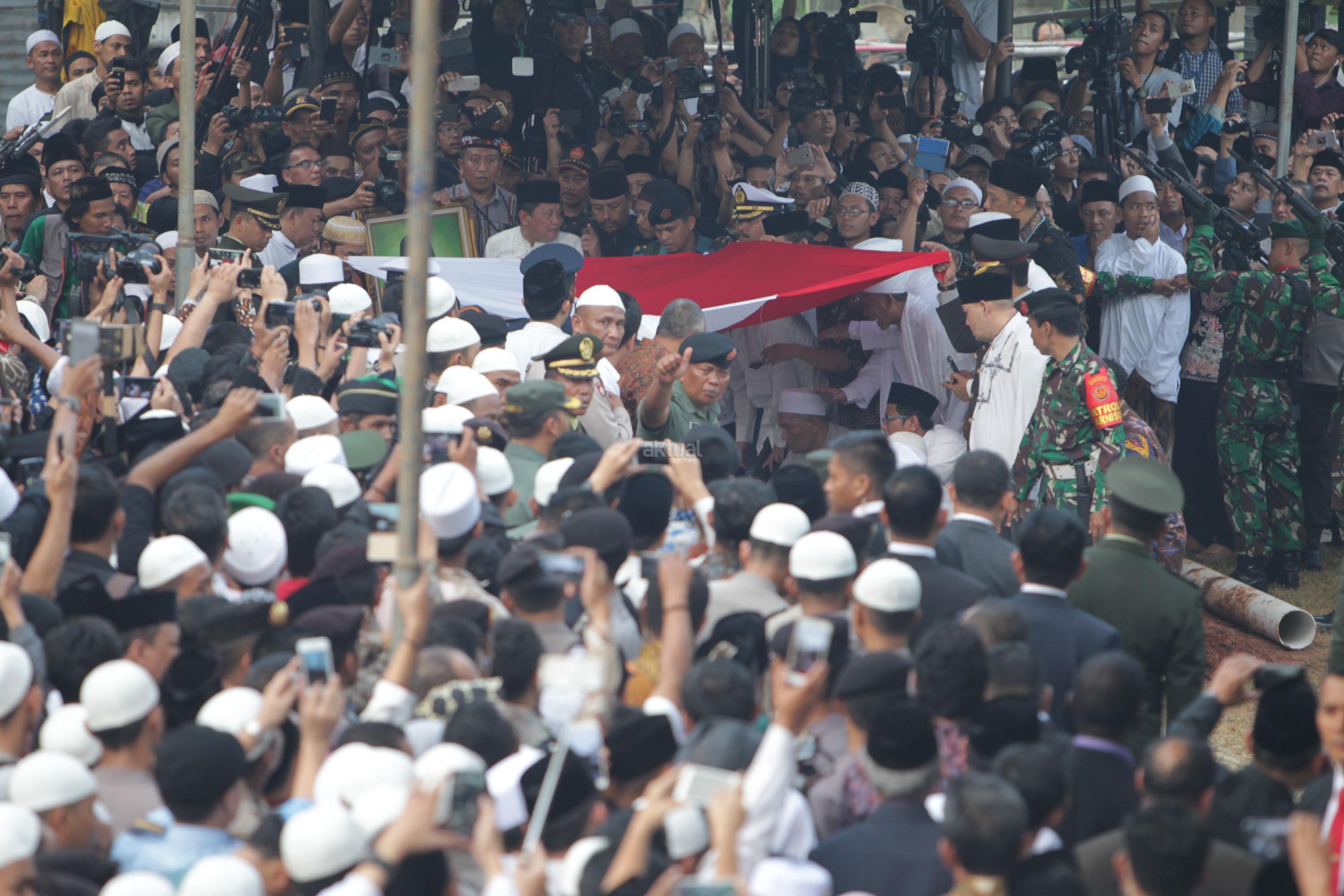 Ratusan orang mengiringi pemakaman KH Hasyim Muzadi di Pondok Pesantren Al-Hikam, Depok, Jawa Barat, Kamis (16/3). Pemakaman dipimpin langsung oleh Wakil Presiden RI Jusuf Kalla dengan upacara kenegaraan dalam pemakaman ini. KH Hasyim Muzadi menghembuskan napas terakhir di usia 72 tahun, pada Kamis, 16 Maret 2017 di Malang, Jawa Timur. AKTUAL/Tino Oktaviano