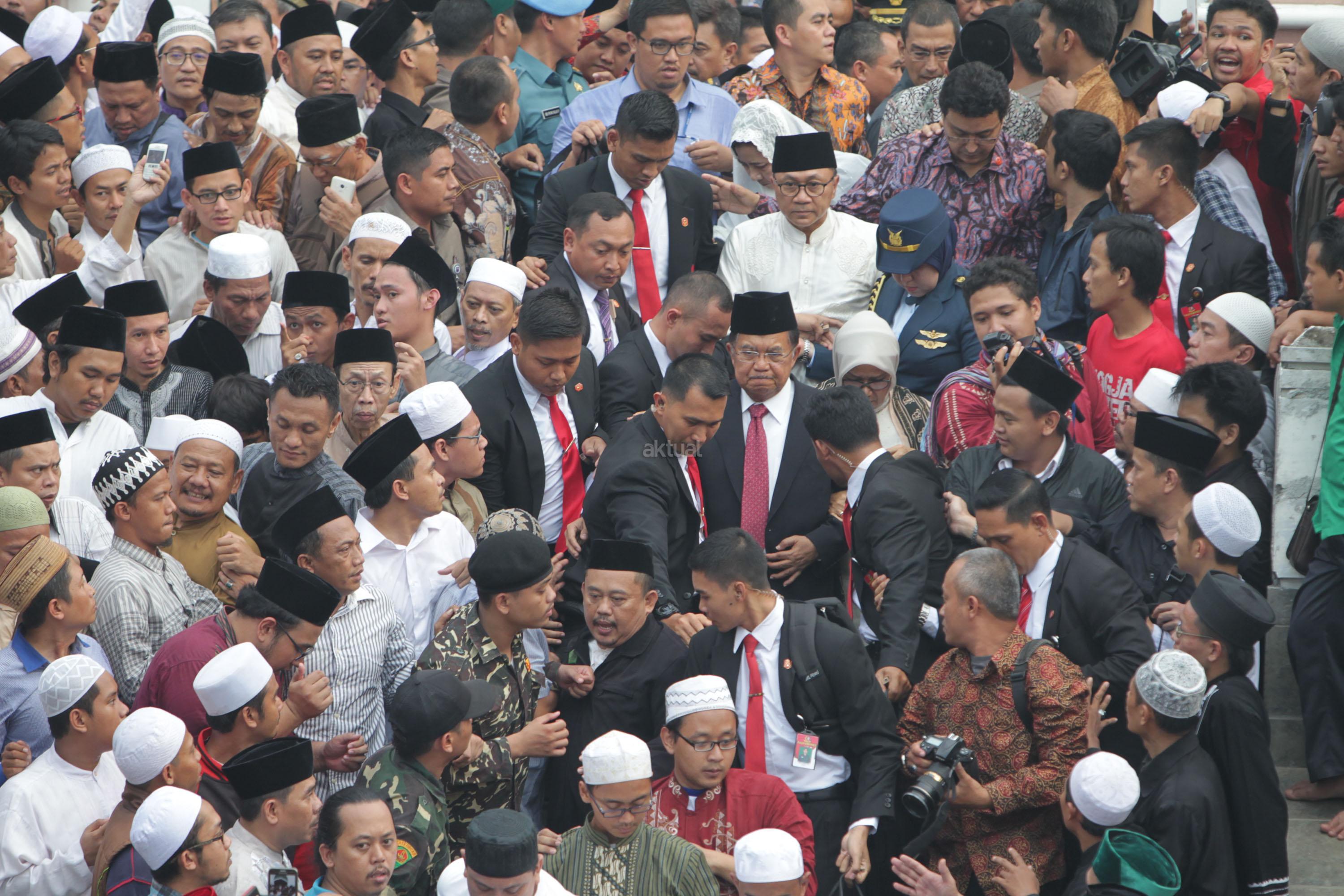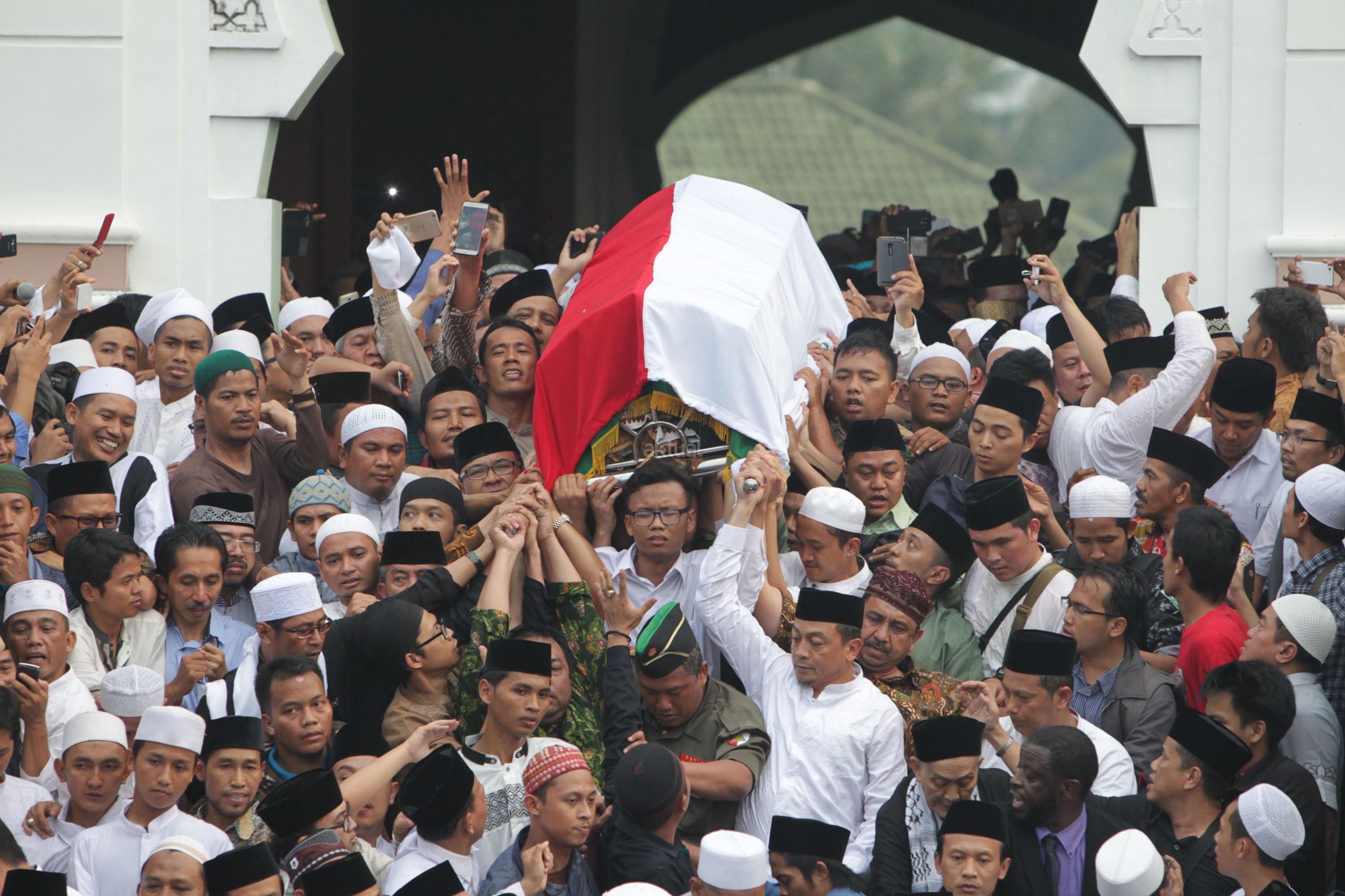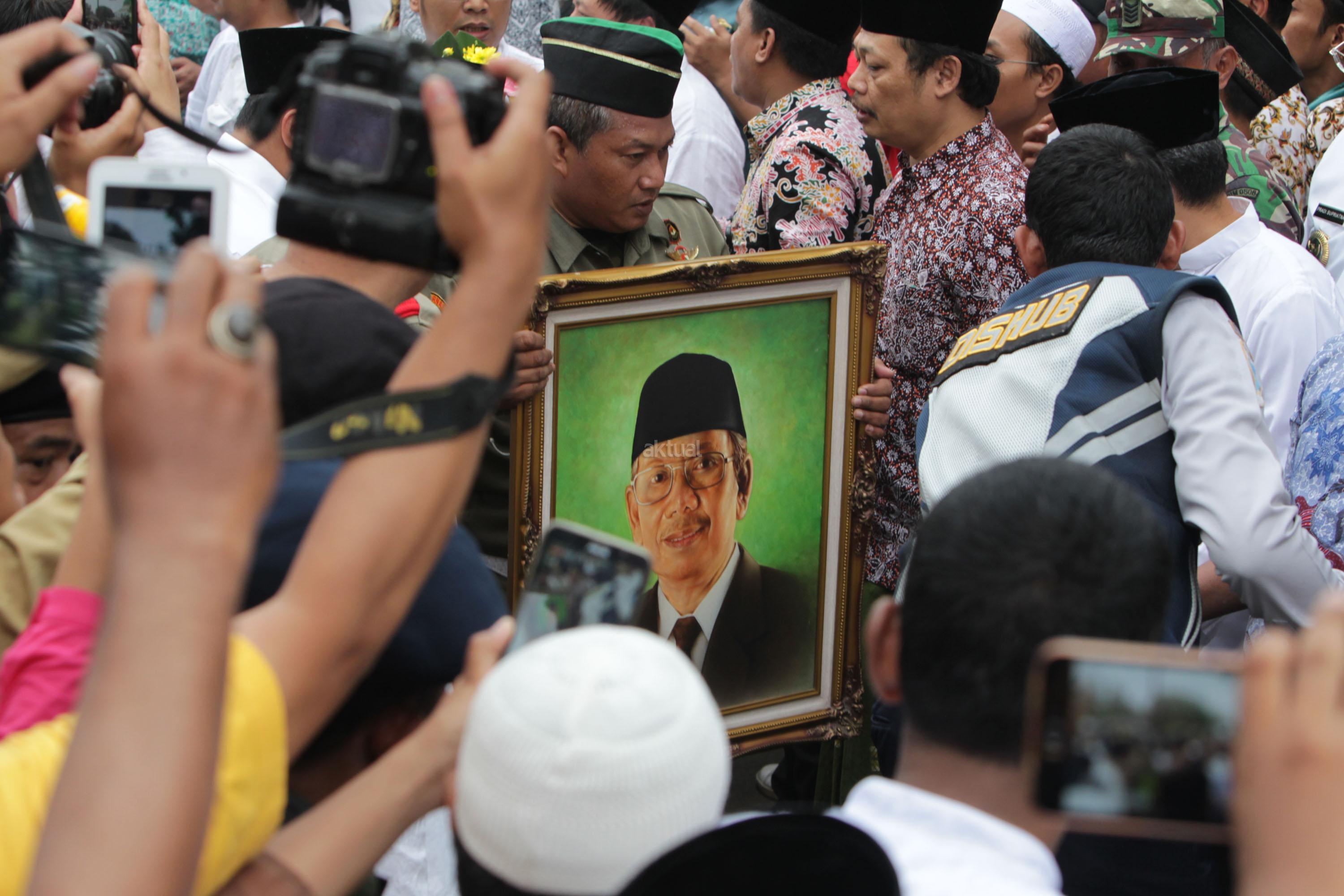 Ratusan orang mengiringi pemakaman KH Hasyim Muzadi di Pondok Pesantren Al-Hikam, Depok, Jawa Barat, Kamis (16/3). Pemakaman dipimpin langsung oleh Wakil Presiden RI Jusuf Kalla dengan upacara kenegaraan dalam pemakaman ini. KH Hasyim Muzadi menghembuskan napas terakhir di usia 72 tahun, pada Kamis, 16 Maret 2017 di Malang, Jawa Timur. AKTUAL/Tino Oktaviano