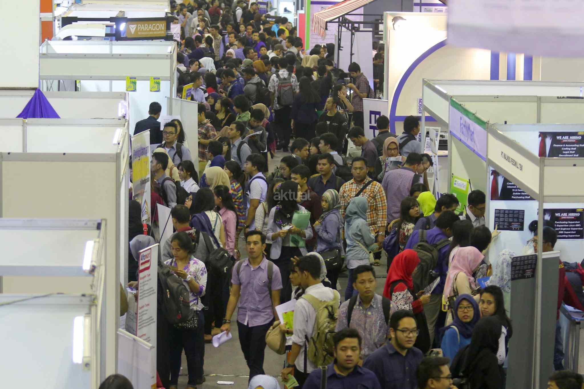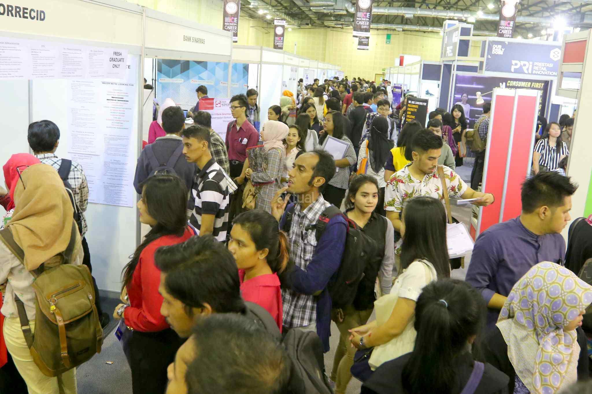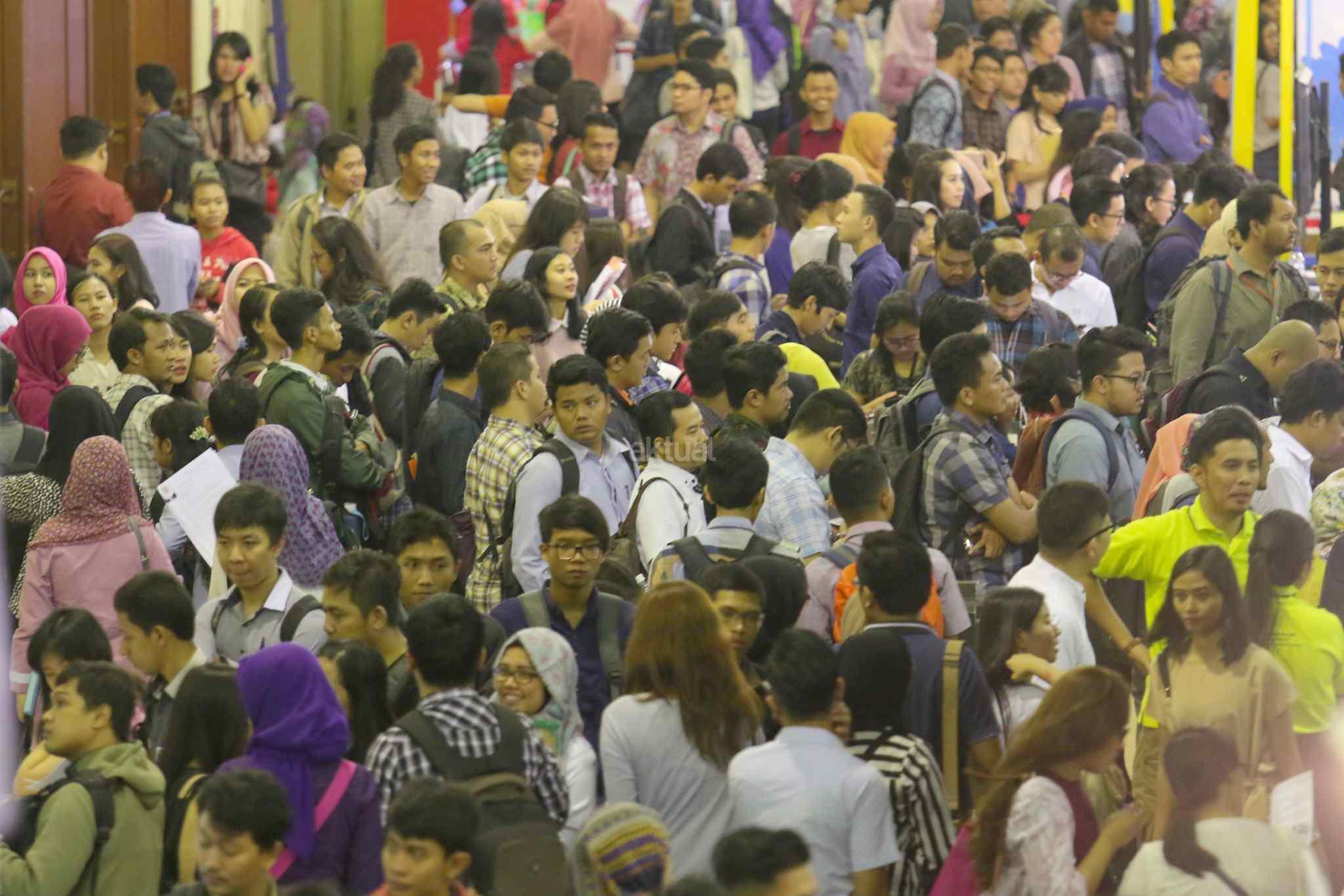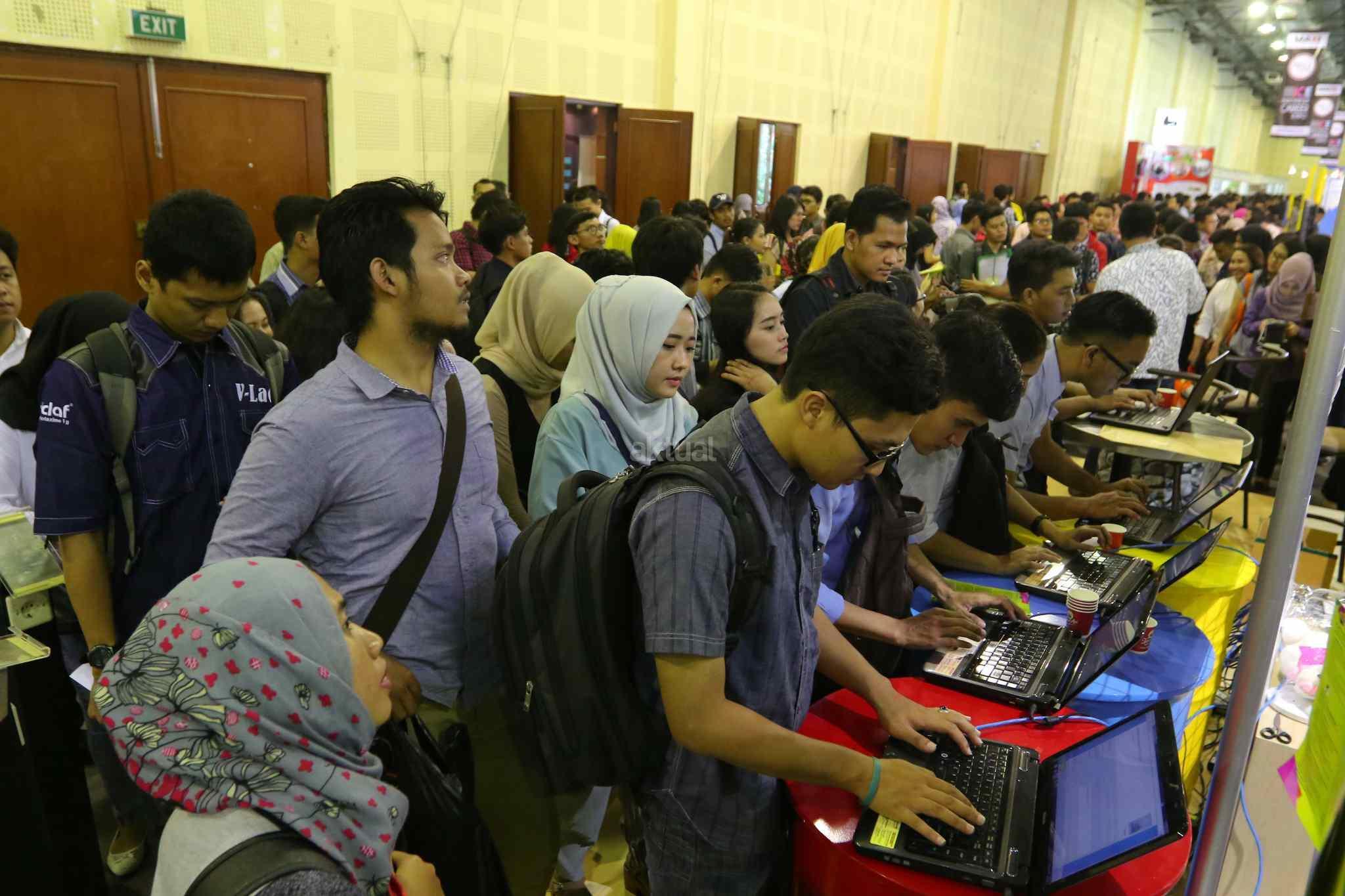 Ratusan pelamar memadati bursa kerja di Balai Kartini, Jakarta, Sabtu (15/10). Pada tahun ini angkatan kerja Indonesia mencapai 127,6 juta dengan tingkat pengangguran keseluruhan sebesar 5,5 persen atau tujuh juta orang. Sementara itu lebih dari 50 persen dari pekerja berkarir pada sektor informal. AKTUAL/Tino Oktaviano