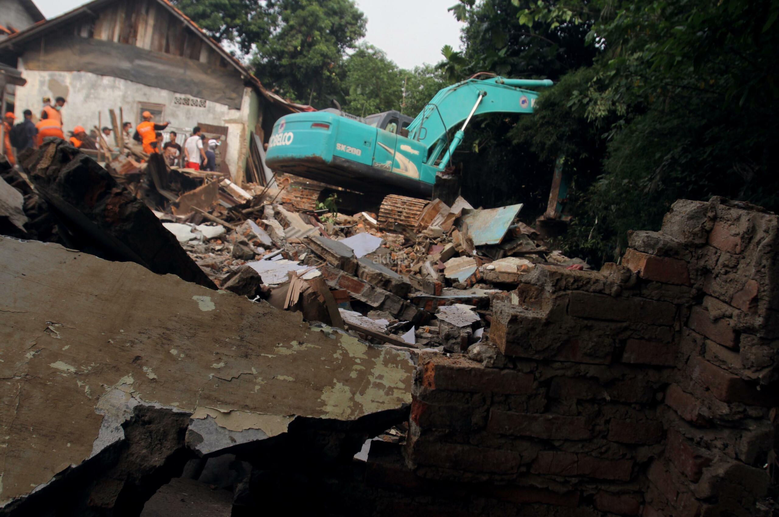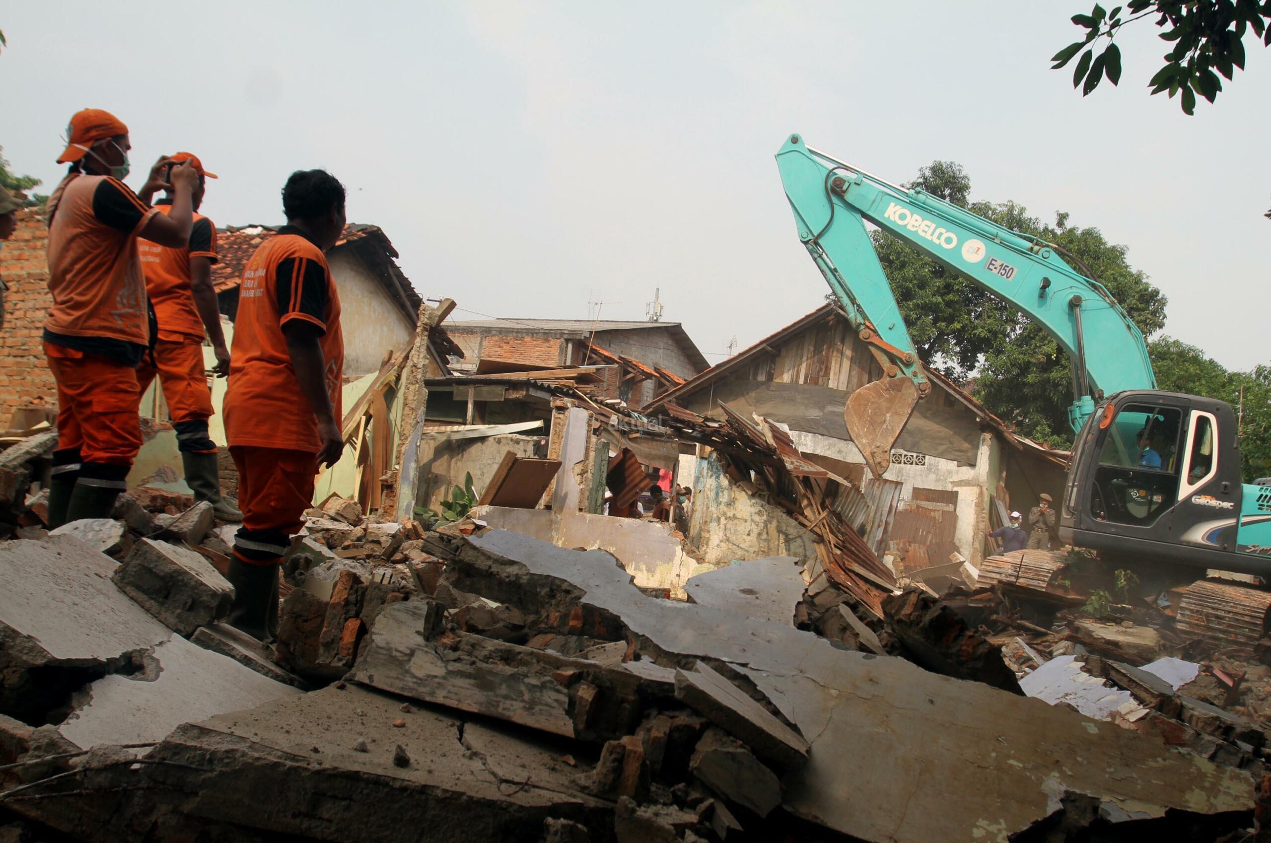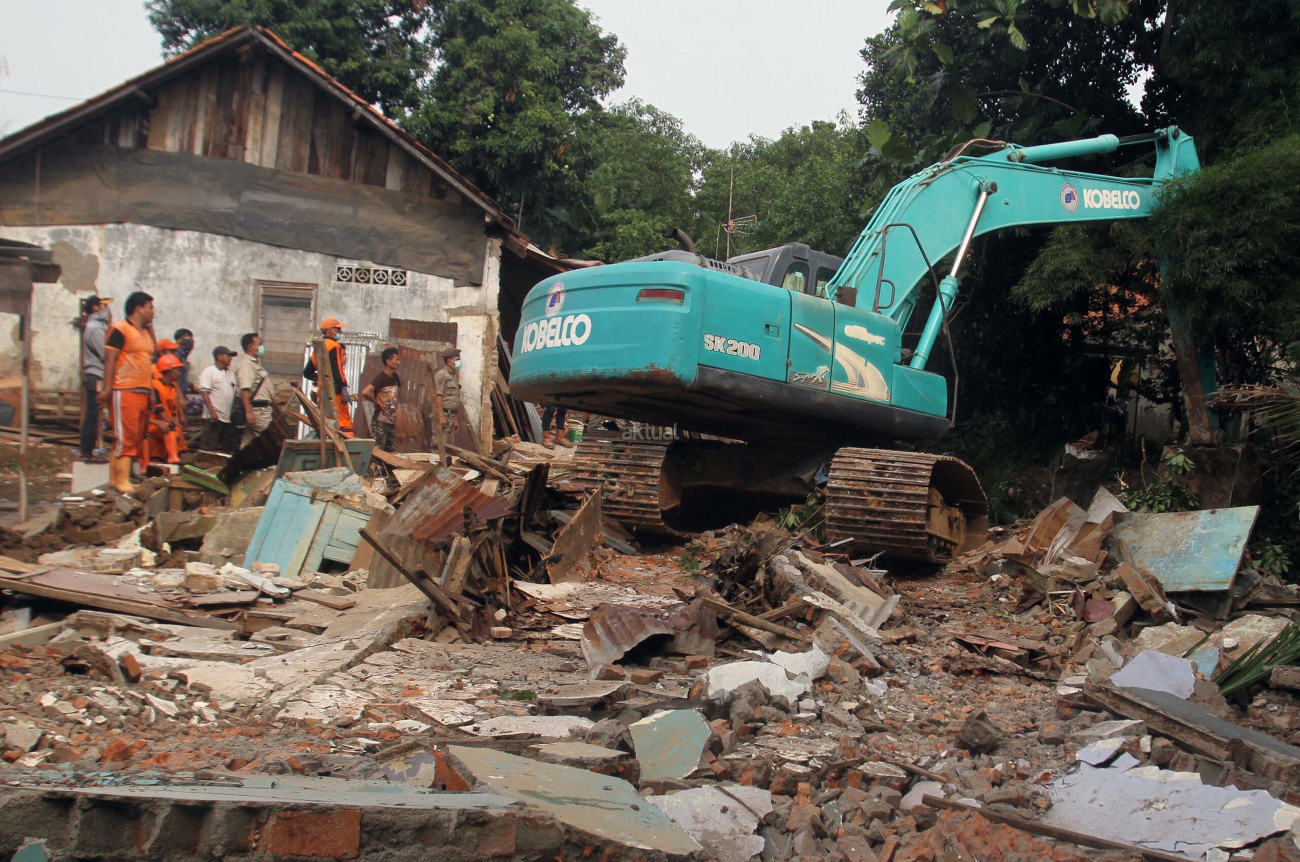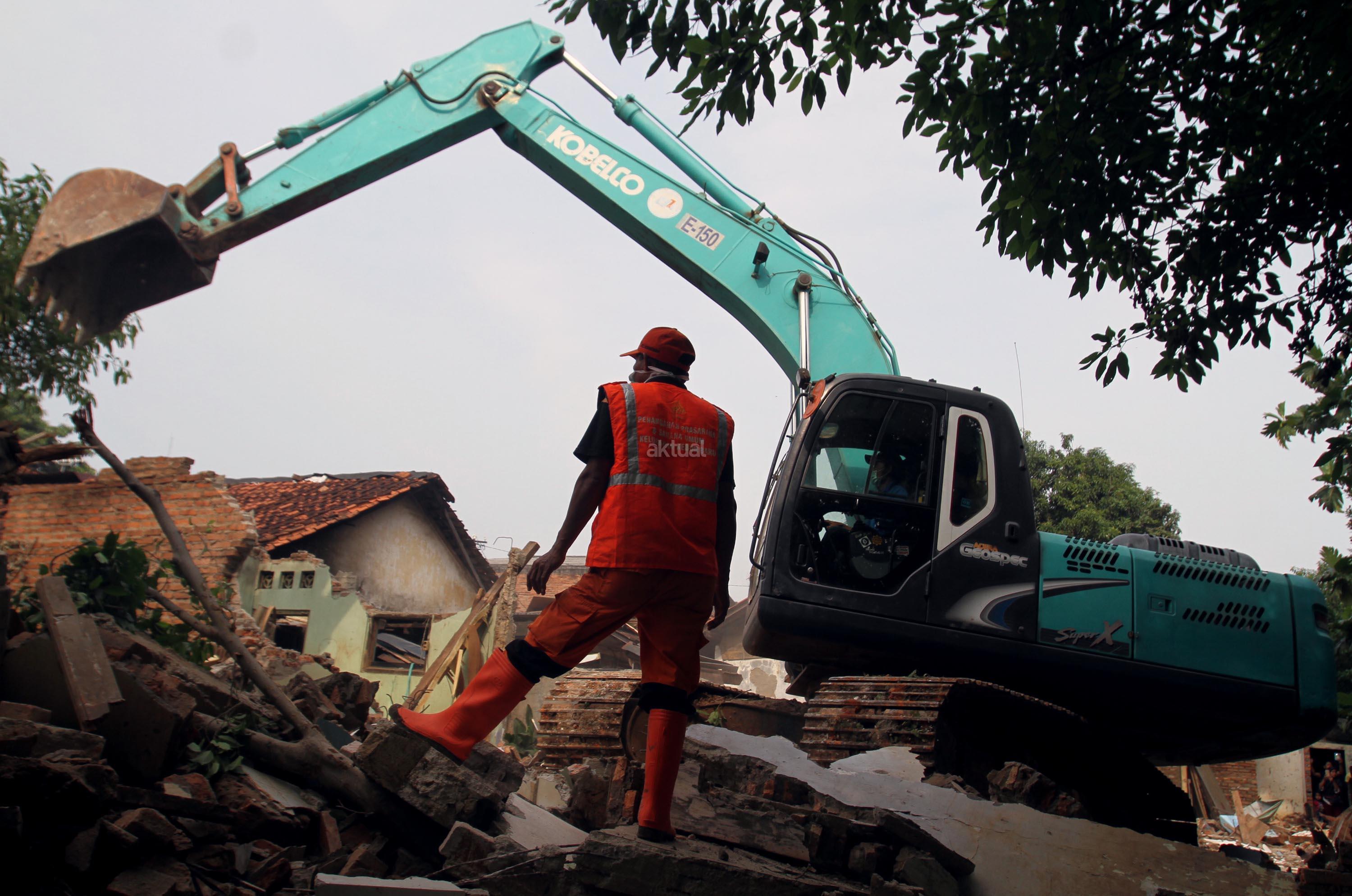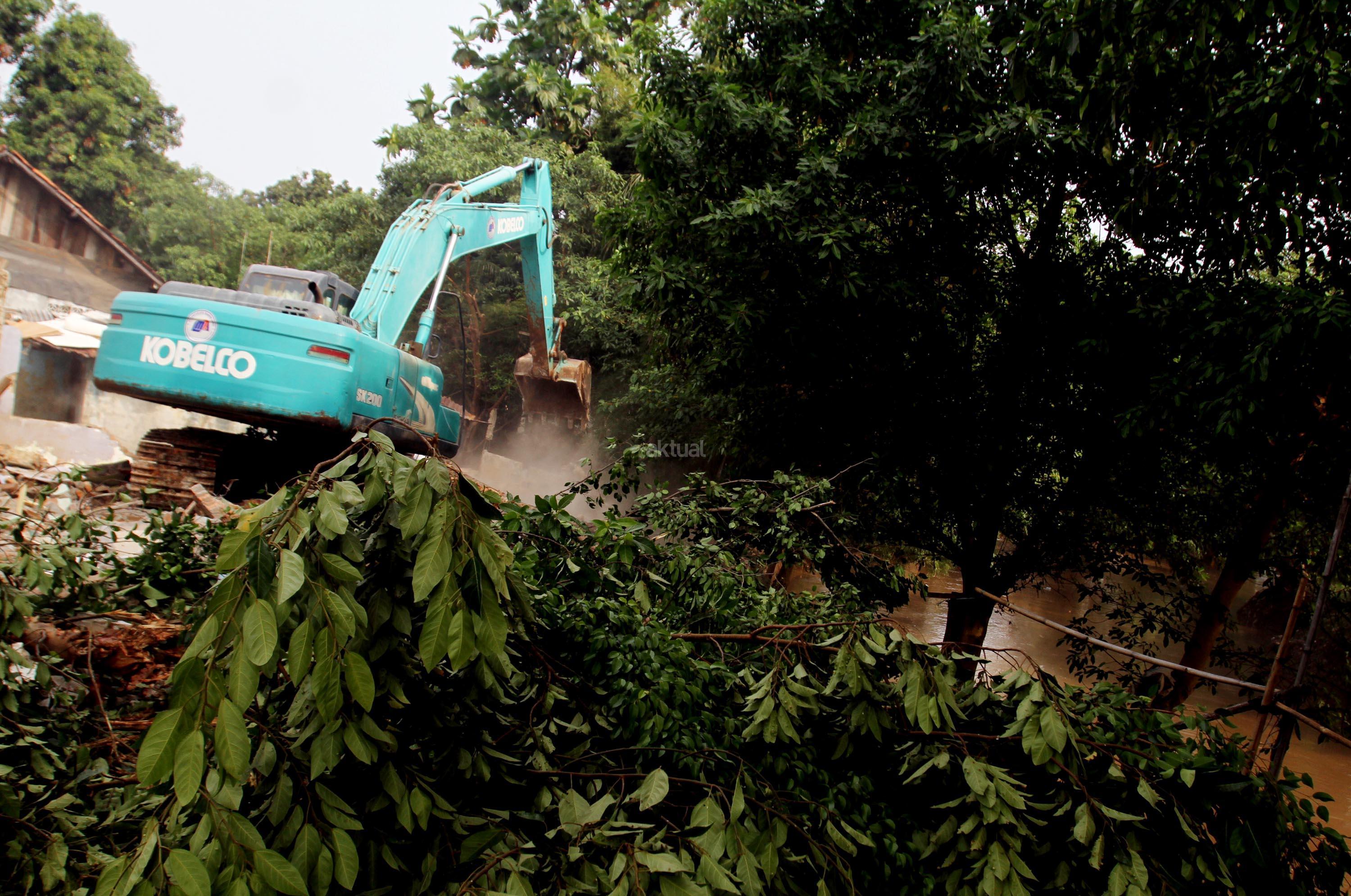 Petugas menggunakan alat berat untuk membongkar rumah warga di bantaran Kali Ciliwung, Bukit Duri, Jakarta Selatan, Selasa (11/7/2017). Sebanyak 345 bidang bangunan ditertibkan guna pembangunan proyek normalisasi Kali Ciliwung dan warga yang terdampak penertiban ini akan direlokasi ke Rusunawa di kawasan Rawa Bebek. AKTUAL/Munzir