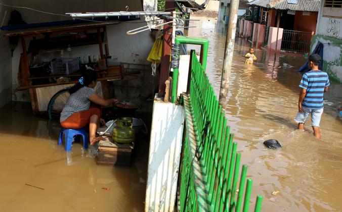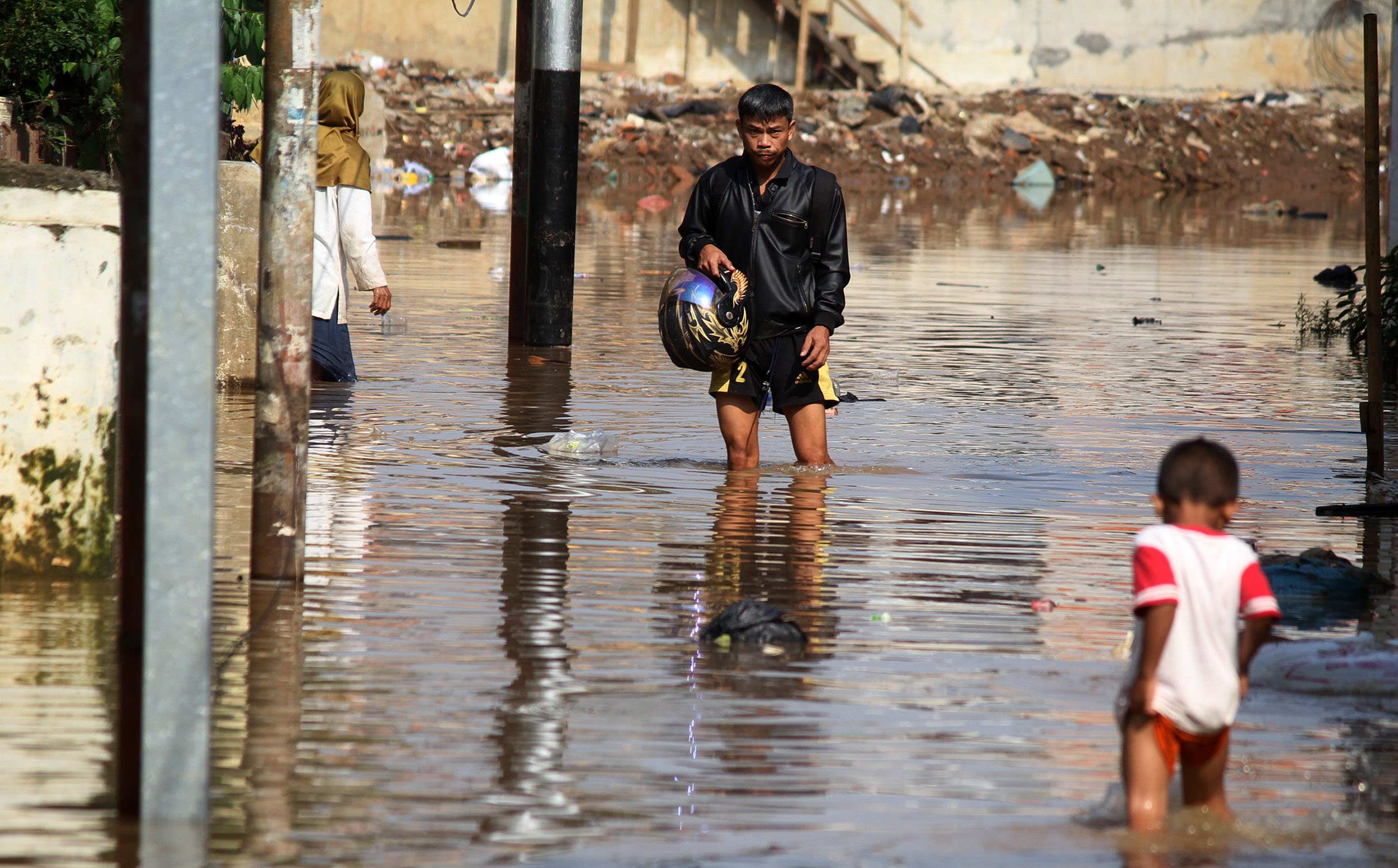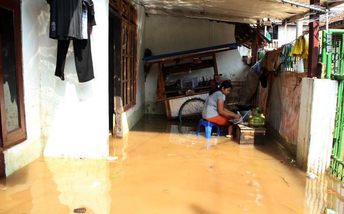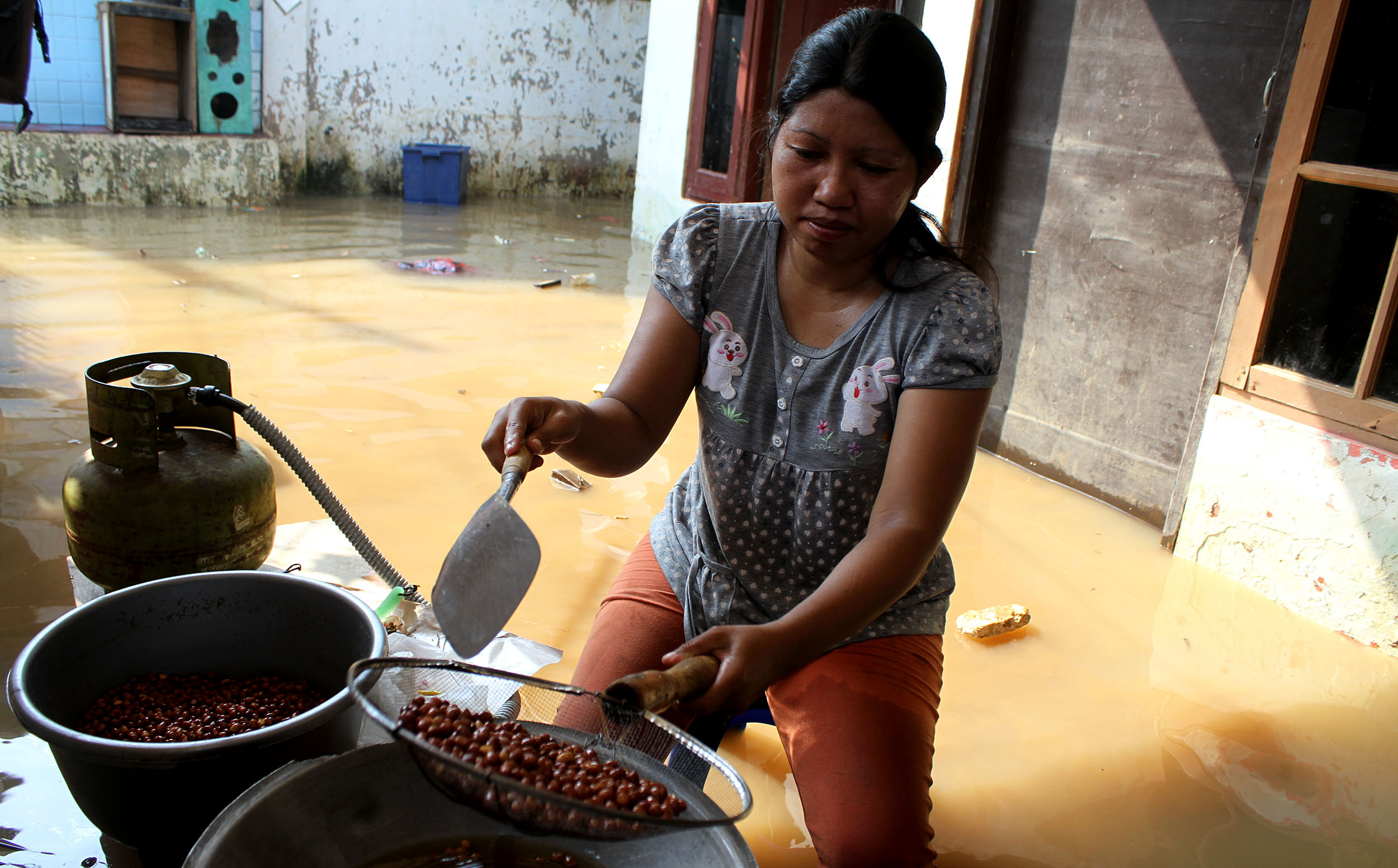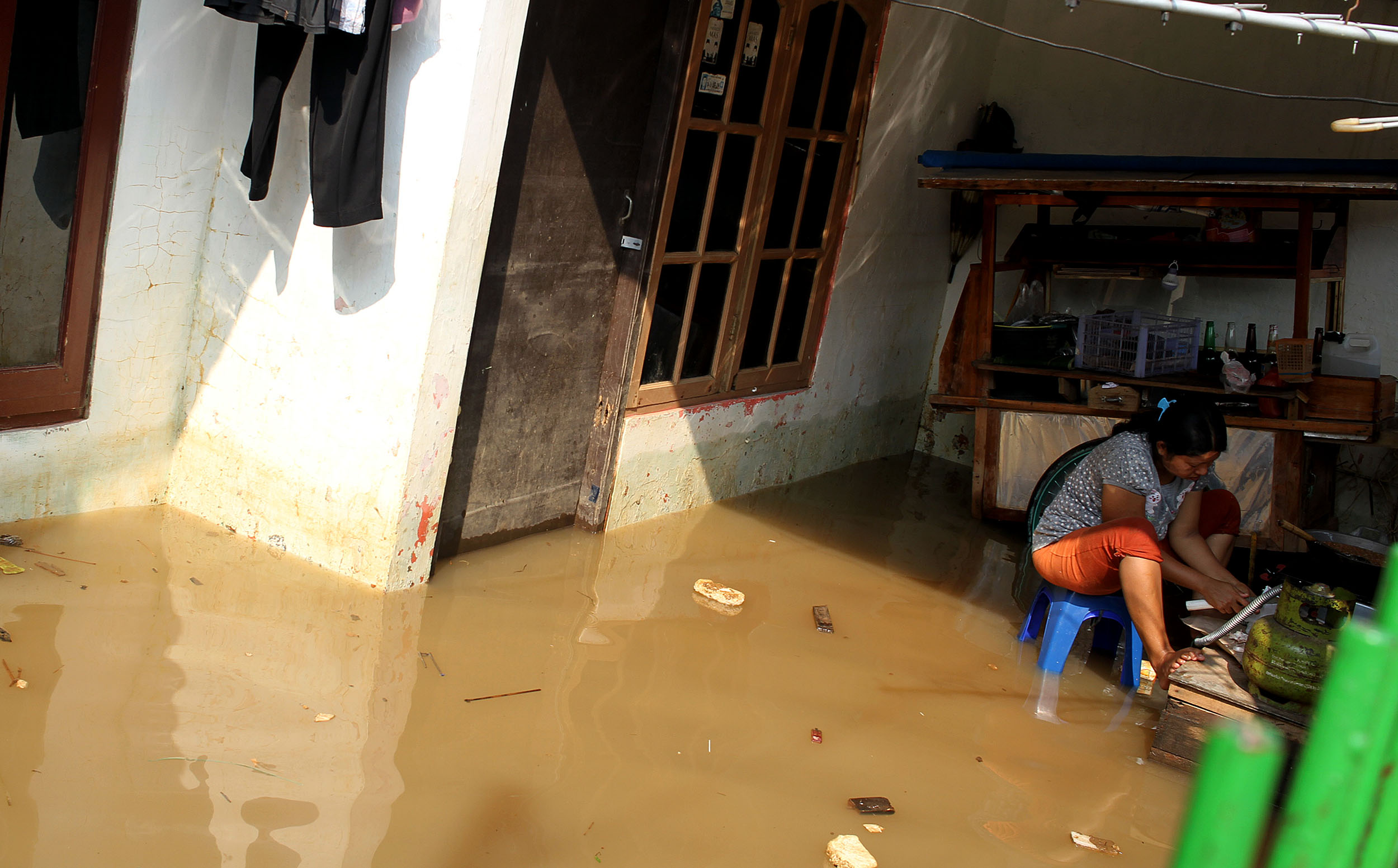 Terlihat warga masih melakukan aktivitas didalam rumah dan diluar rumah walaupun banjir menggenangi di pemukiman padat yang berada Kampung Melayu, Bukit Duri, Jakarta Selatan, Kamis (10/3/2016). Hujan deras yang mengguyur wilayah Bogor pada Senin (7/3/2016) mengakibatkan volume air di kali Ciliwung meningkat dan kembali mengakibatkan banjir di daerah bantaran kali.