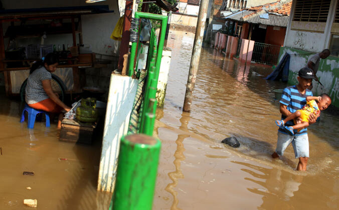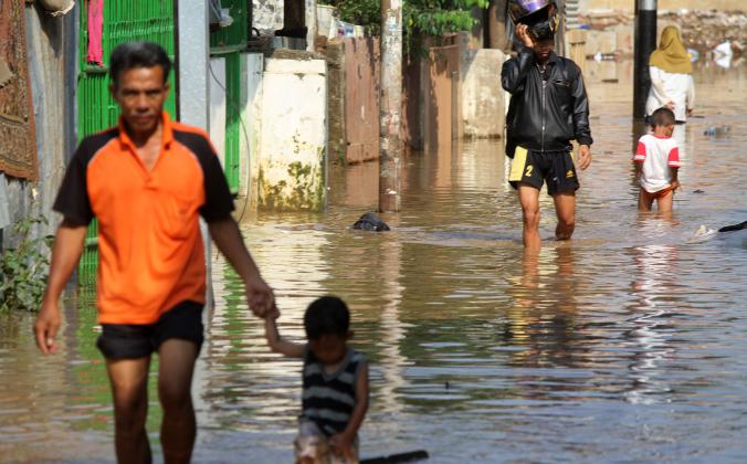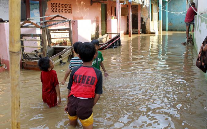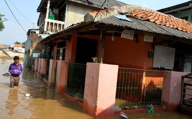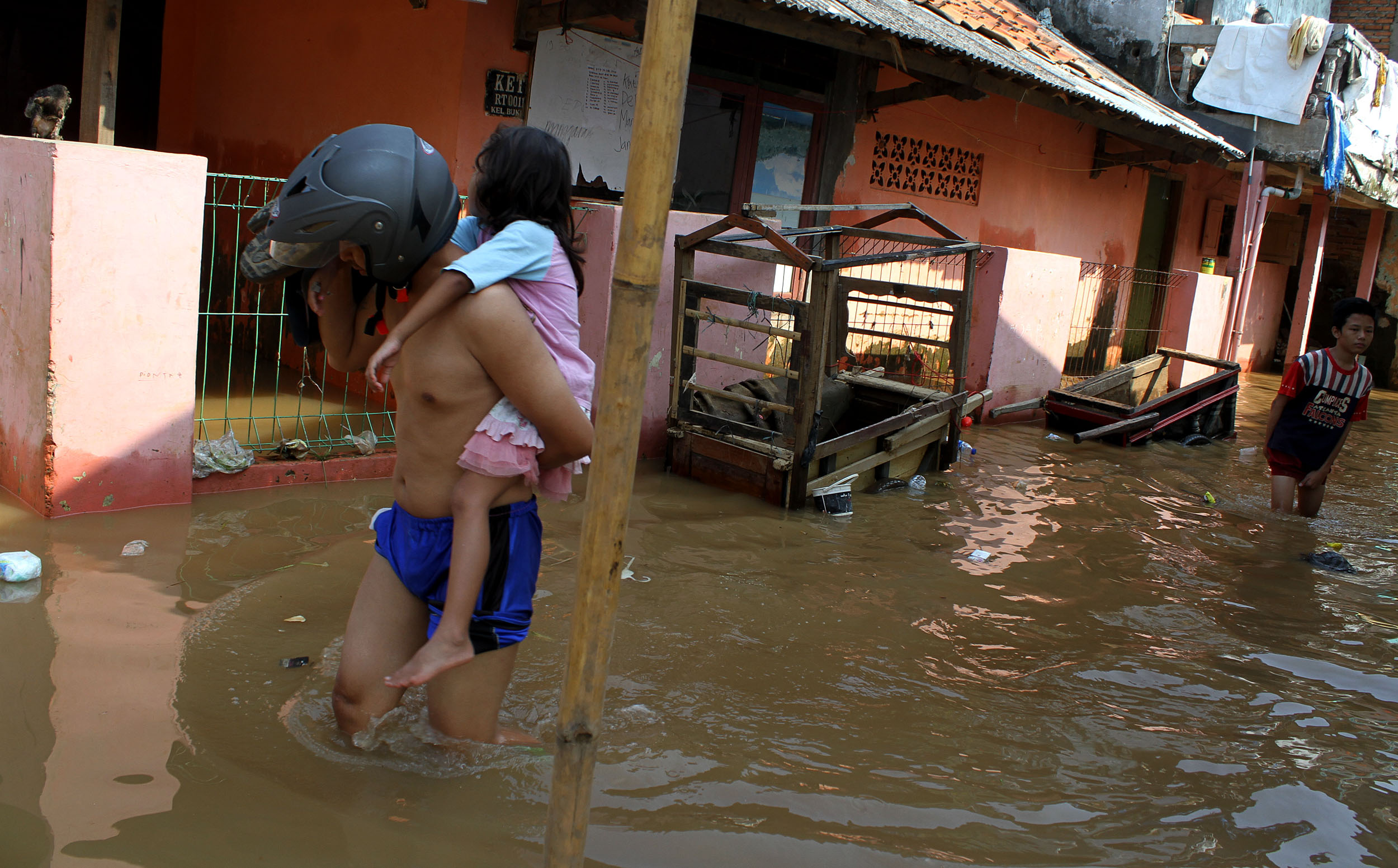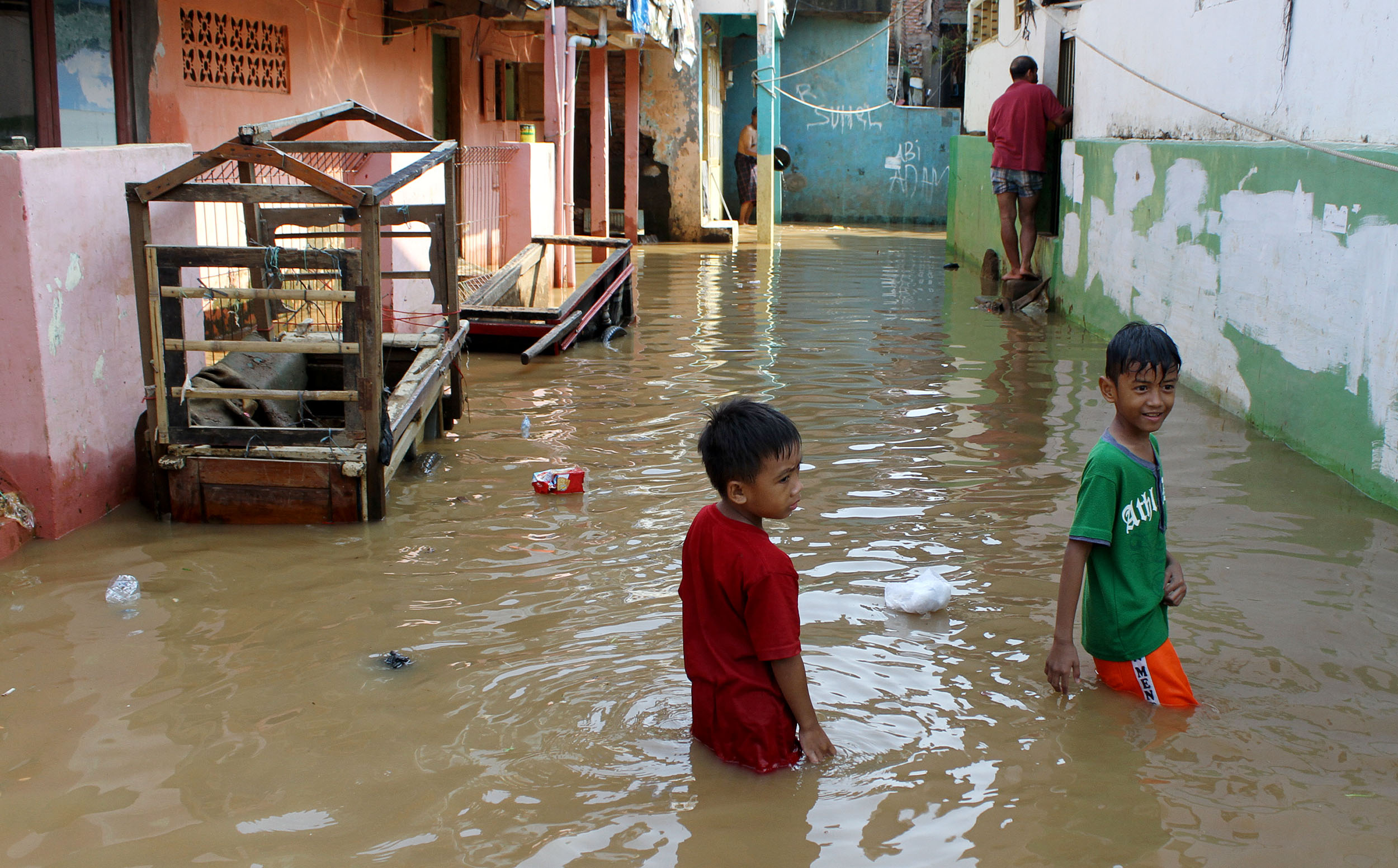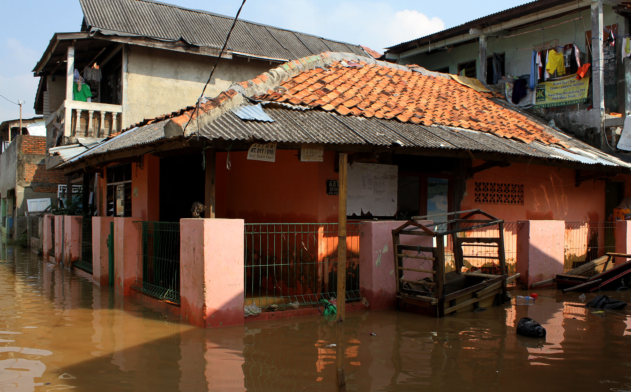 Terlihat warga masih melakukan aktivitas didalam rumah dan diluar rumah walaupun banjir menggenangi di pemukiman padat yang berada Kampung Melayu, Bukit Duri, Jakarta Selatan, Kamis (10/3/2016). Hujan deras yang mengguyur wilayah Bogor pada Senin (7/3/2016) mengakibatkan volume air di kali Ciliwung meningkat dan kembali mengakibatkan banjir di daerah bantaran kali.