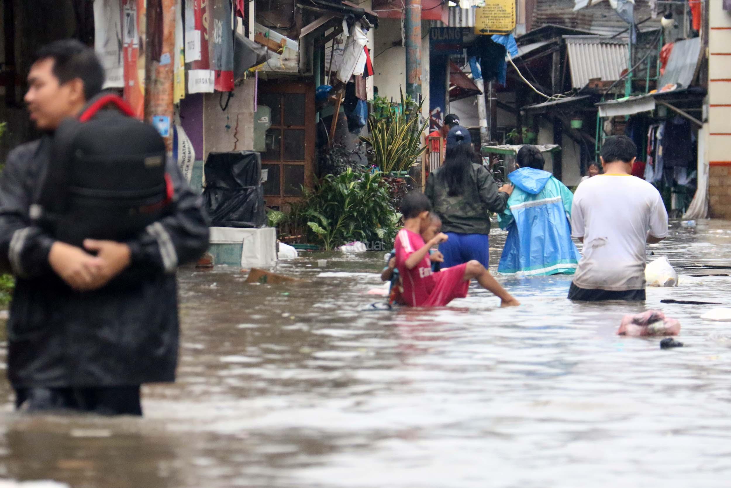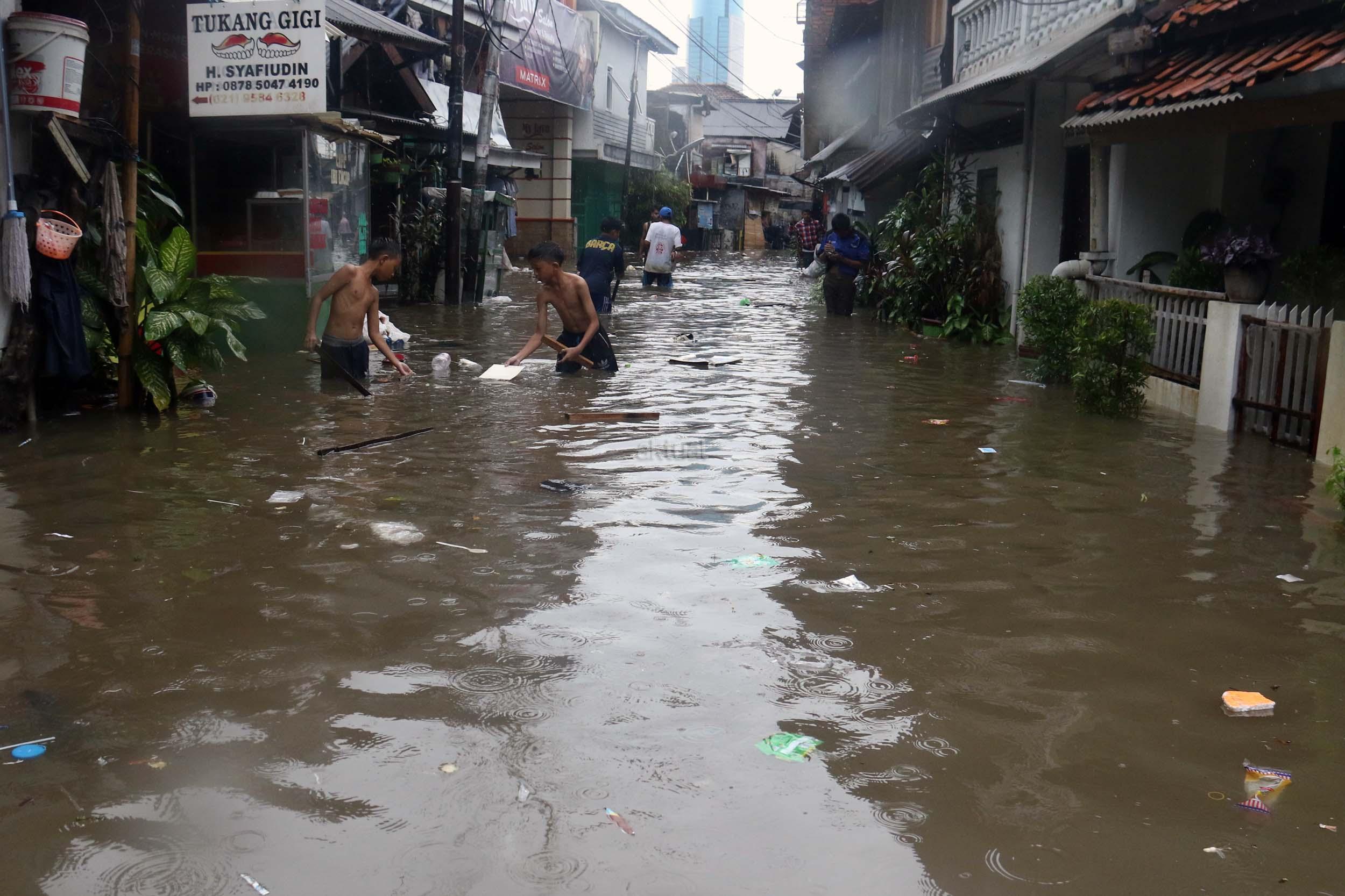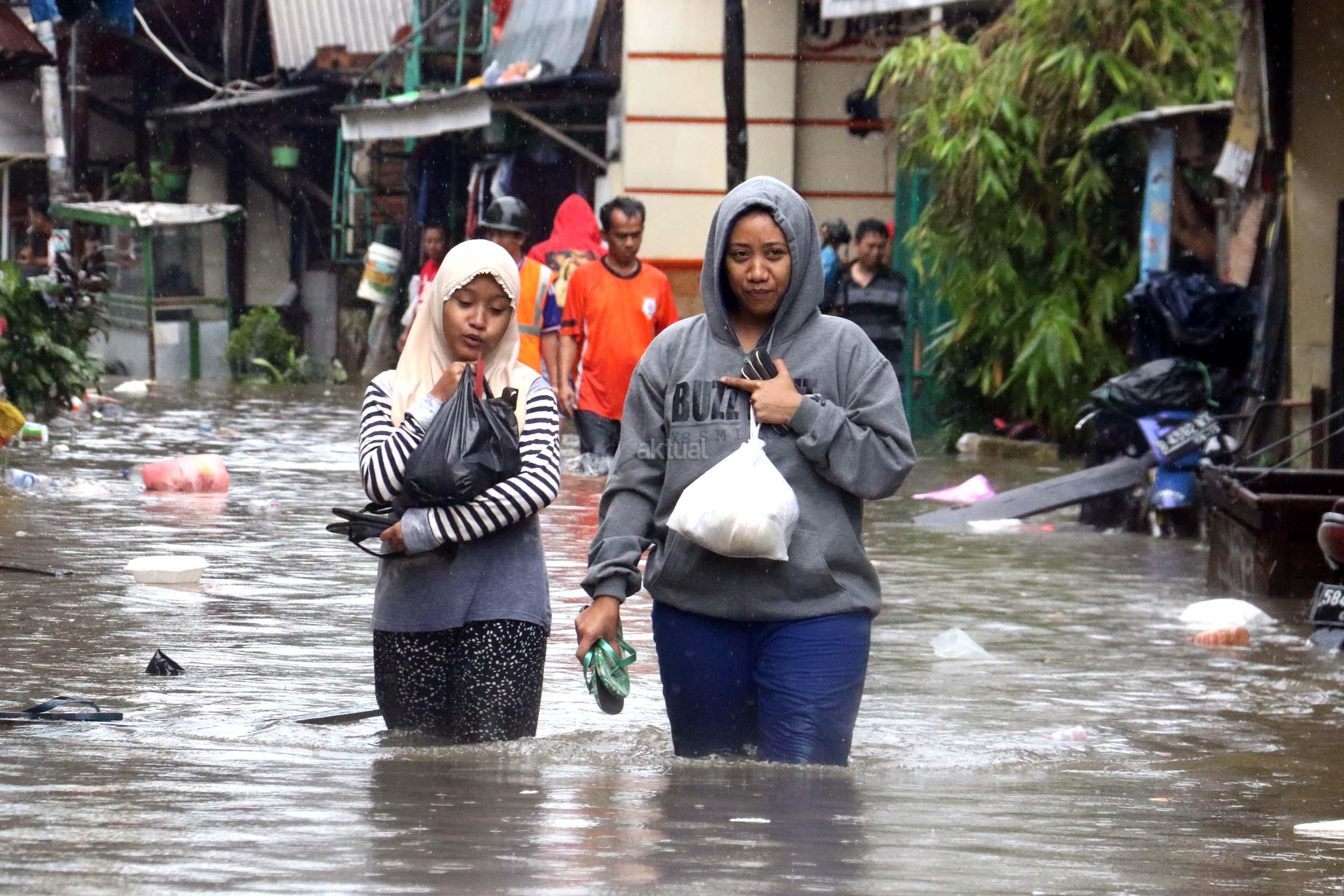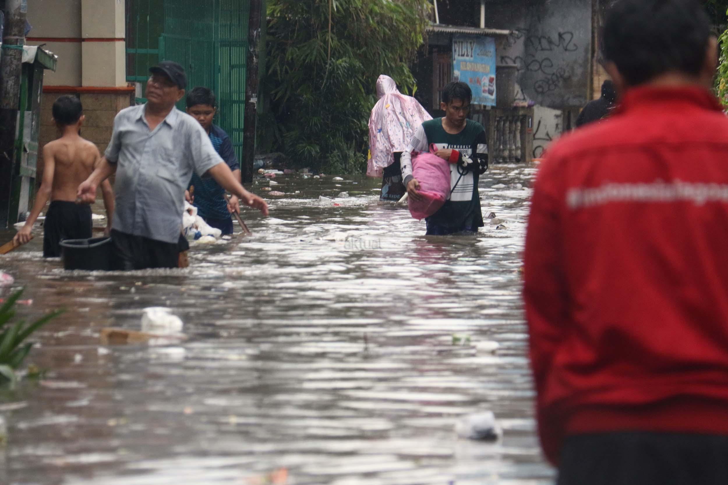 Sejumlah warga menerobos banjir yang merendam ratusan rumah di kawasan Karet, Jakarta Pusat, Selasa (21/2/2017). Badan Nasional Penanggulangan Bencana (BNPB) menyebutkan bahwa ada 54 titik banjir yang tersebar di wilayah Jakarta dengan ketinggian bervariasi. AKTUAL/Munzir