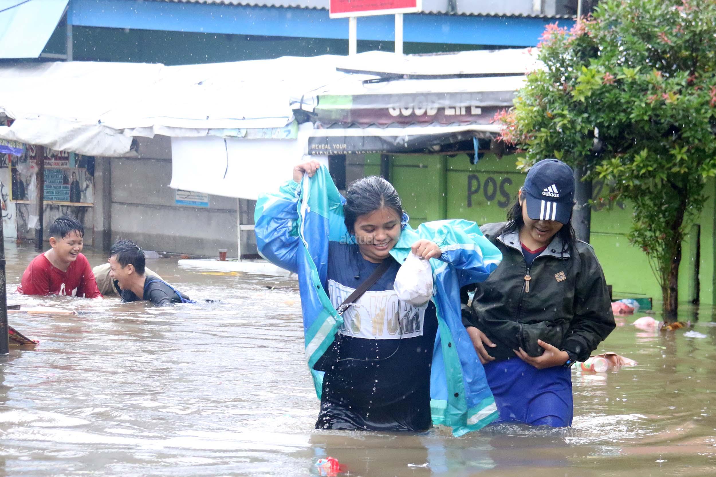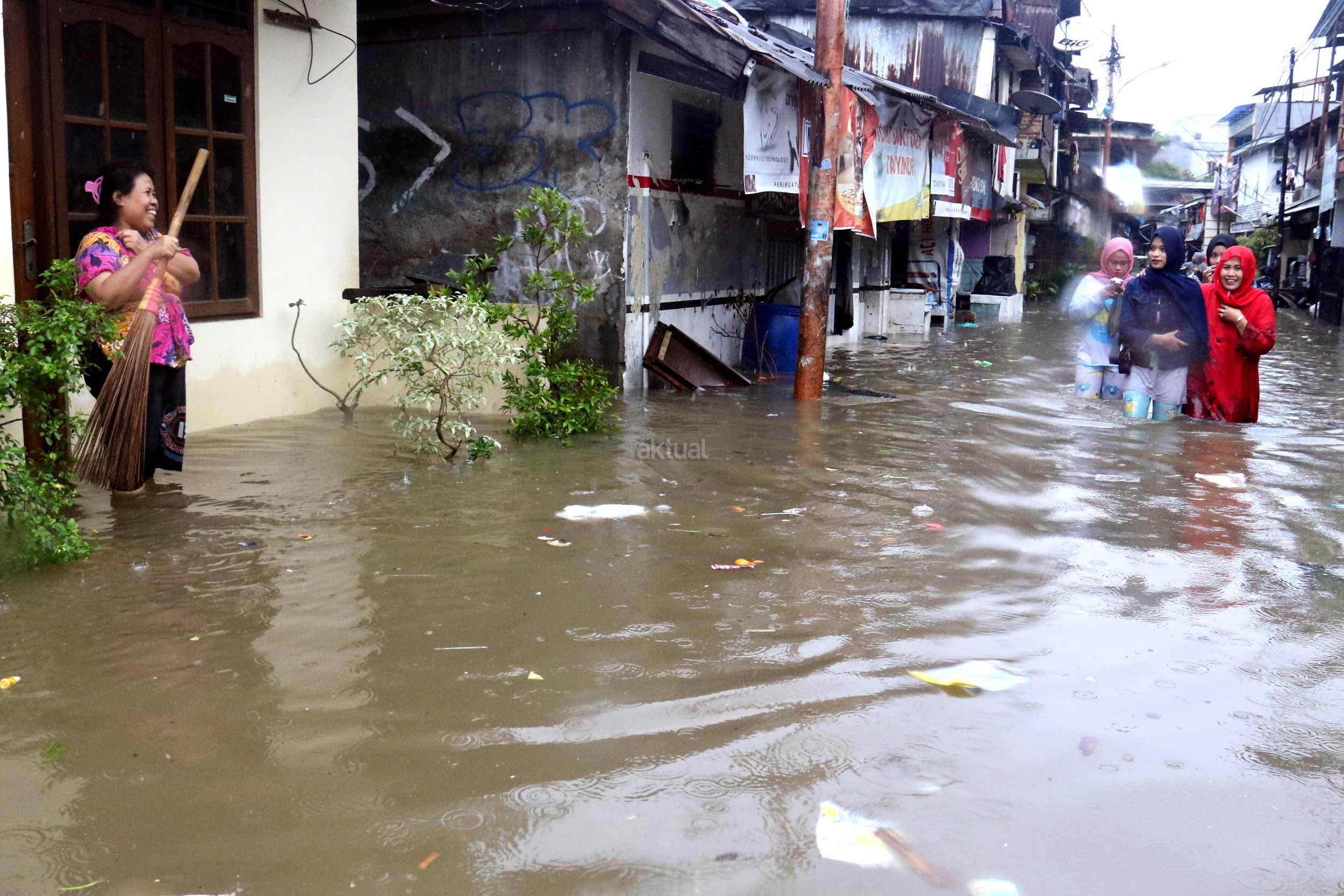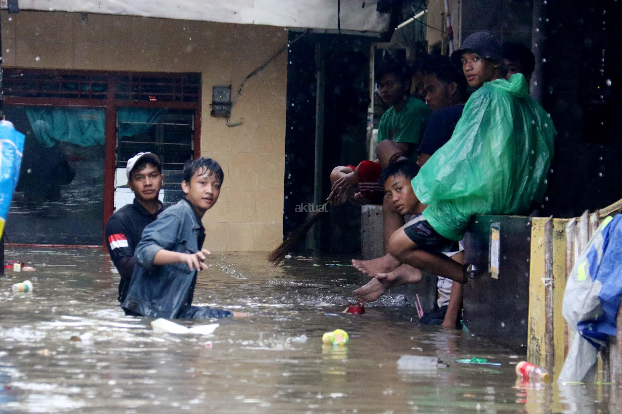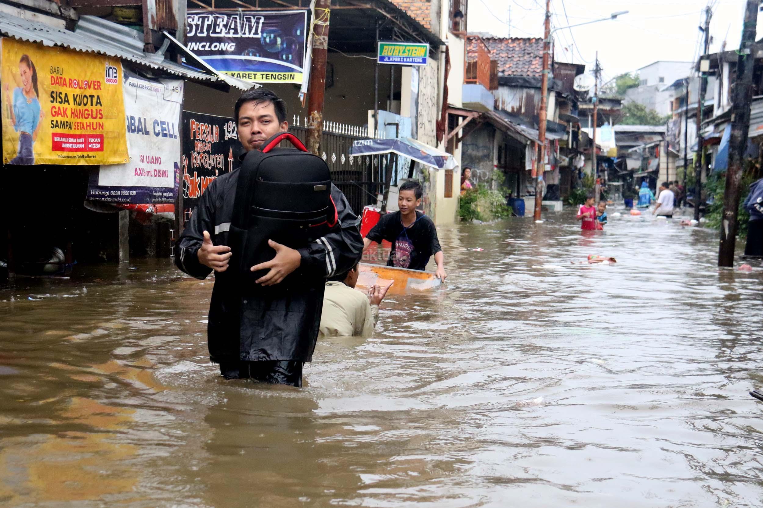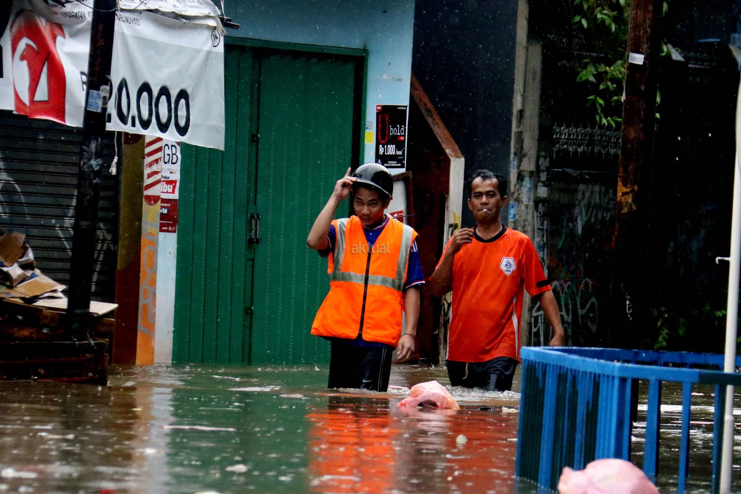 Sejumlah warga menerobos banjir yang merendam ratusan rumah di kawasan Karet, Jakarta Pusat, Selasa (21/2/2017). Badan Nasional Penanggulangan Bencana (BNPB) menyebutkan bahwa ada 54 titik banjir yang tersebar di wilayah Jakarta dengan ketinggian bervariasi. AKTUAL/Munzir
