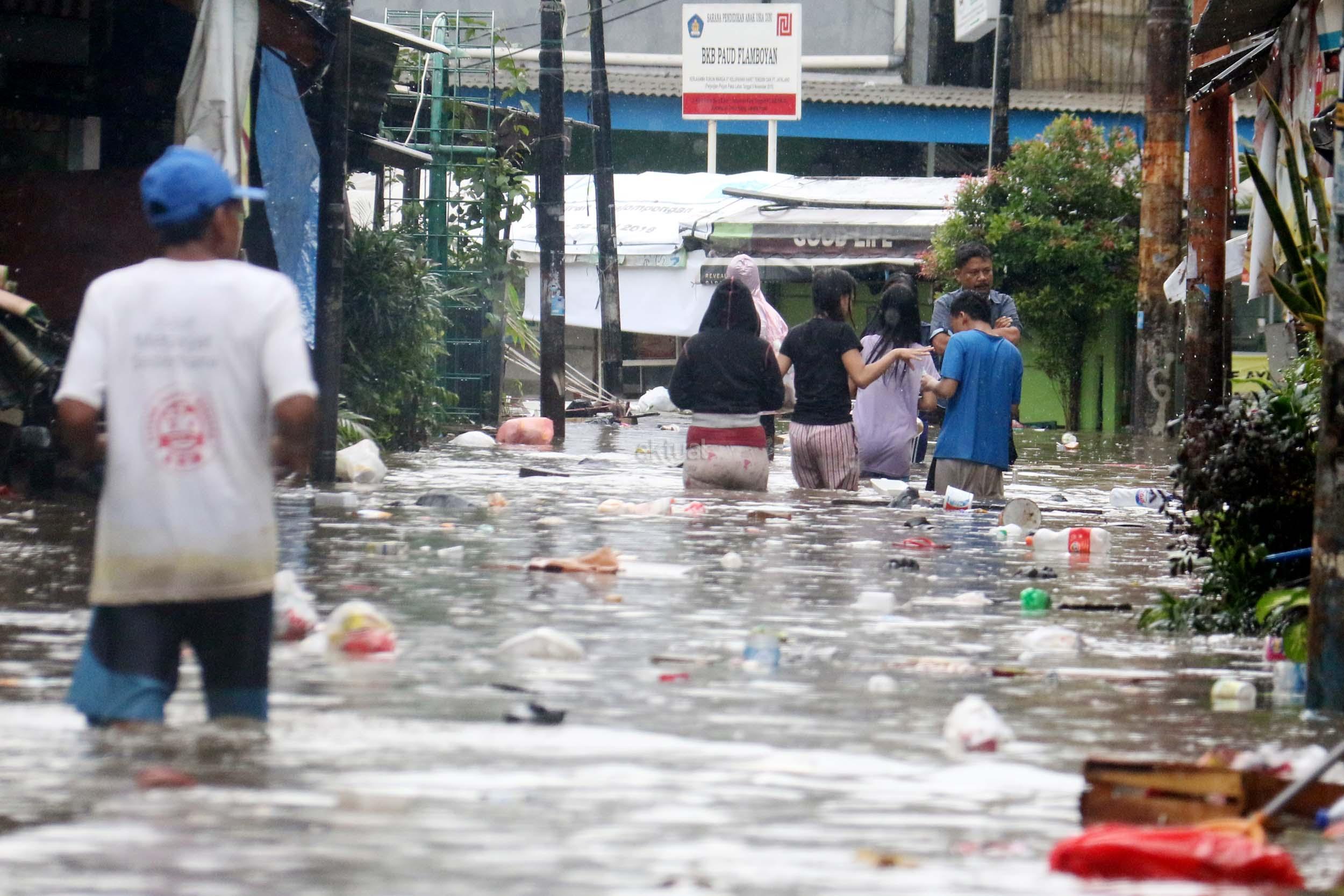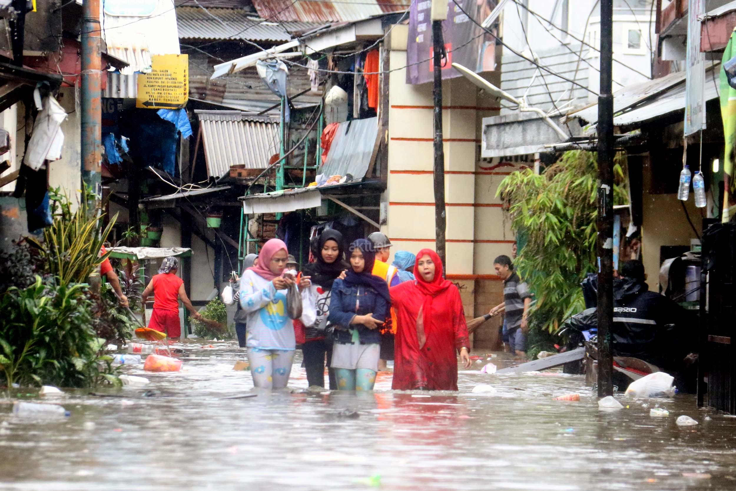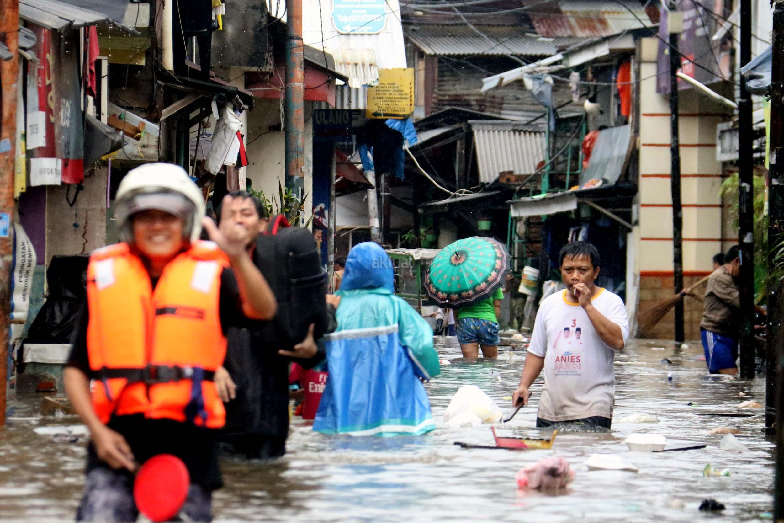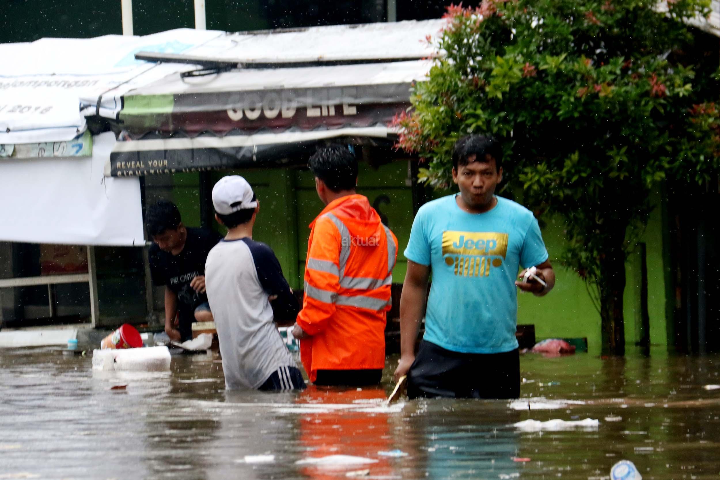 Sejumlah warga menerobos banjir yang merendam ratusan rumah di kawasan Karet, Jakarta Pusat, Selasa (21/2/2017). Badan Nasional Penanggulangan Bencana (BNPB) menyebutkan bahwa ada 54 titik banjir yang tersebar di wilayah Jakarta dengan ketinggian bervariasi. AKTUAL/Munzir