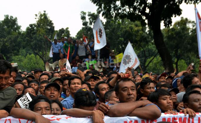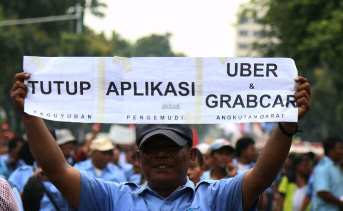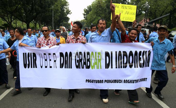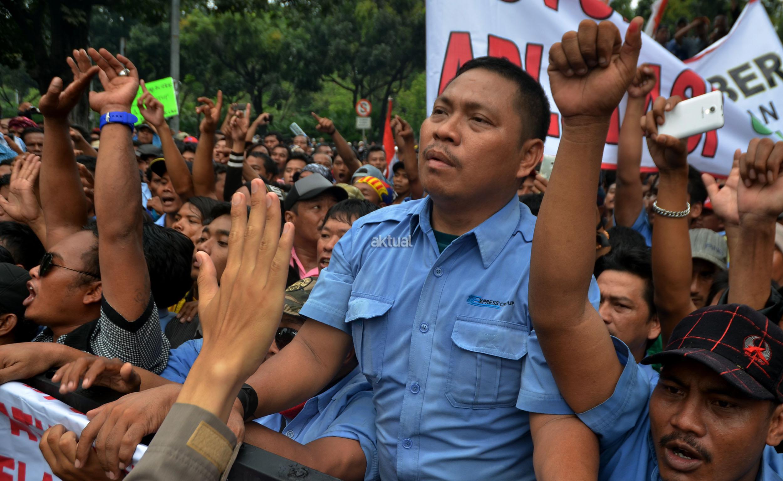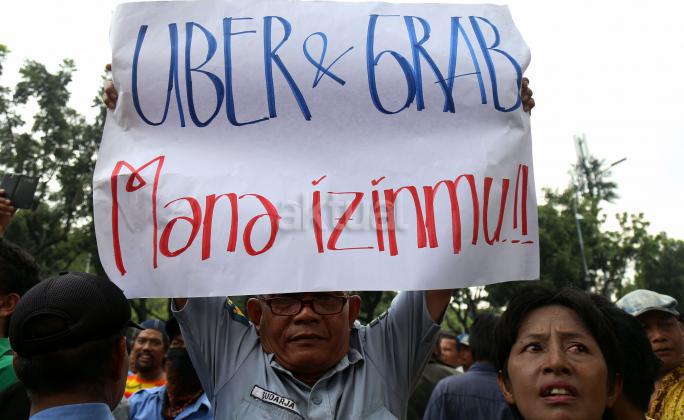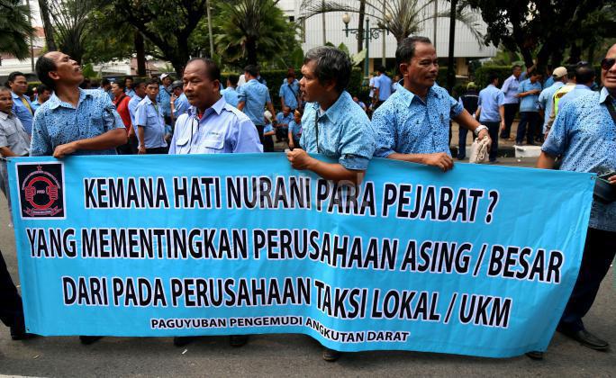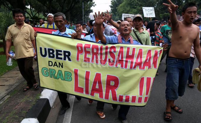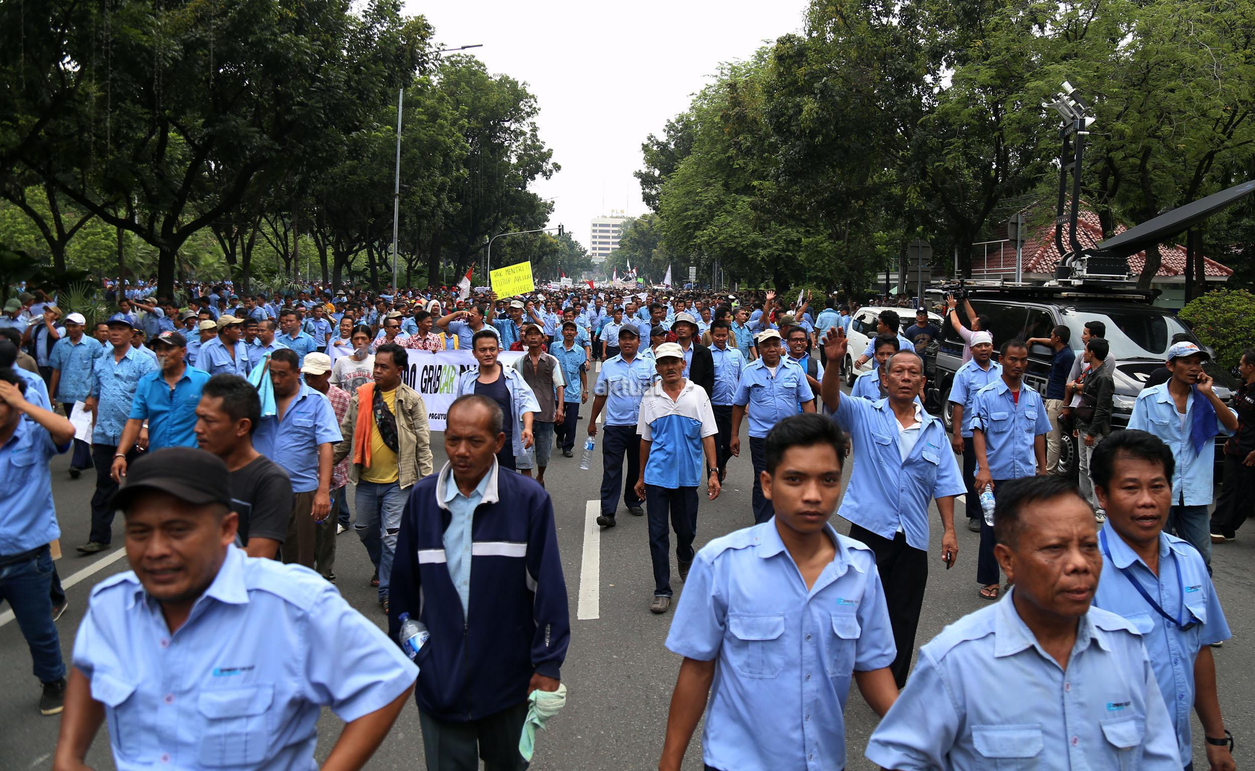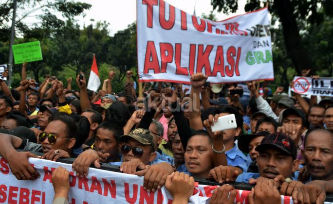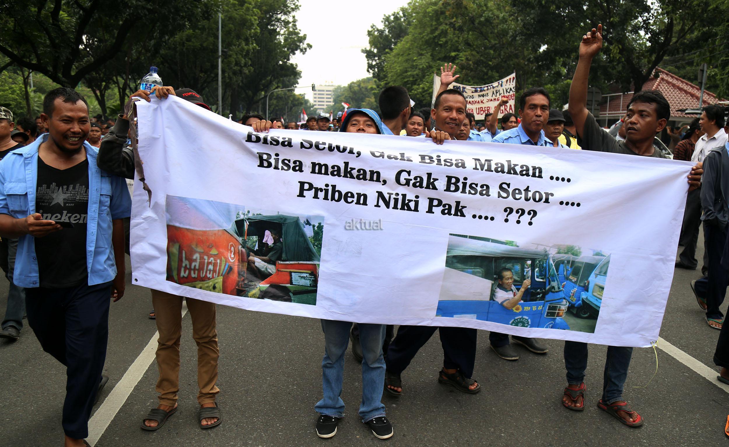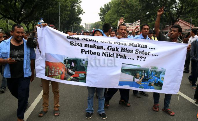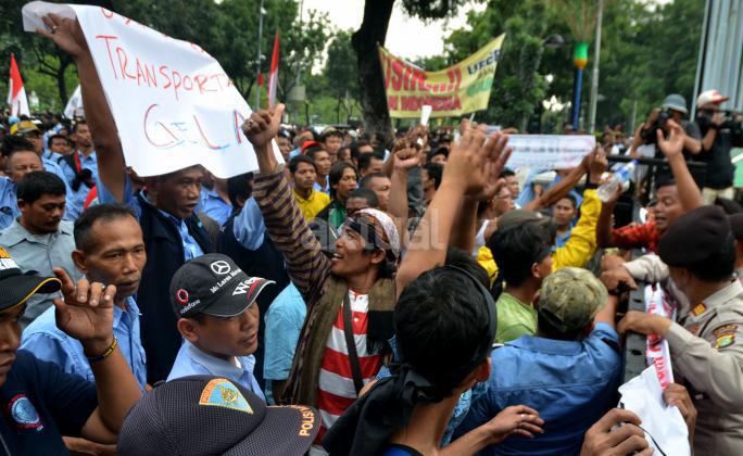 Ribuan sopir angkutan umum Jabodetabek yang tergabung dalam Paguyuban Pengemudi Angkutan Darat (PPAD) melakukan aksi didepan Balaikota, Jakarta, Senin (14/3/2016). Dalam aksinya mendesak Gebenur DKI Jakarta Basuki Tjahaja Purnama (Ahok) untuk menolak keberdaan aplikasi dan menuntut pemerintah menutup aplikasi transportasi online, yakni Uber dan Grab Taksi.