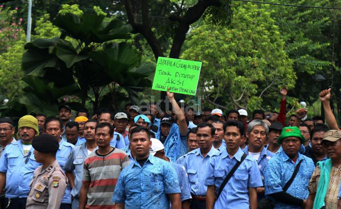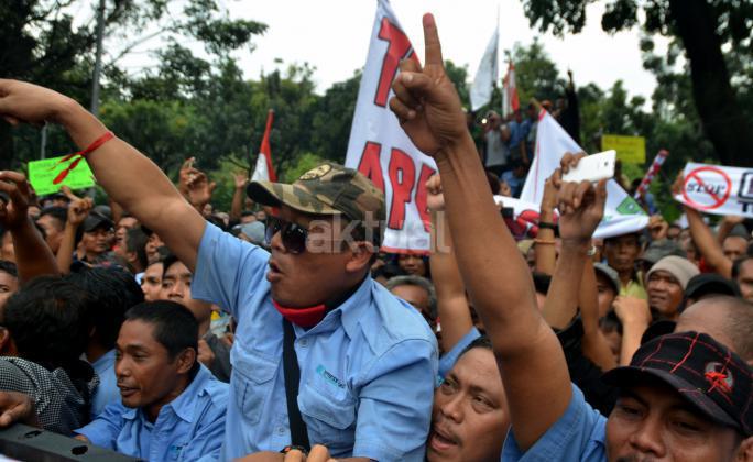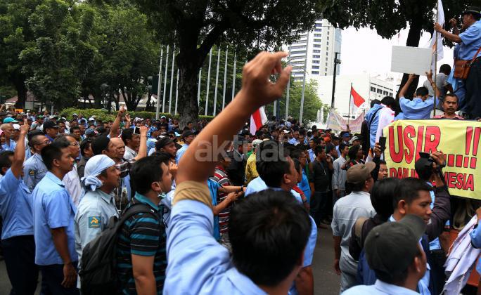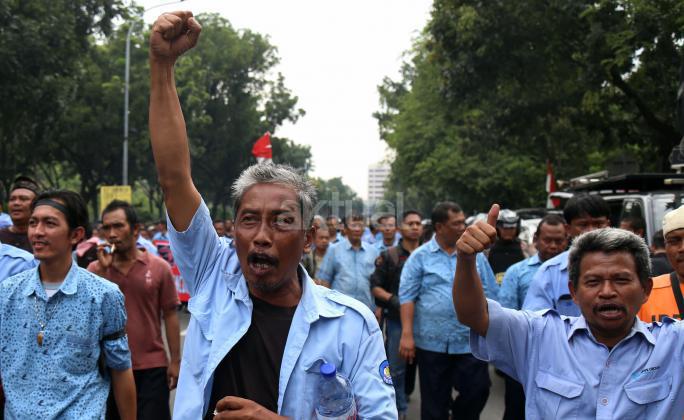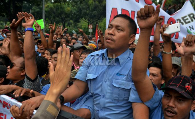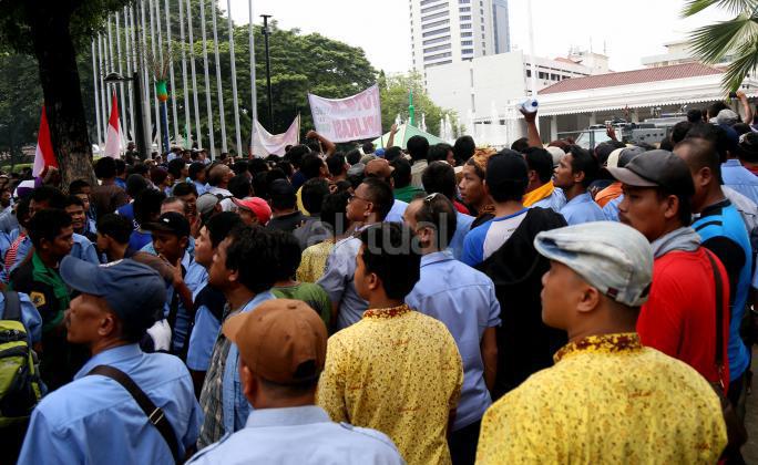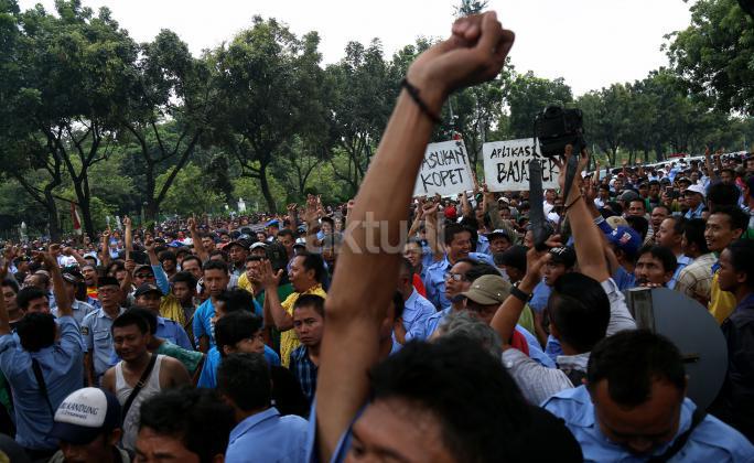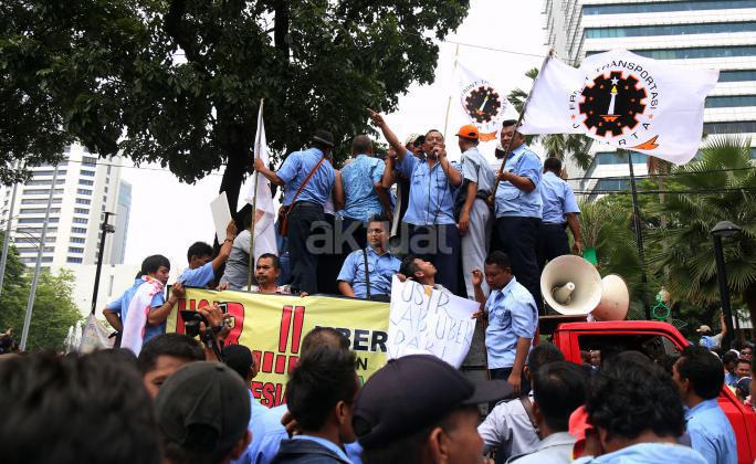 Ribuan sopir angkutan umum Jabodetabek yang tergabung dalam Paguyuban Pengemudi Angkutan Darat (PPAD) melakukan aksi didepan Balaikota, Jakarta, Senin (14/3/2016). Dalam aksinya mendesak Gebenur DKI Jakarta Basuki Tjahaja Purnama (Ahok) untuk menolak keberdaan aplikasi dan menuntut pemerintah menutup aplikasi transportasi online, yakni Uber dan Grab.