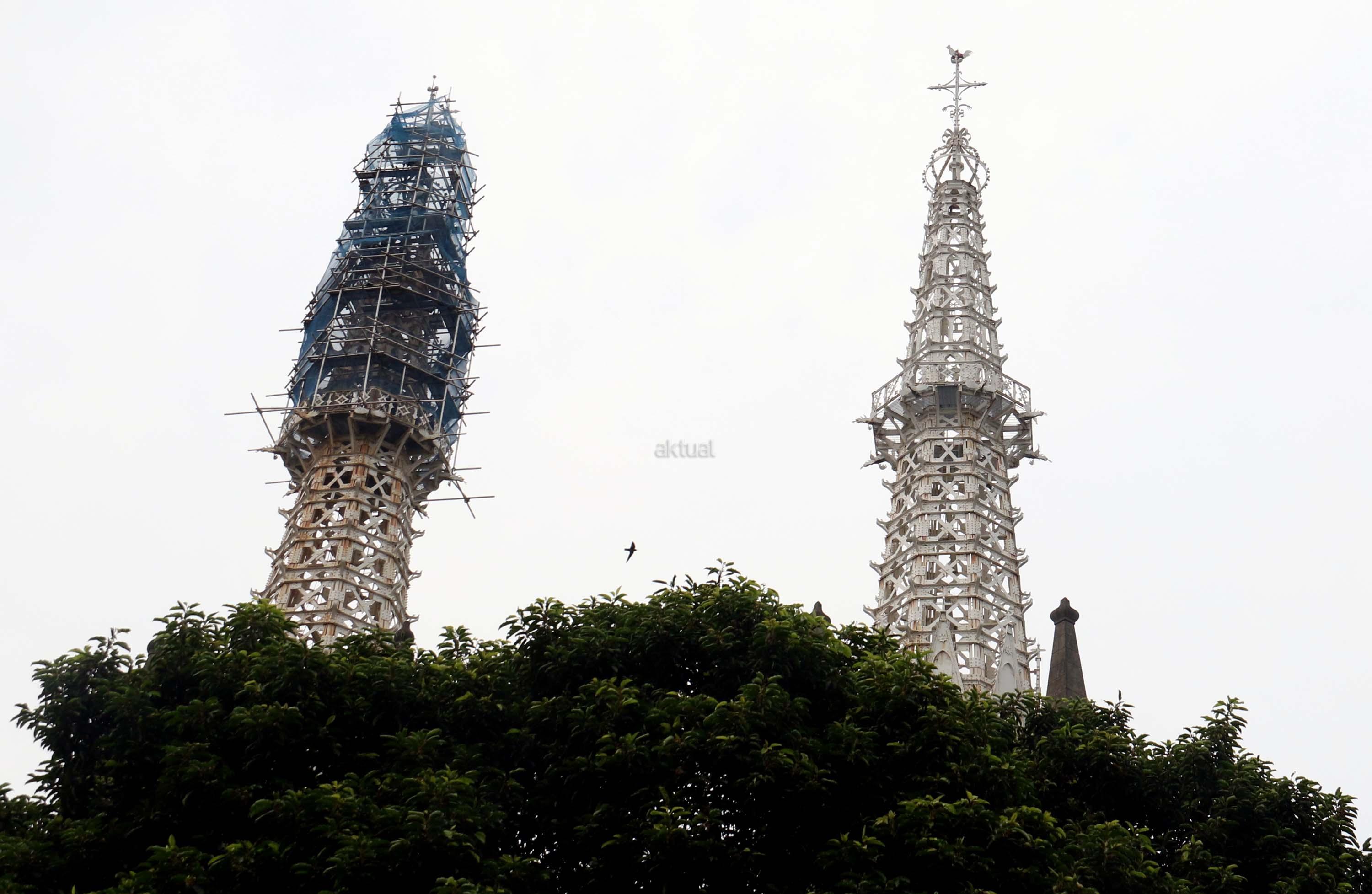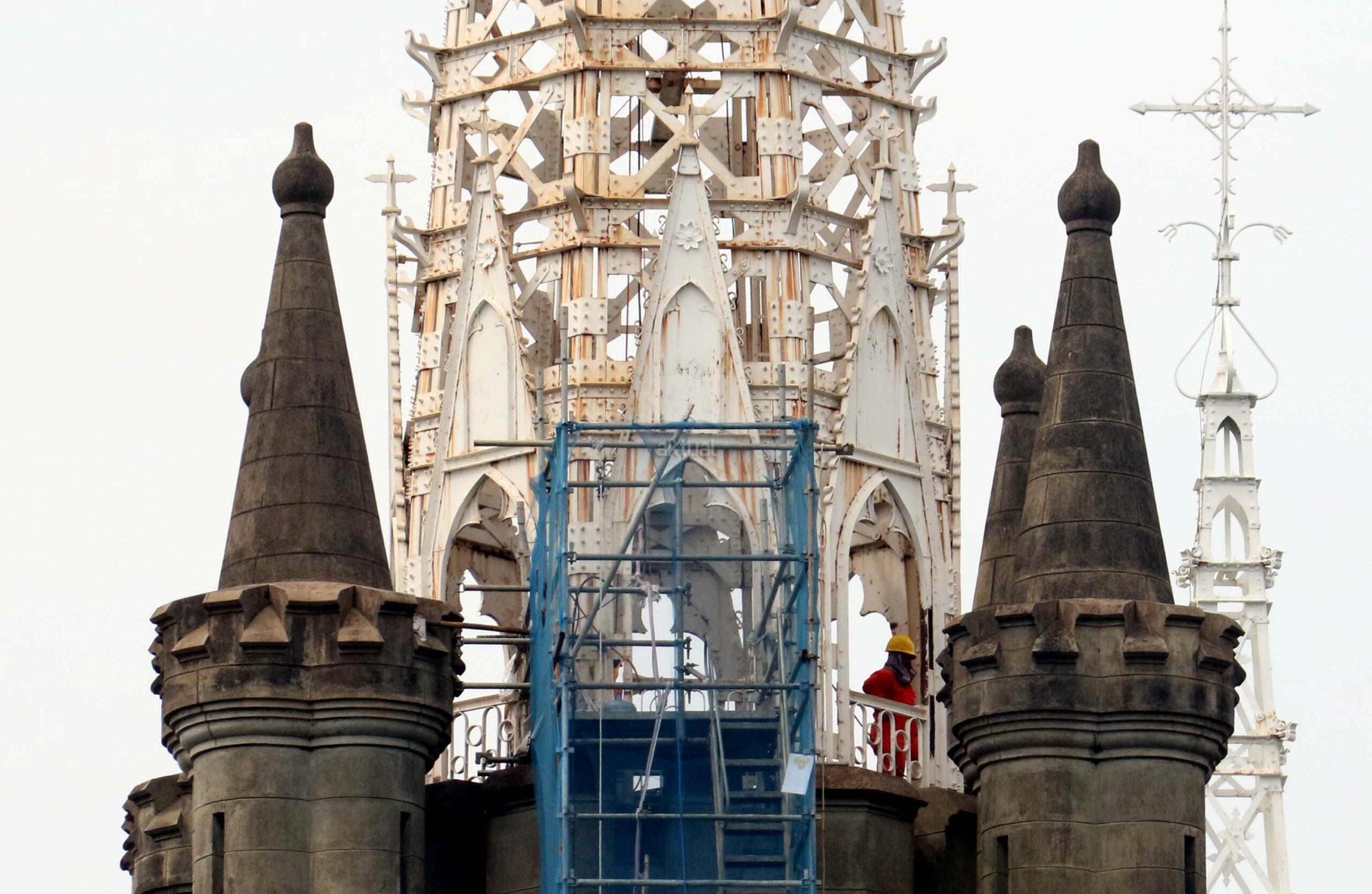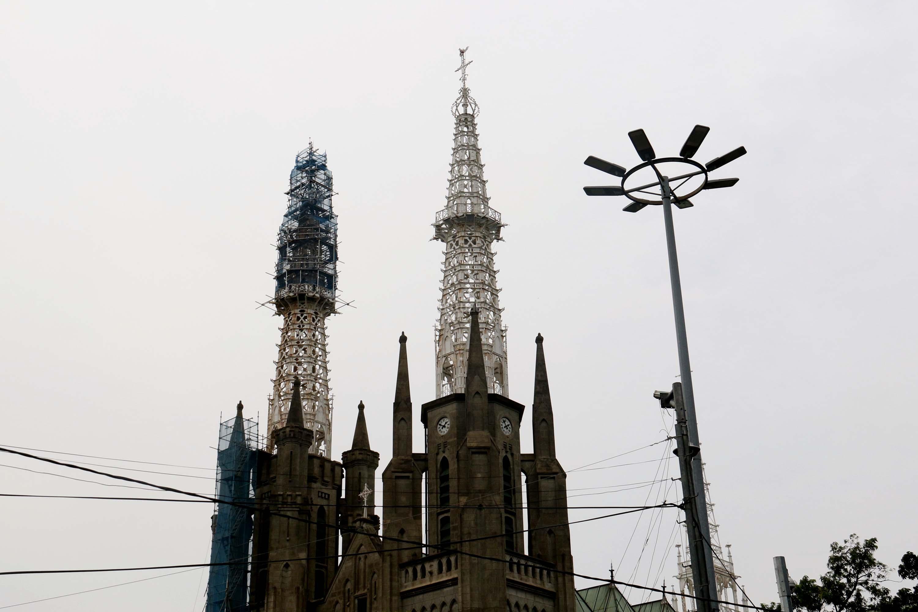 Pekerja melakukan proyek konservasi bagian menara Gereja Katedral Jakarta, Jumat (2/6/2017). Konservasi guna membersihkan, memelihara dan memperbaiki gereja berarsitektur neo-gothic yang merupakan cagar budaya di Jakarta. AKTUAL/Munzir