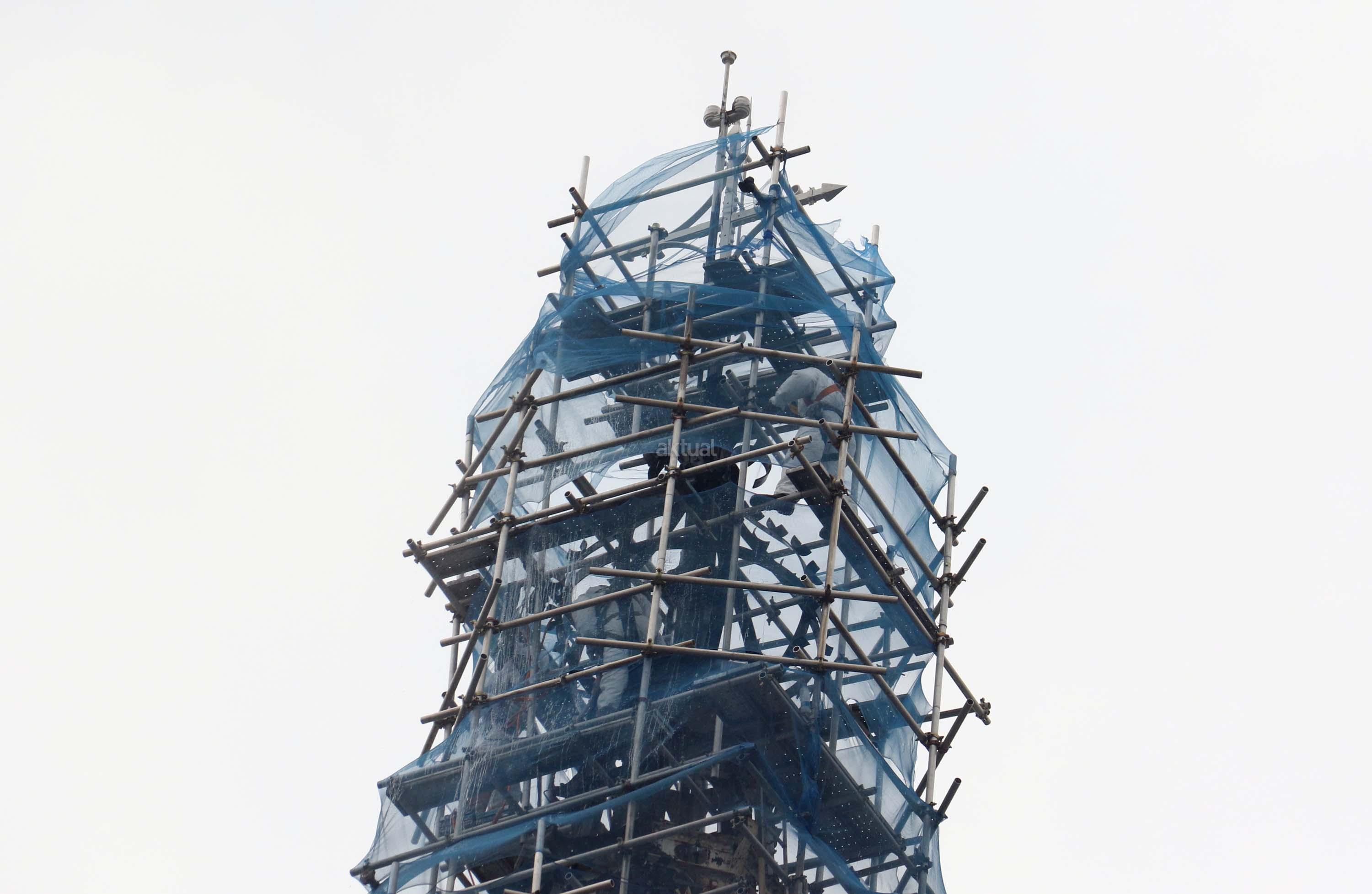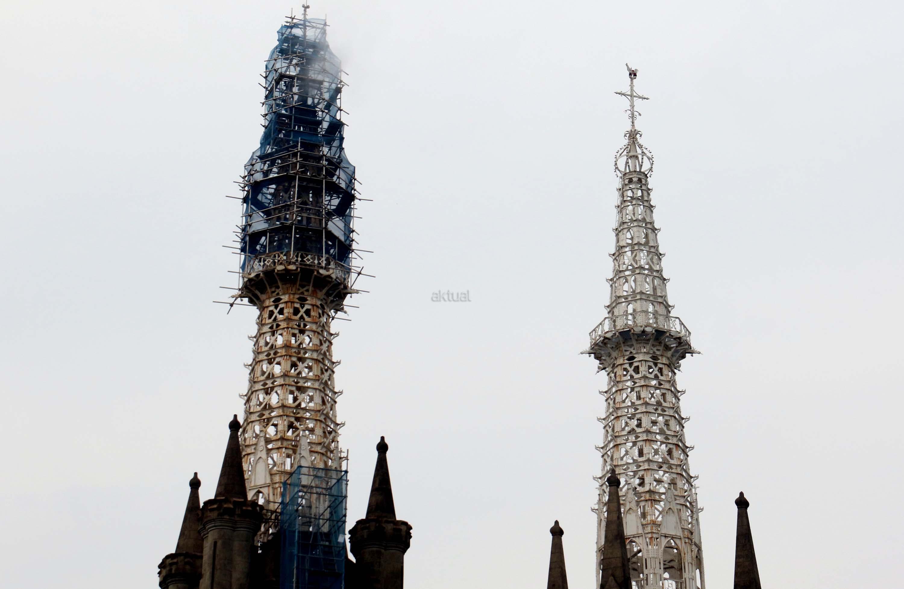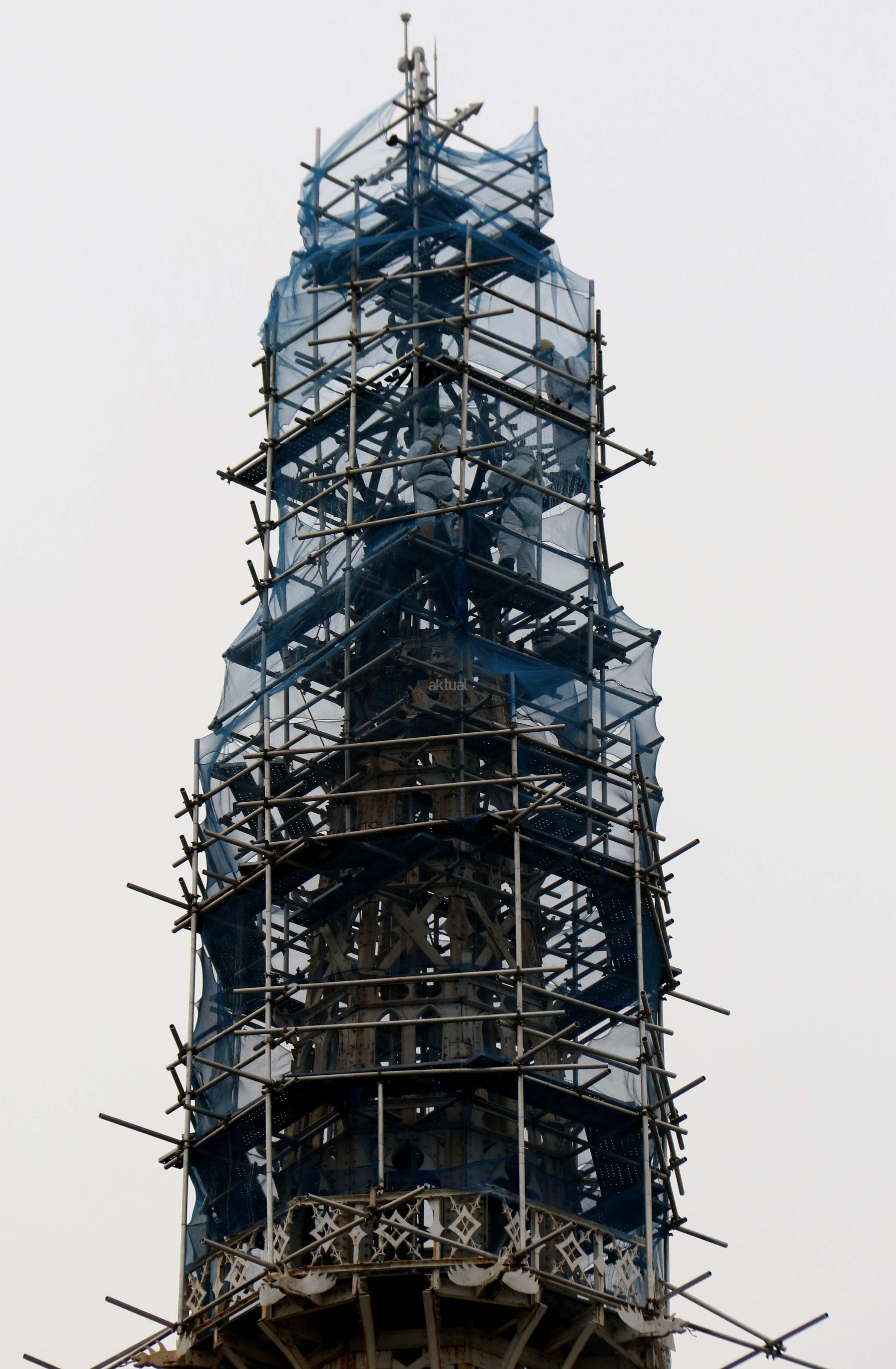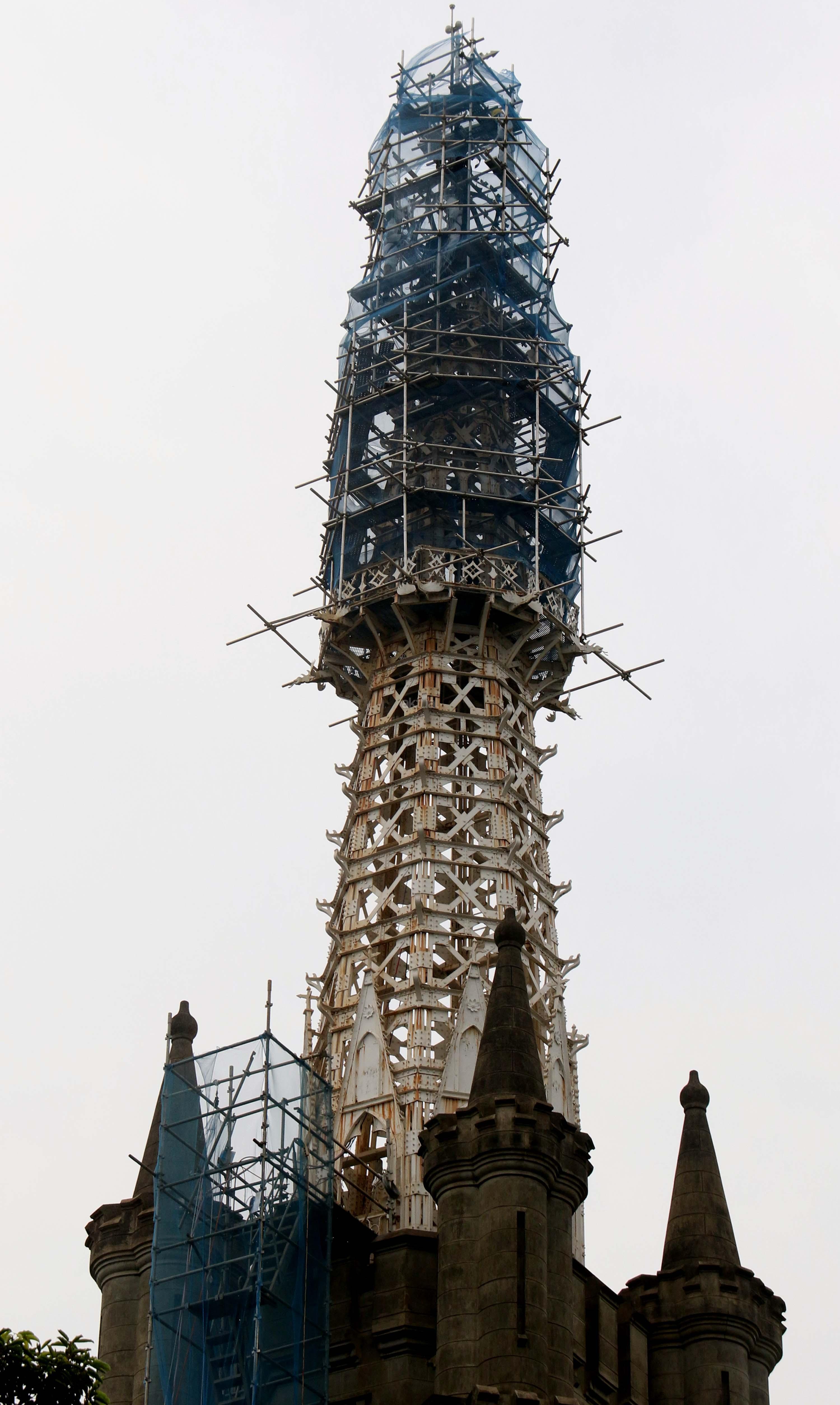 Pekerja melakukan proyek konservasi bagian menara Gereja Katedral Jakarta, Jumat (2/6/2017). Konservasi guna membersihkan, memelihara dan memperbaiki gereja berarsitektur neo-gothic yang merupakan cagar budaya di Jakarta. AKTUAL/Munzir