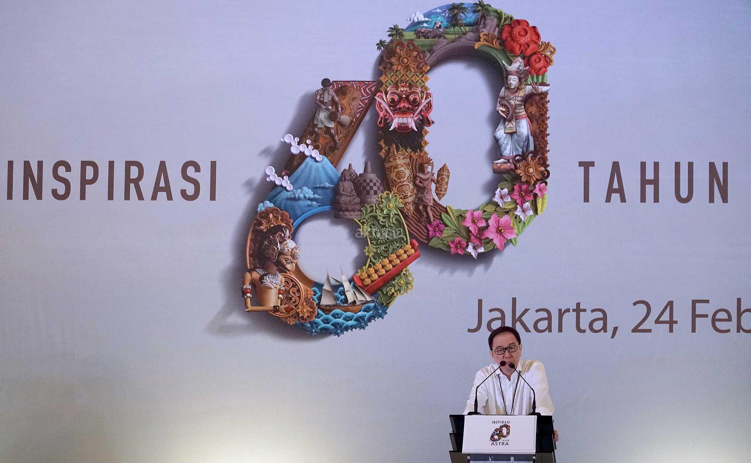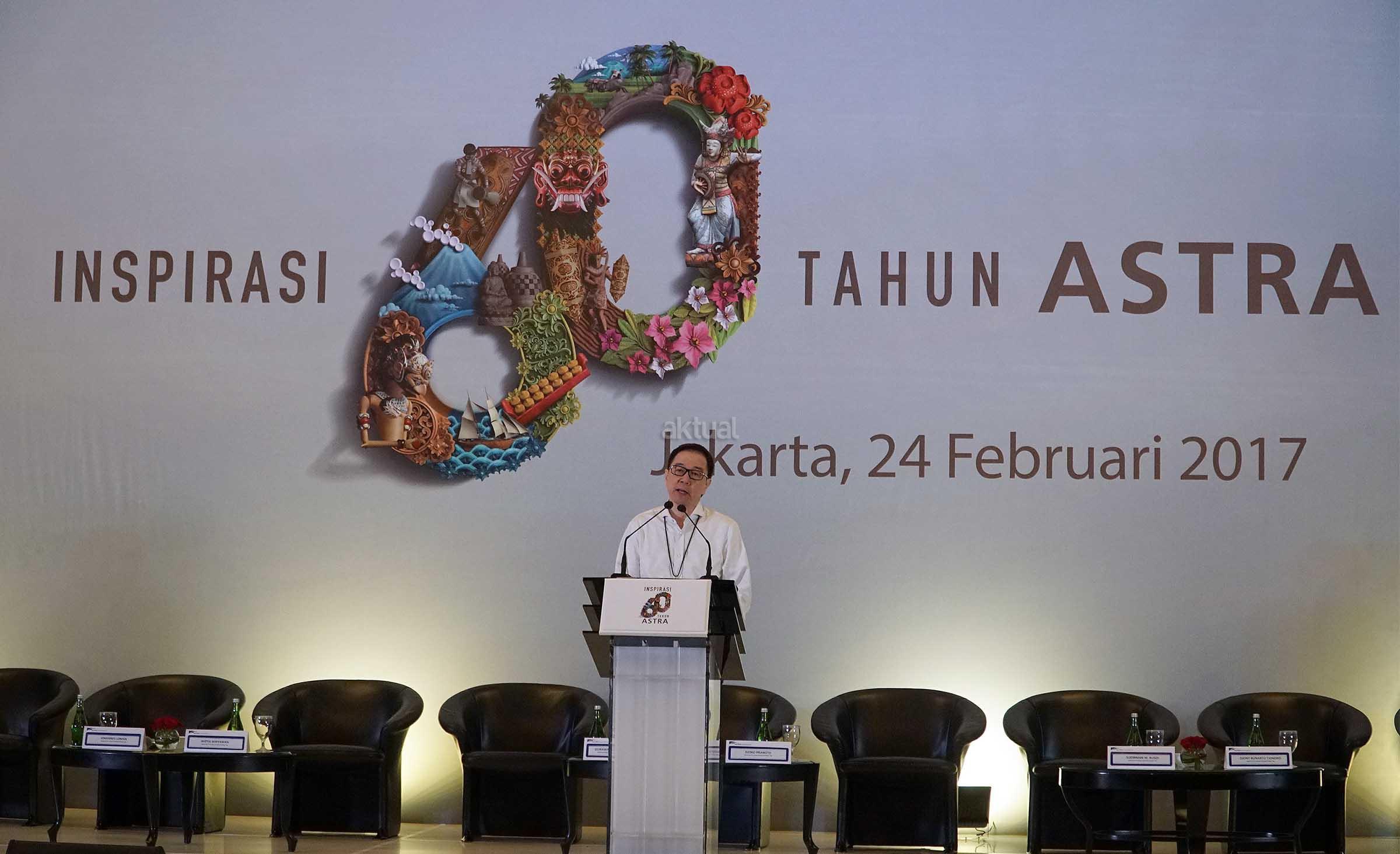 Presiden Direktur PT Astra International Tbk Prijono Sugiarto saat memberikan sambutan pada acara Media Gathering HUT ke-60 Astra di Jakarta,Jumat (24/2).PT Astra International Tbk terus berupaya berkontribusi positif terhadap kemajuan bangsa di berbagai bidang, seiring dengan cita-cita perusahaan untuk sejahtera bersama bangsa. Selama 60 tahun kehadirannya di tengah-tengah masyarakat Indonesia, Astra telah menjadi bagian dari dinamika kehidupan sosial ekonomi masyarakat Indonesia.Komitmen tersebut ditegaskan kembali dalam peringatan HUT ke-60 Astra dengan tema “Berbagi Inspirasi Membangun Bangsa.” Selama 6 dekade, Astra tumbuh dan berkembang bersama bangsa sebagai wujud nyata dari filosofi Astra untuk terus memberikan manfaat bagi banyak orang. Nilai ini yang membuat usaha Astra berkelanjutan, bahkan berkembang cukup signifikan hingga sekarang. AKTUAL/Eko S Hilman