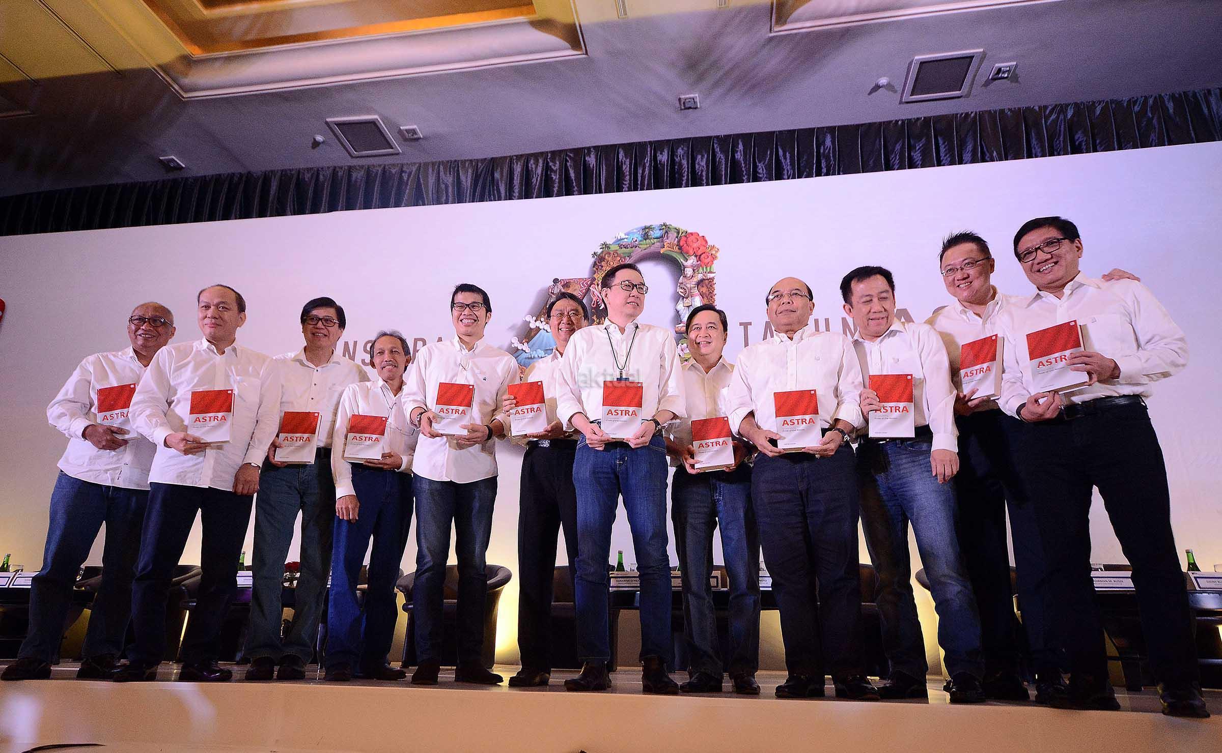 Presiden Direktur PT Astra International Tbk Prijono Sugiarto (keenam dari kanan) bersama seluruh direksi Astra (kedua kiri – paling kanan) Suparno Djasmin, Johannes Loman, Widya Wiryawan, Gidion Hasan, Gunawan Geniusahardja, Djoko Pranoto, Sudirman Maman Rusdi, Djony Bunarto, Chiew Sin Cheok dan Paulus Bambang Widjanarko serta Chief of Corporate Communications, Social Responsibility & Security Astra Pongki Pamungkas (paling kiri) menunjukkan buku bersampul merah putih yang menceritakan tentang praktik-praktik terbaik di Grup Astra selama enam dekade pada acara Media Gathering HUT ke-60 Astra di Jakarta, Jumat (24/2).PT Astra International Tbk terus berupaya berkontribusi positif terhadap kemajuan bangsa di berbagai bidang, seiring dengan cita-cita perusahaan untuk sejahtera bersama bangsa. Selama 60 tahun kehadirannya di tengah-tengah masyarakat Indonesia, Astra telah menjadi bagian dari dinamika kehidupan sosial ekonomi masyarakat Indonesia.Komitmen tersebut ditegaskan kembali dalam peringatan HUT ke-60 Astra dengan tema “Berbagi Inspirasi Membangun Bangsa.” Selama 6 dekade, Astra tumbuh dan berkembang bersama bangsa sebagai wujud nyata dari filosofi Astra untuk terus memberikan manfaat bagi banyak orang. Nilai ini yang membuat usaha Astra berkelanjutan, bahkan berkembang cukup signifikan hingga sekarang. AKTUAL/Eko S Hilman