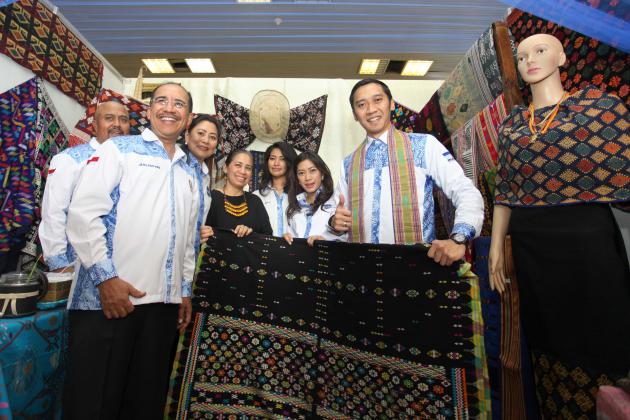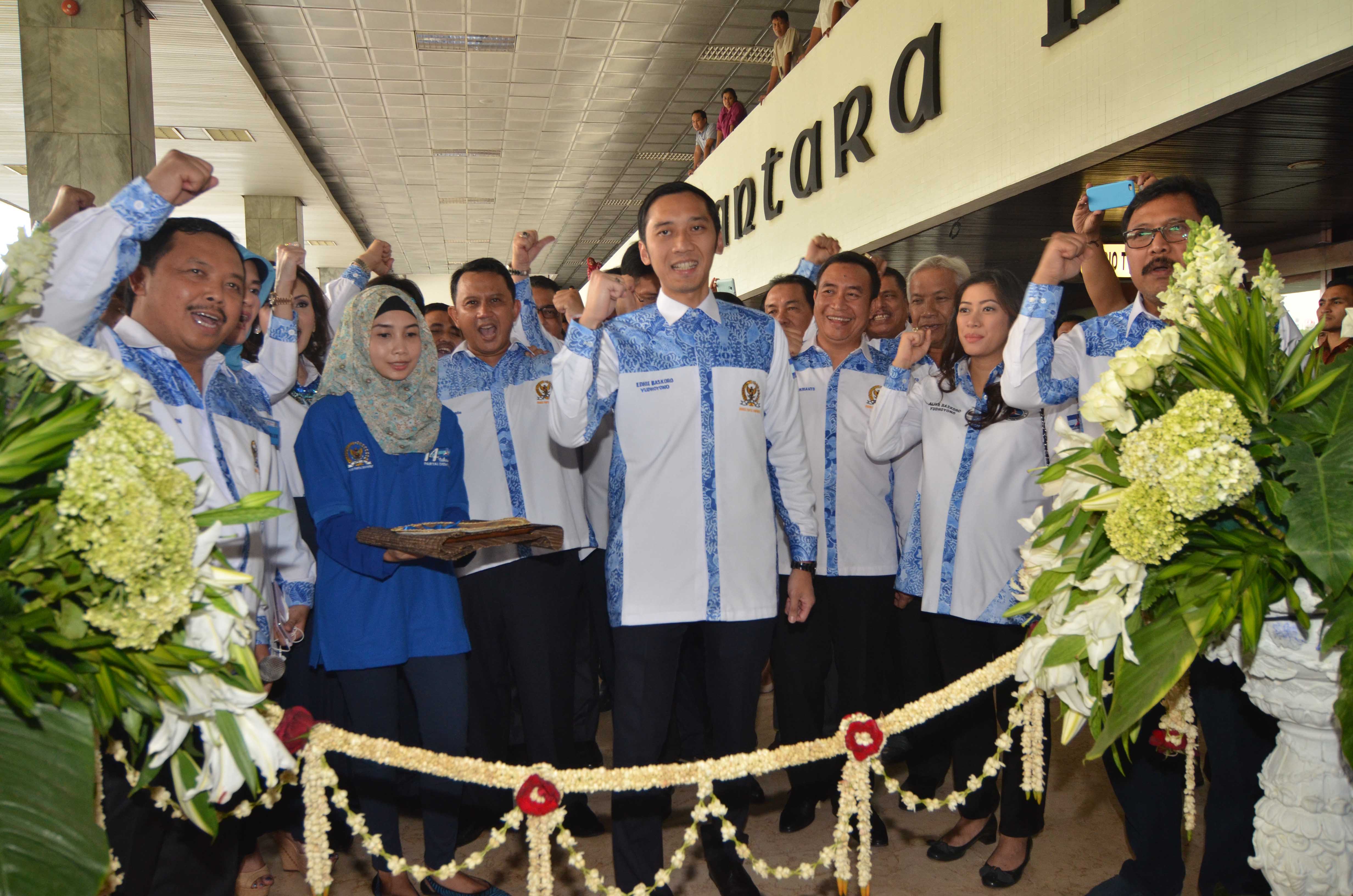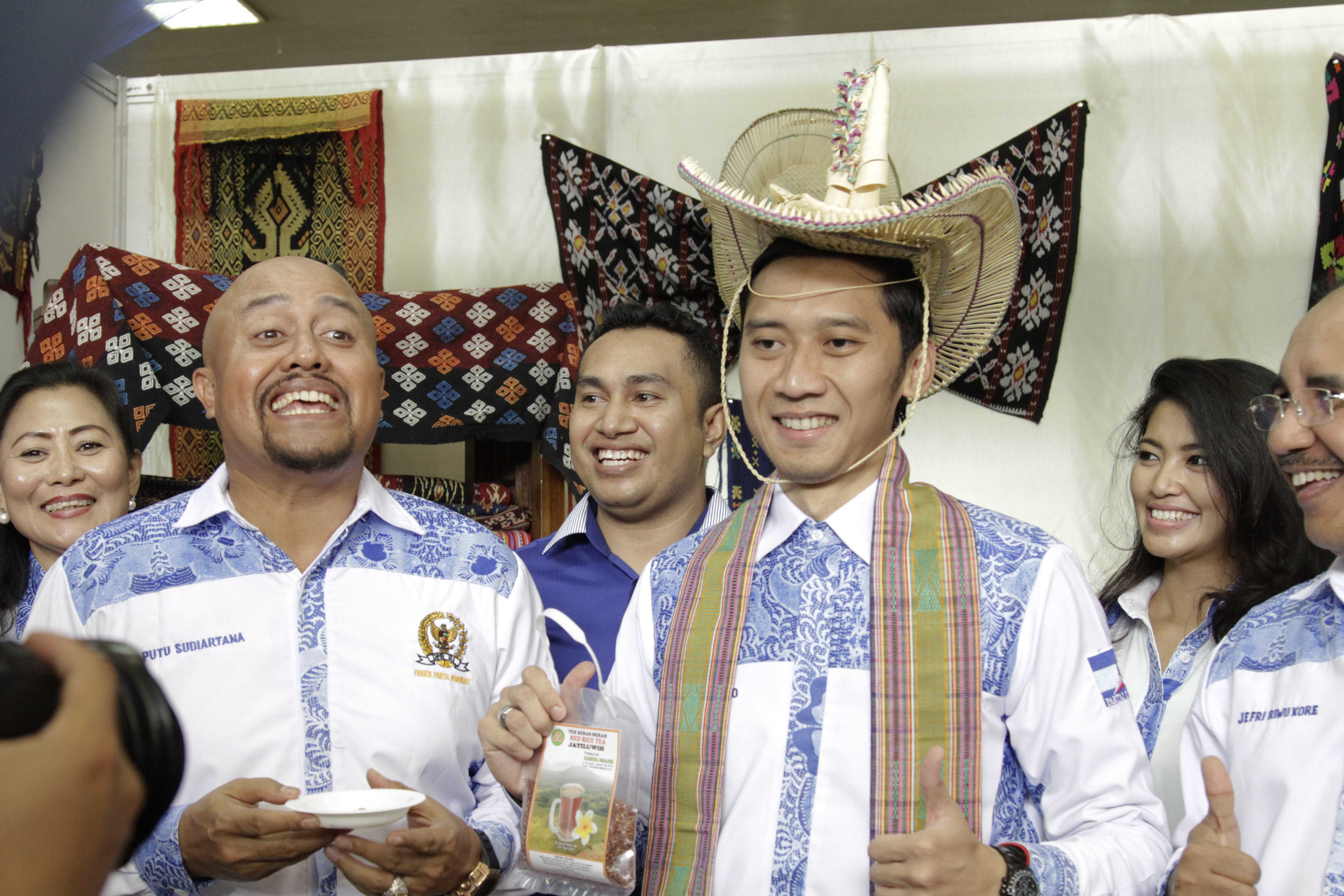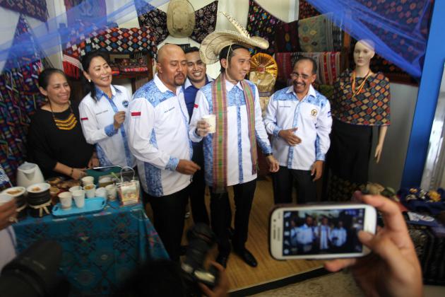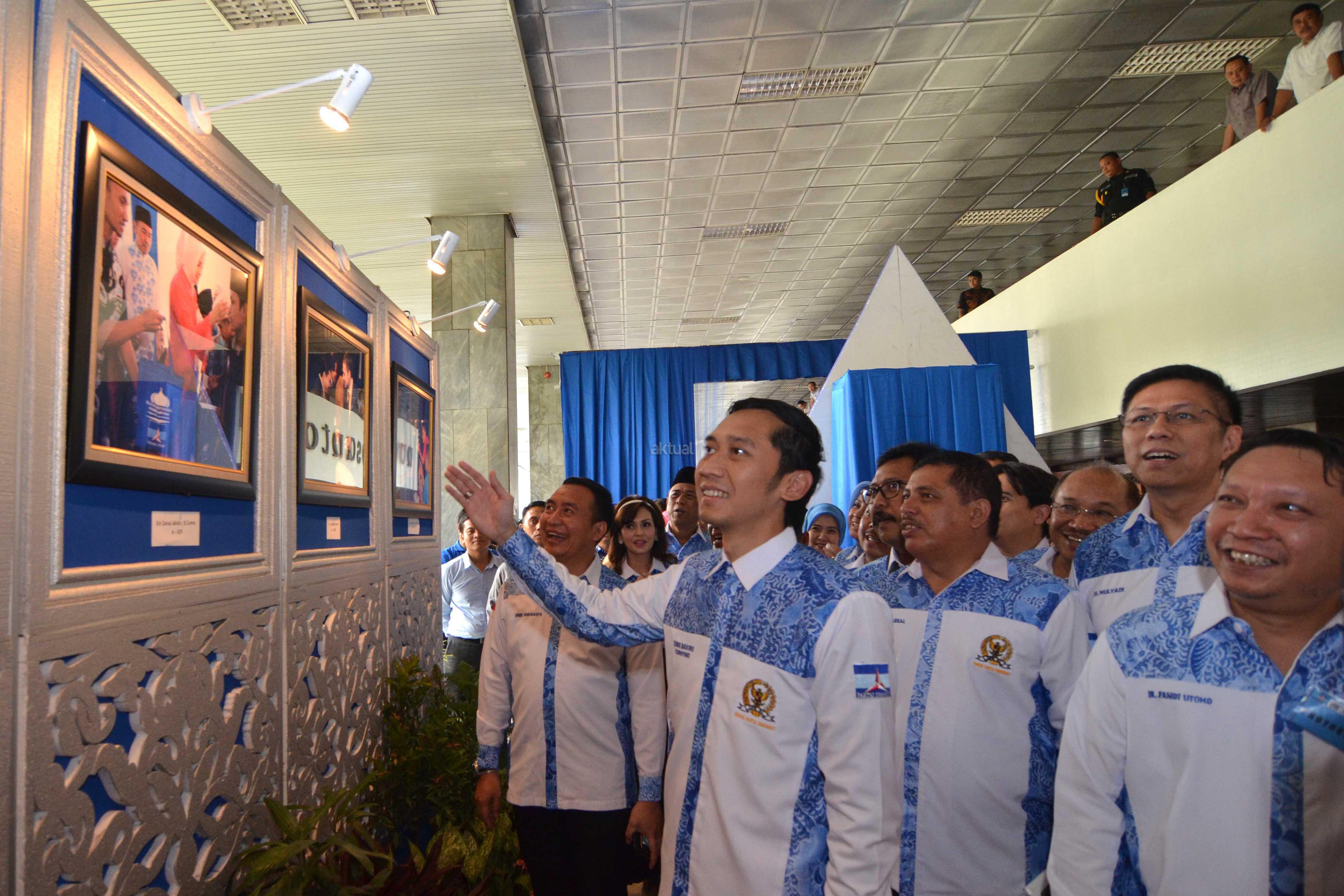 Ketua Fraksi Partai Demokrat, Edhie Baskoro Yudhoyono (tengah) bersama sejumlah Politisi Partai Demokrat membuka Pameran Foto dalam rangkaian perayaan ulang tahun Partai Demokrat ke-14 di Kompleks Parlemen Senayan, Jakarta, Selasa (8/9/2015). Dalam pameran tersebut Fraksi Partai demokrat (FDP) juga menggelar agenda futsal persahabatan, serta pameran produk-produk UMKM unggulan binaan PIA FPD RI.