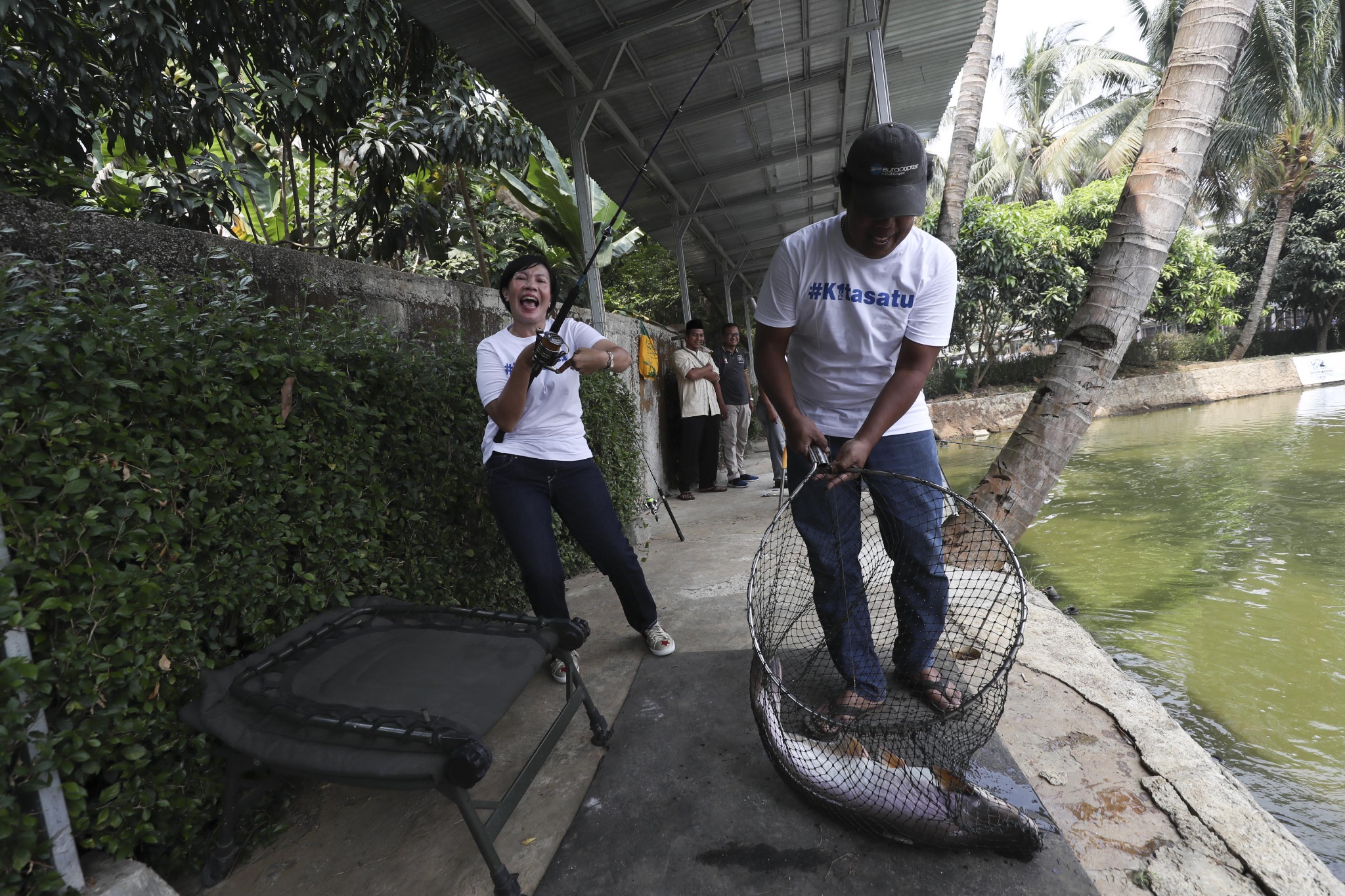 Kapolsek Beji Depok Kompol Yenny Anggreni Sihombing menarik ikan dalam acara HUT ke 1 Jurnalis Mancing Indonesia (JMI) di pemencingan Deluna, Depok, Jawa Barat pada Minggu (26/8). Sebanyak 120 orang dari 60 media dan 20 orang dari korporasi tersebut meramaikan perlombaan mancing yang merebutkan total sebesar Rp 10 juta. AKTUAL/Dok JMI
