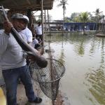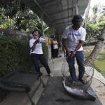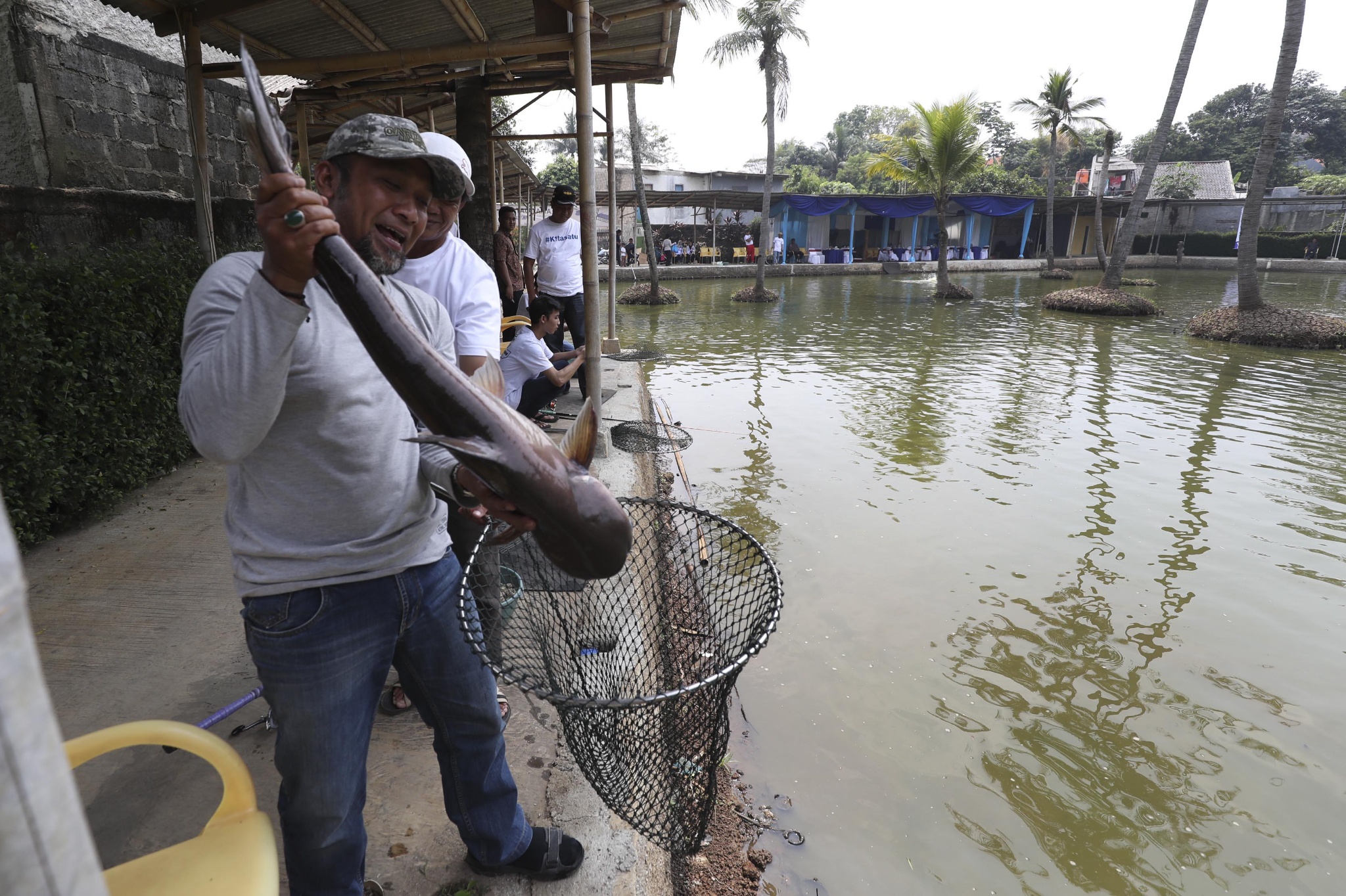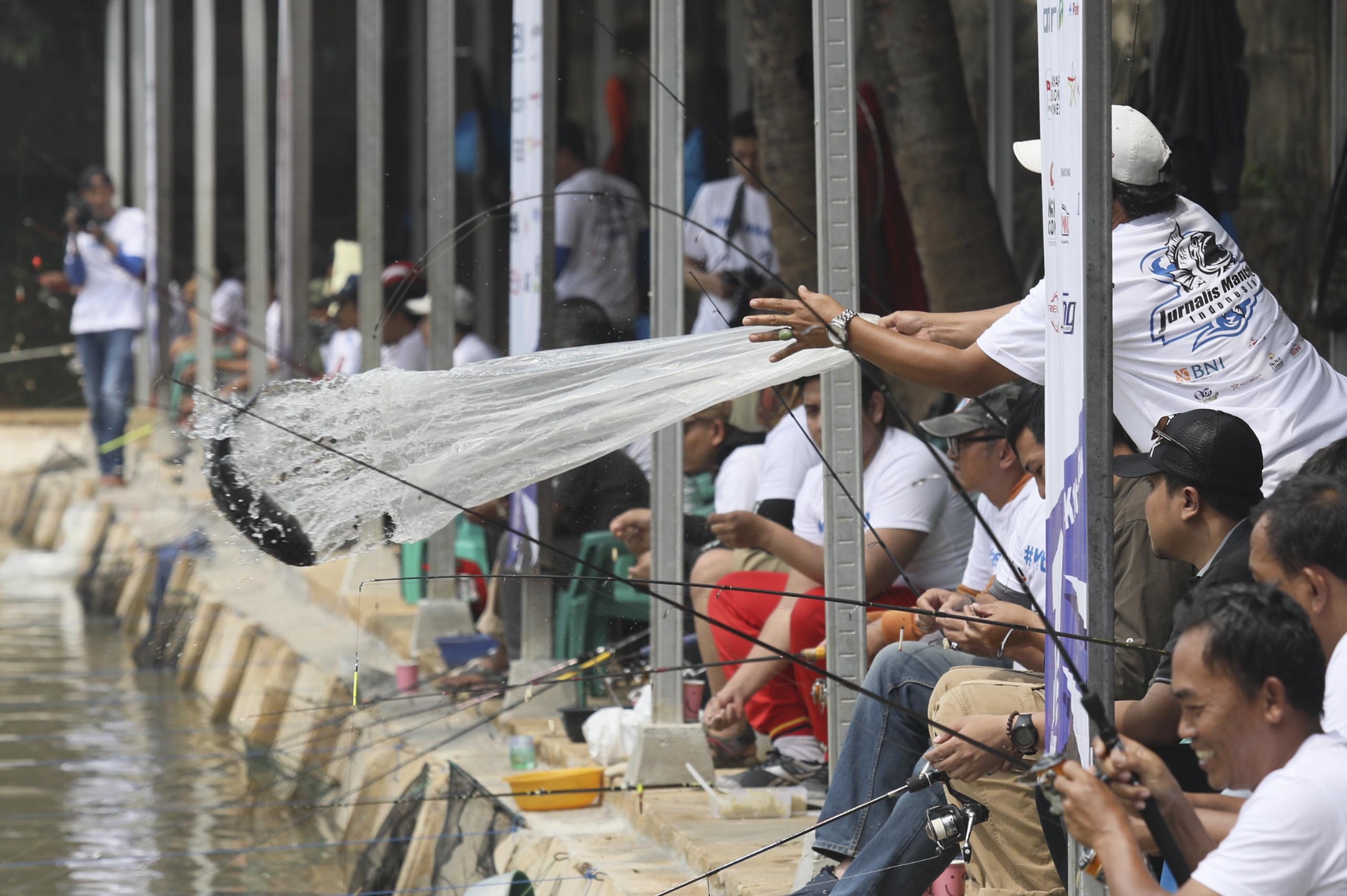 Petugas melemparkan ikan induk untuk dipoerebutkan dalam acara HUT ke 1 Jurnalis Mancing Indonesia (JMI) di pemencingan Deluna, Depok, Jawa Barat pada Minggu (26/8). Sebanyak 120 orang dari 60 media dan 20 orang dari korporasi tersebut meramaikan perlombaan mancing yang merebutkan total sebesar Rp 10 juta. AKTUAL/Dok JMI
