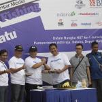 Ketua JMI Folber Silagan (kedua kiri) memberikan nasi tumpeng kepada Pembina Jurnalis Mancing Indonesia (JMI) Pratama D. Persadha (tengah) disaksikan Kapolres Depok Kombes Pol Didik Sugiarto (kedua kiri), Perwakilan dari BNI Christoper (ketiga kanan), Pembina JMI Hendra Suhara (kanan), Ketua HUT JMI Aji Atmoko (kiri) dan anggota JMI Catur (kedua kanan) dalam acara HUT ke 1 Jurnalis Mancing Indonesia (JMI) di pemencingan Deluna, Depok, Jawa Barat pada Minggu (26/8). Sebanyak 120 orang dari 60 media dan 20 orang dari korporasi tersebut meramaikan perlombaan mancing yang merebutkan total sebesar Rp 10 juta. AKTUAL/Dok JMI