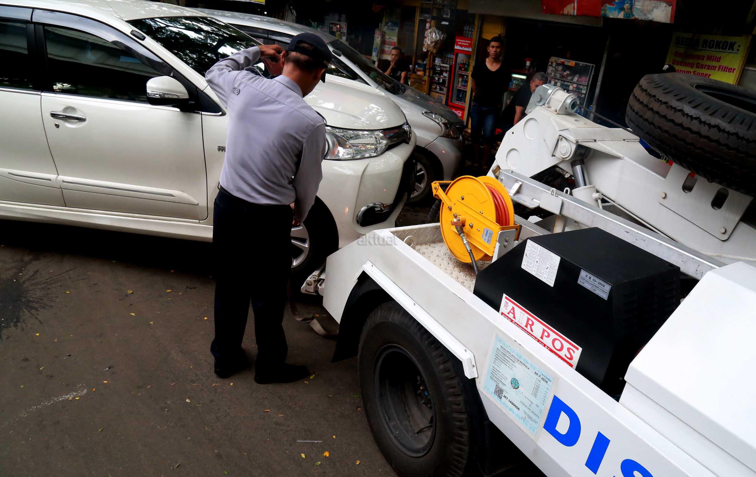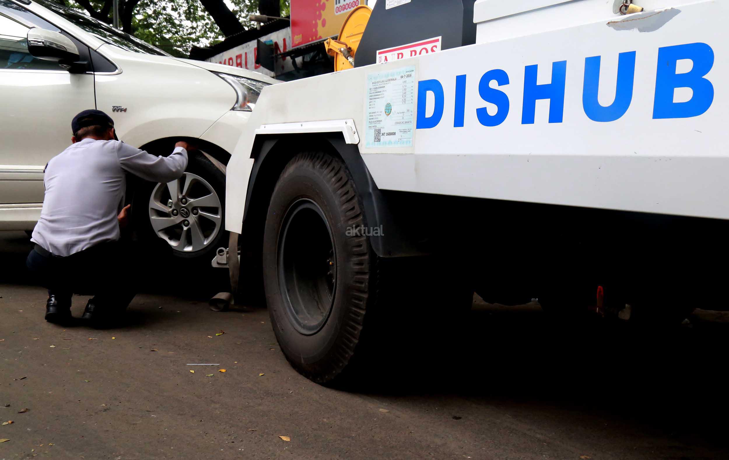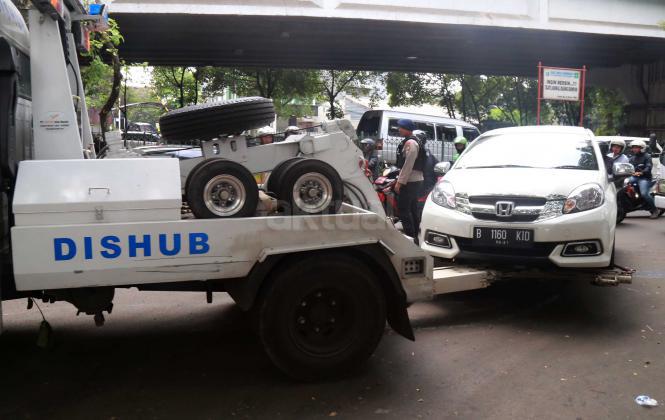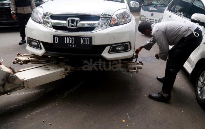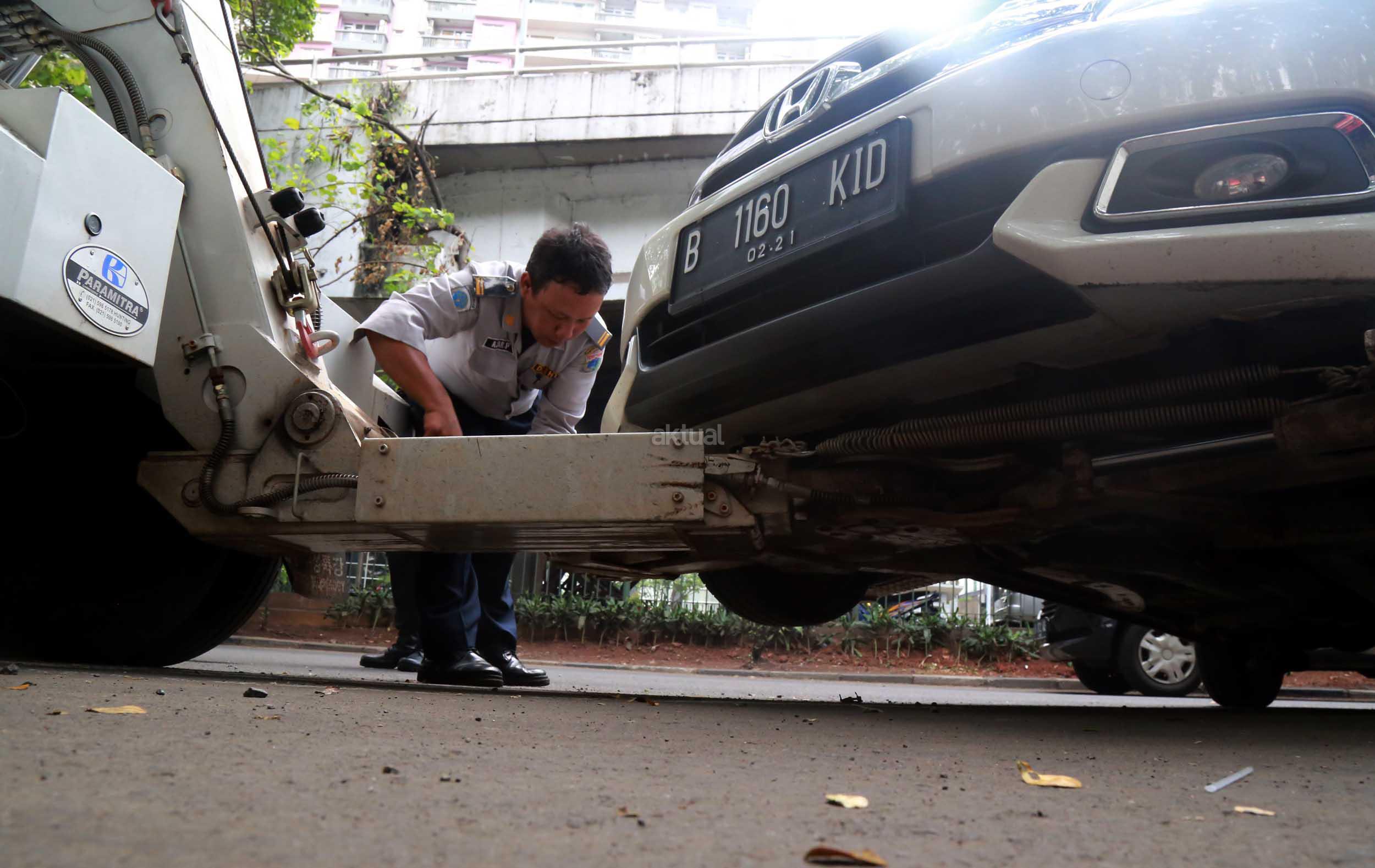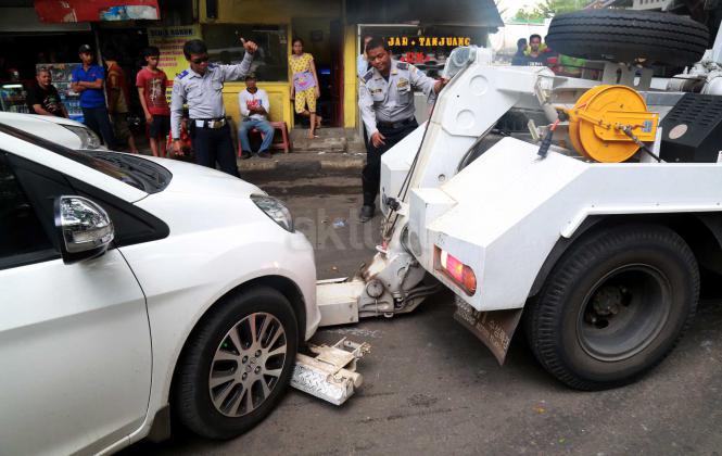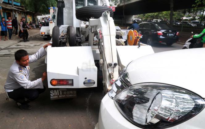 Petugas Dinas Perhubungan Provinsi DKI Jakarta bersama melakukan razia dan menderek mobil yang parkir di kawasan Jalan.Kasablanka, Jakarta, Kamis (21/4/2016).Dishub DKI Jakarta mengintensifkan razia mobil yang parkir di bahu jalan untuk mengantisipasi kemacetan serta sebagai sosialisasi kepada pengguna agar parkir di tempat yang telah disediakan.