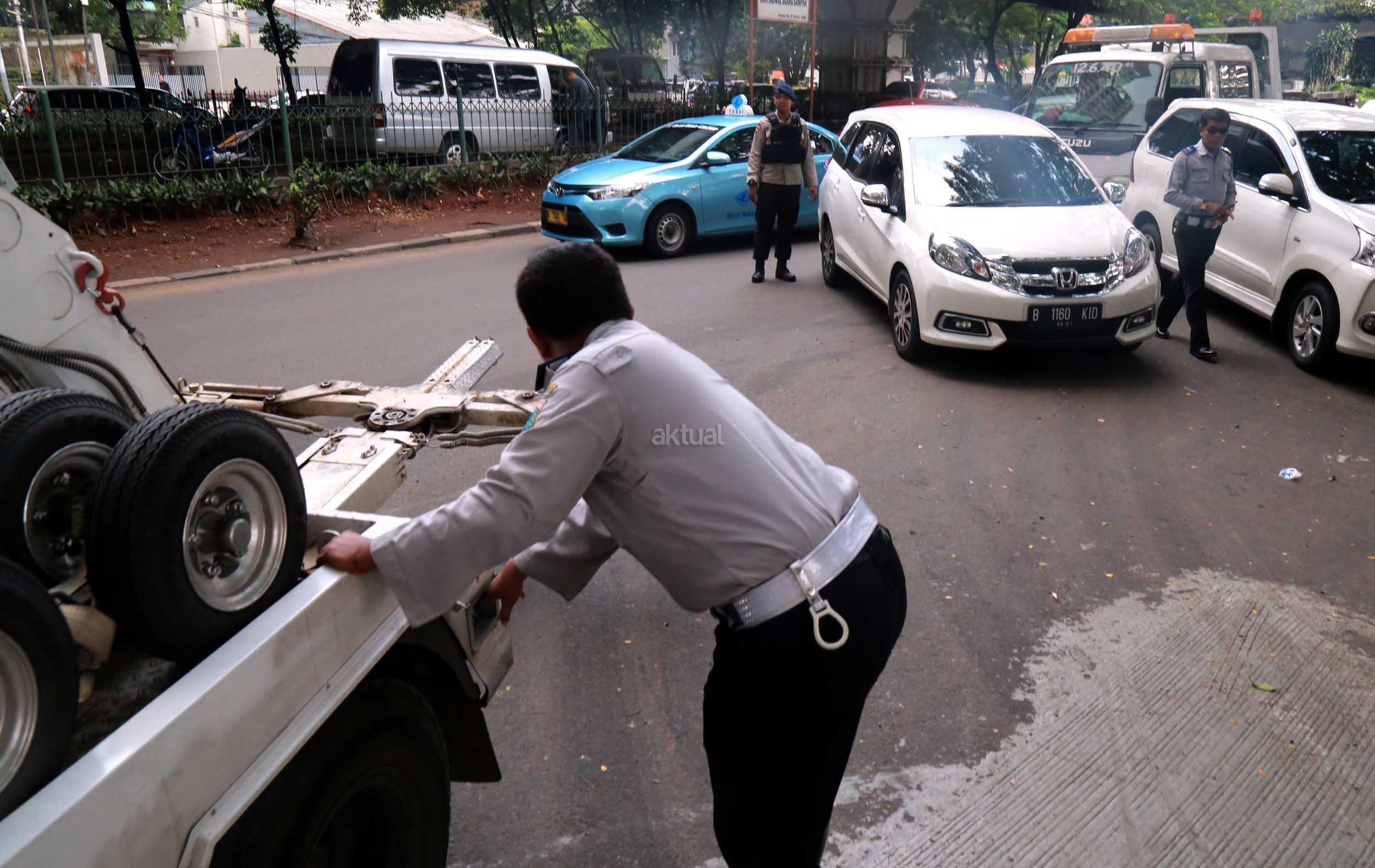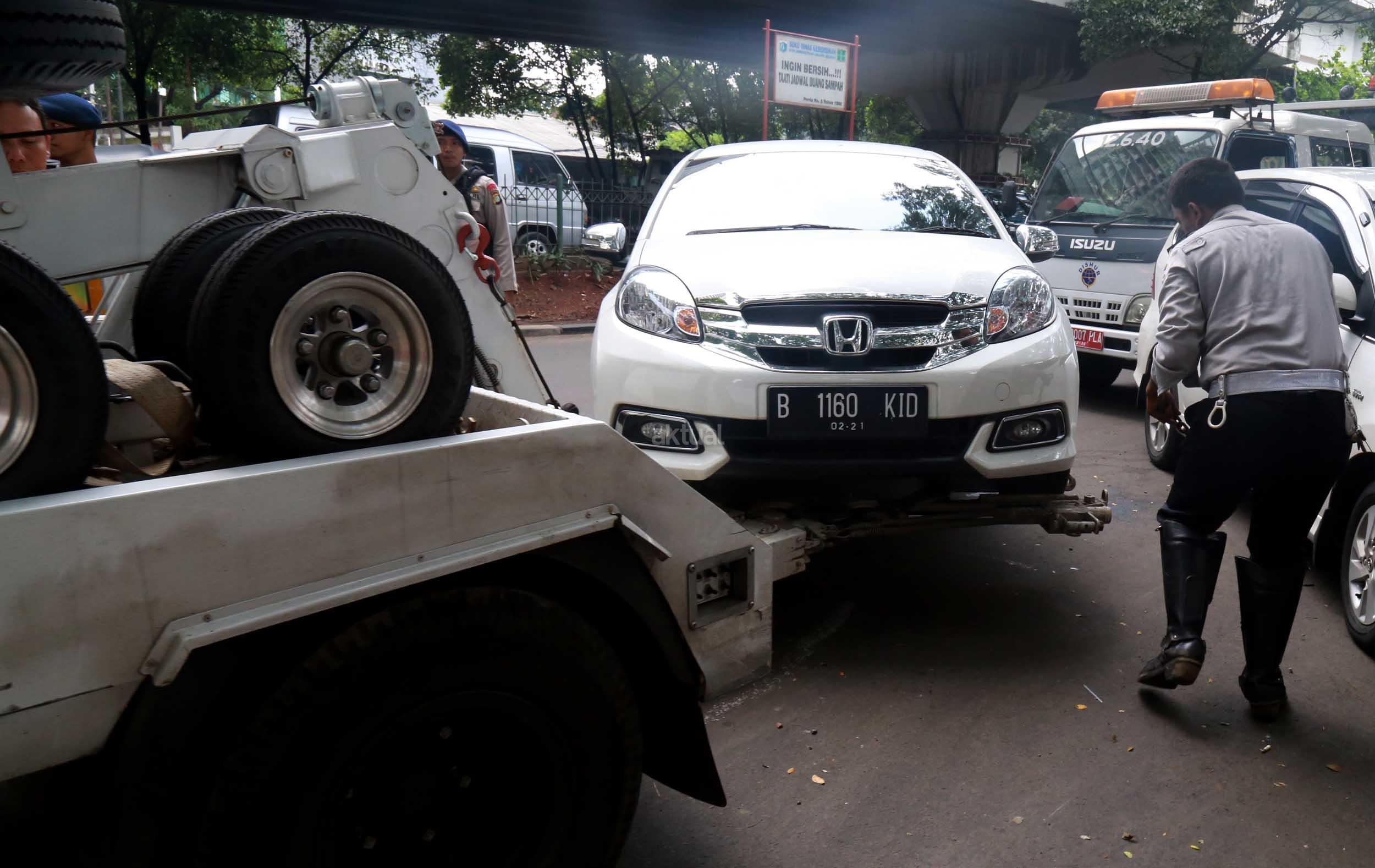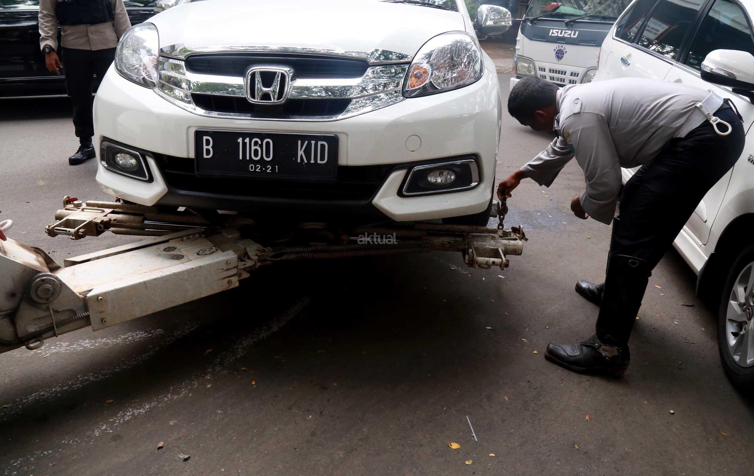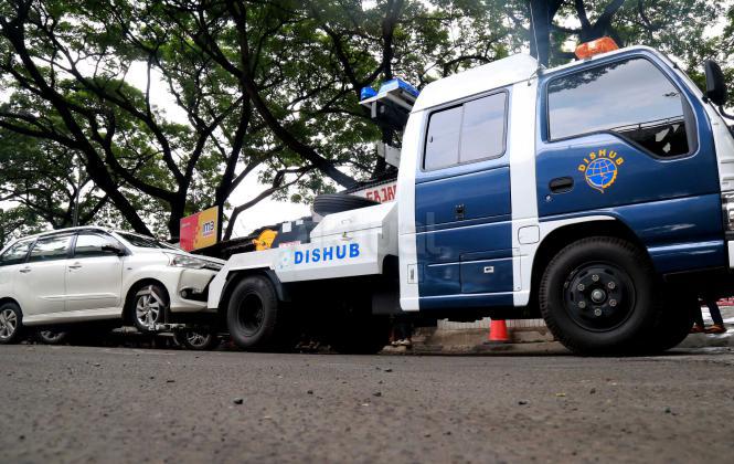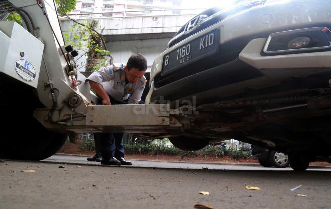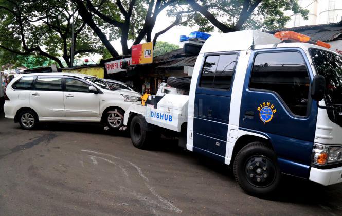 Petugas Dinas Perhubungan Provinsi DKI Jakarta bersama melakukan razia dan menderek mobil yang parkir di kawasan Jalan.Kasablanka, Jakarta, Kamis (21/4/2016).Dishub DKI Jakarta mengintensifkan razia mobil yang parkir di bahu jalan untuk mengantisipasi kemacetan serta sebagai sosialisasi kepada pengguna agar parkir di tempat yang telah disediakan.