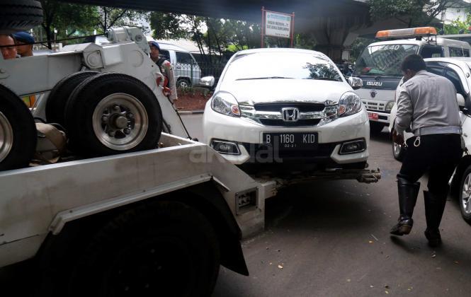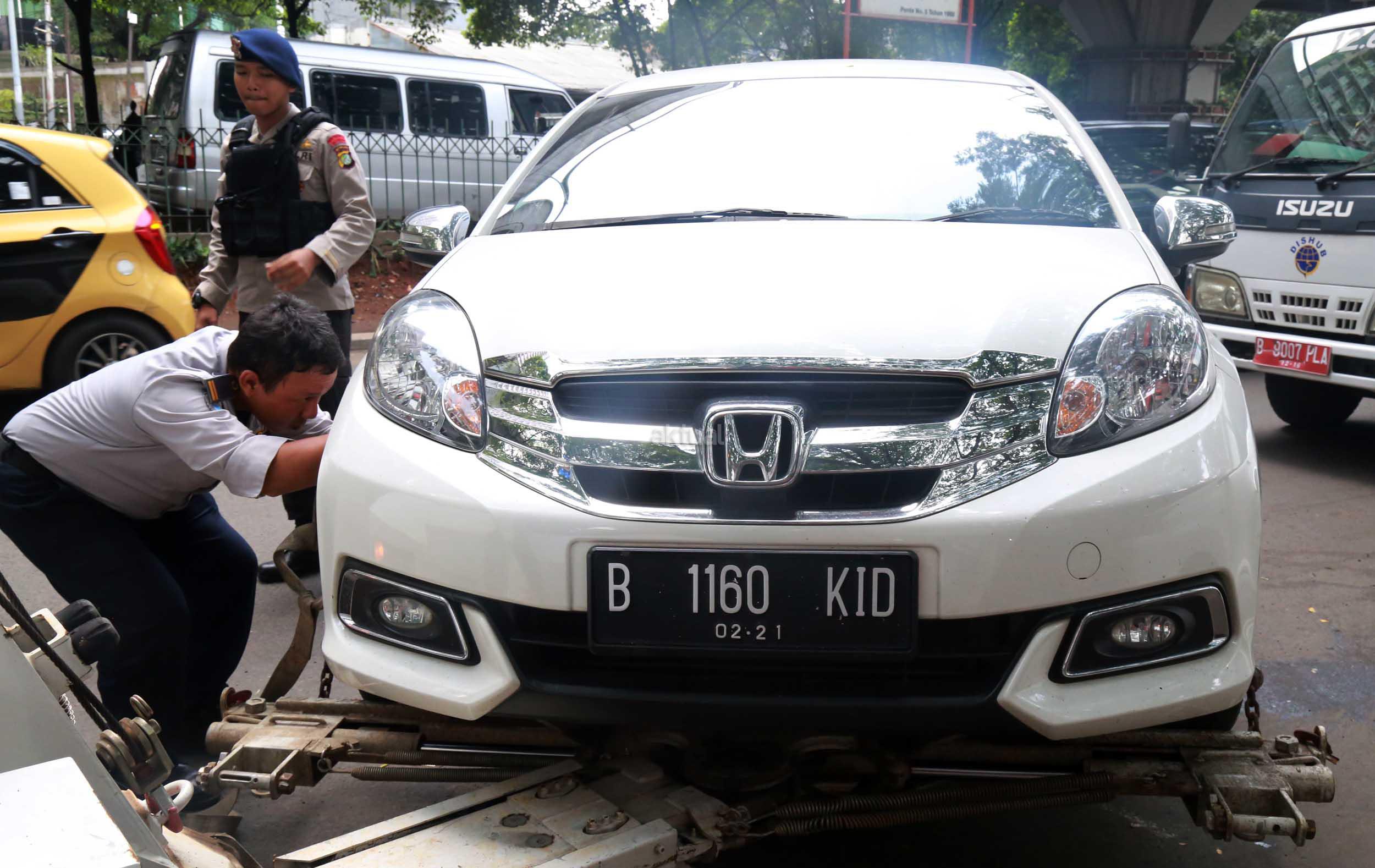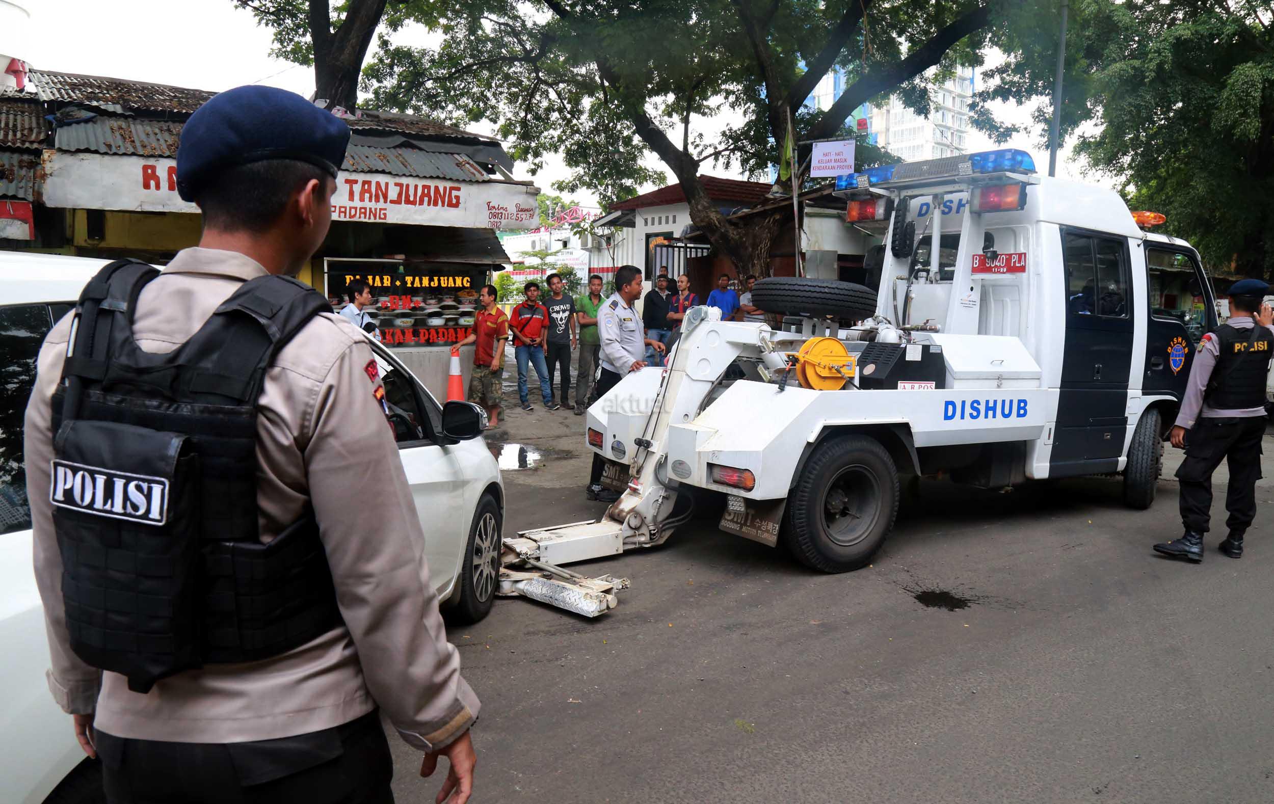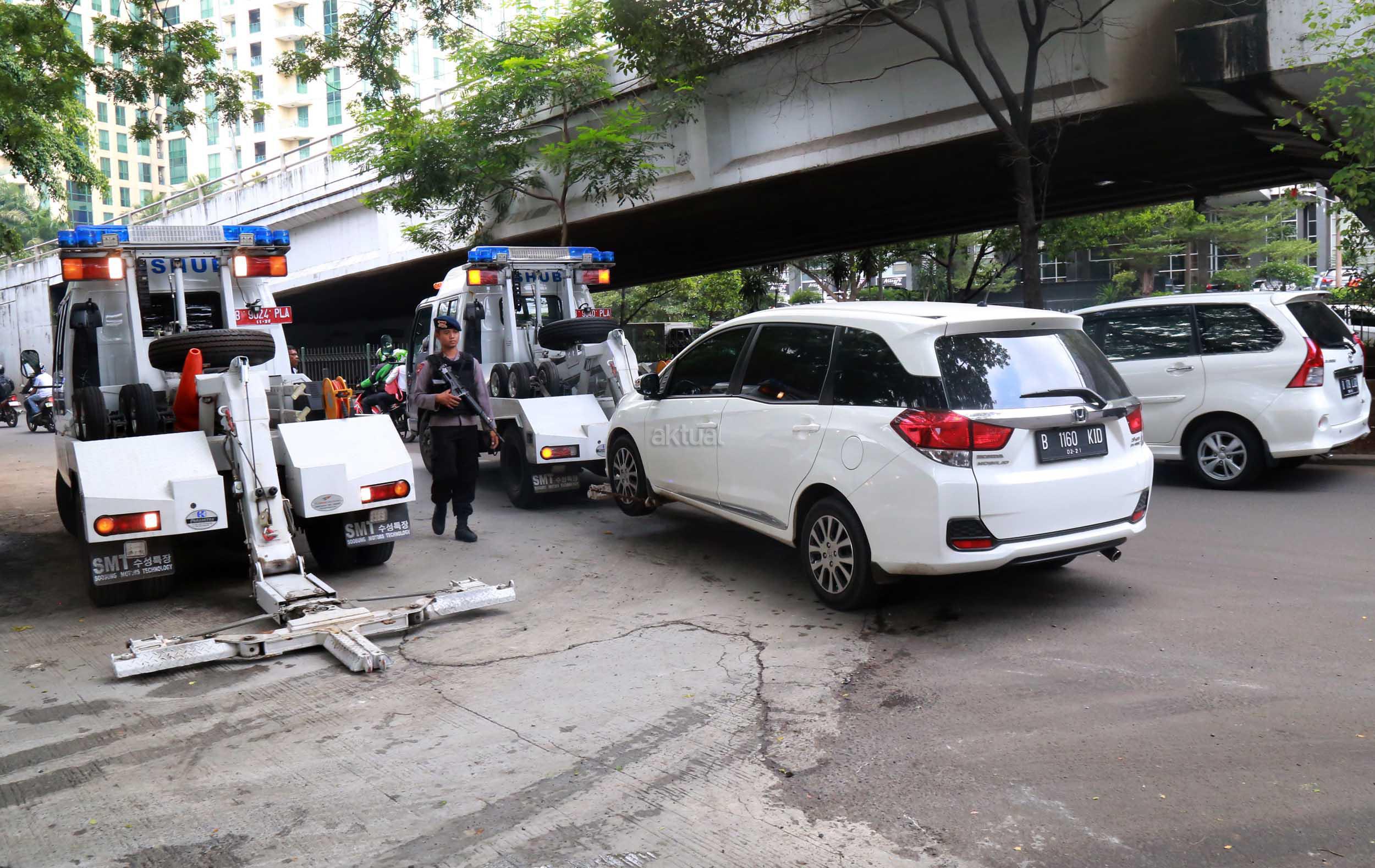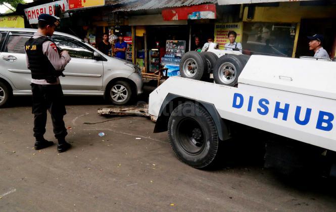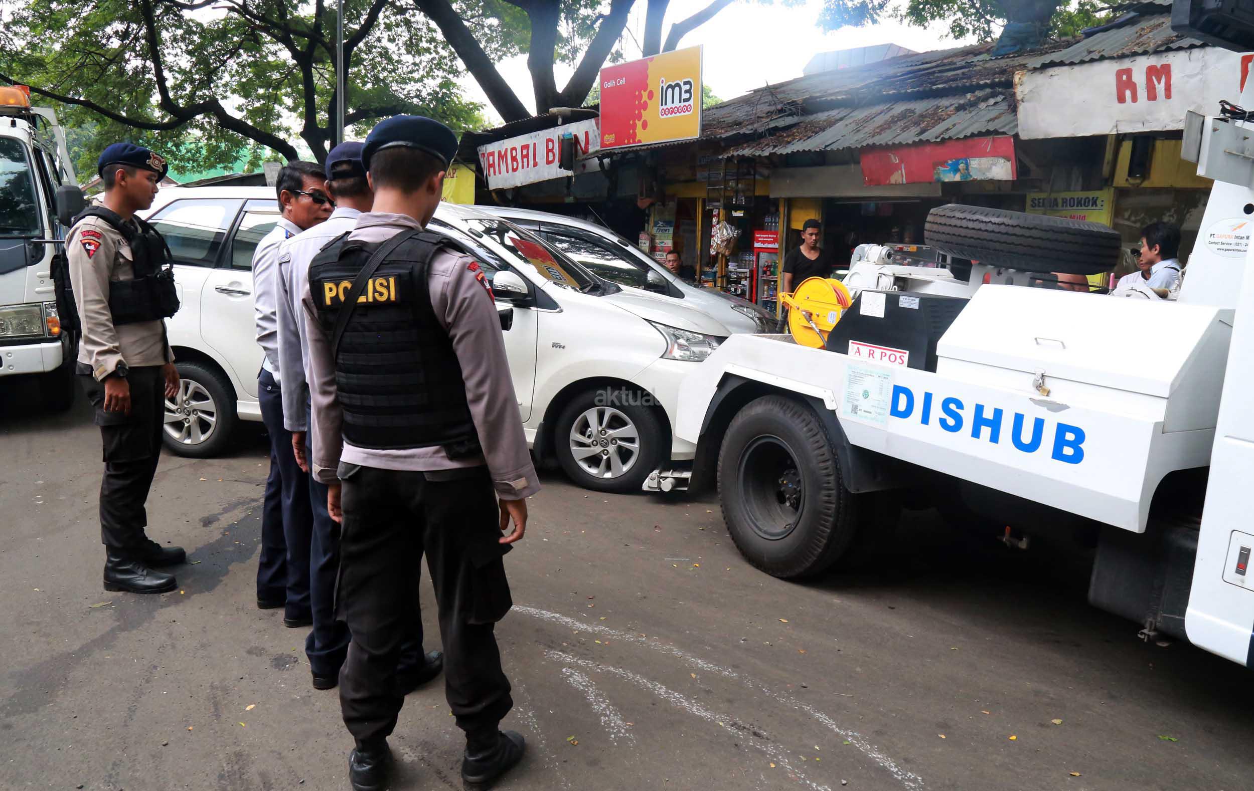 Petugas Dinas Perhubungan Provinsi DKI Jakarta bersama melakukan razia dan menderek mobil yang parkir di kawasan Jalan.Kasablanka, Jakarta, Kamis (21/4/2016).Dishub DKI Jakarta mengintensifkan razia mobil yang parkir di bahu jalan untuk mengantisipasi kemacetan serta sebagai sosialisasi kepada pengguna agar parkir di tempat yang telah disediakan.