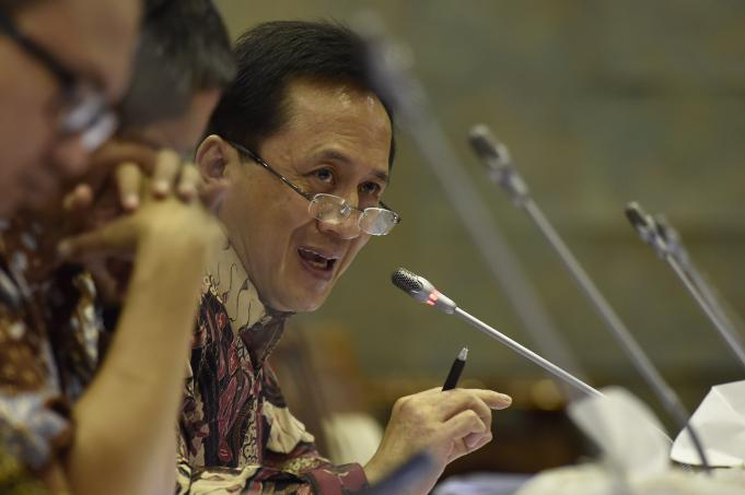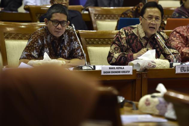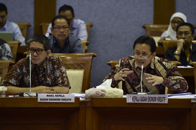 Kepala Badan Ekonomi Kreatif Triawan Munaf (kanan) menjawab pertanyaan anggota Komisi X saat rapat dengar pendapat (RDP) di Komplek Parlemen Senayan, Jakarta, Selasa (14/6). Rapat tersebut membahas RKA Kementerian/Lembaga dan RKP K/L tahun 2017. ANTARA FOTO/Puspa Perwitasari/ama/16