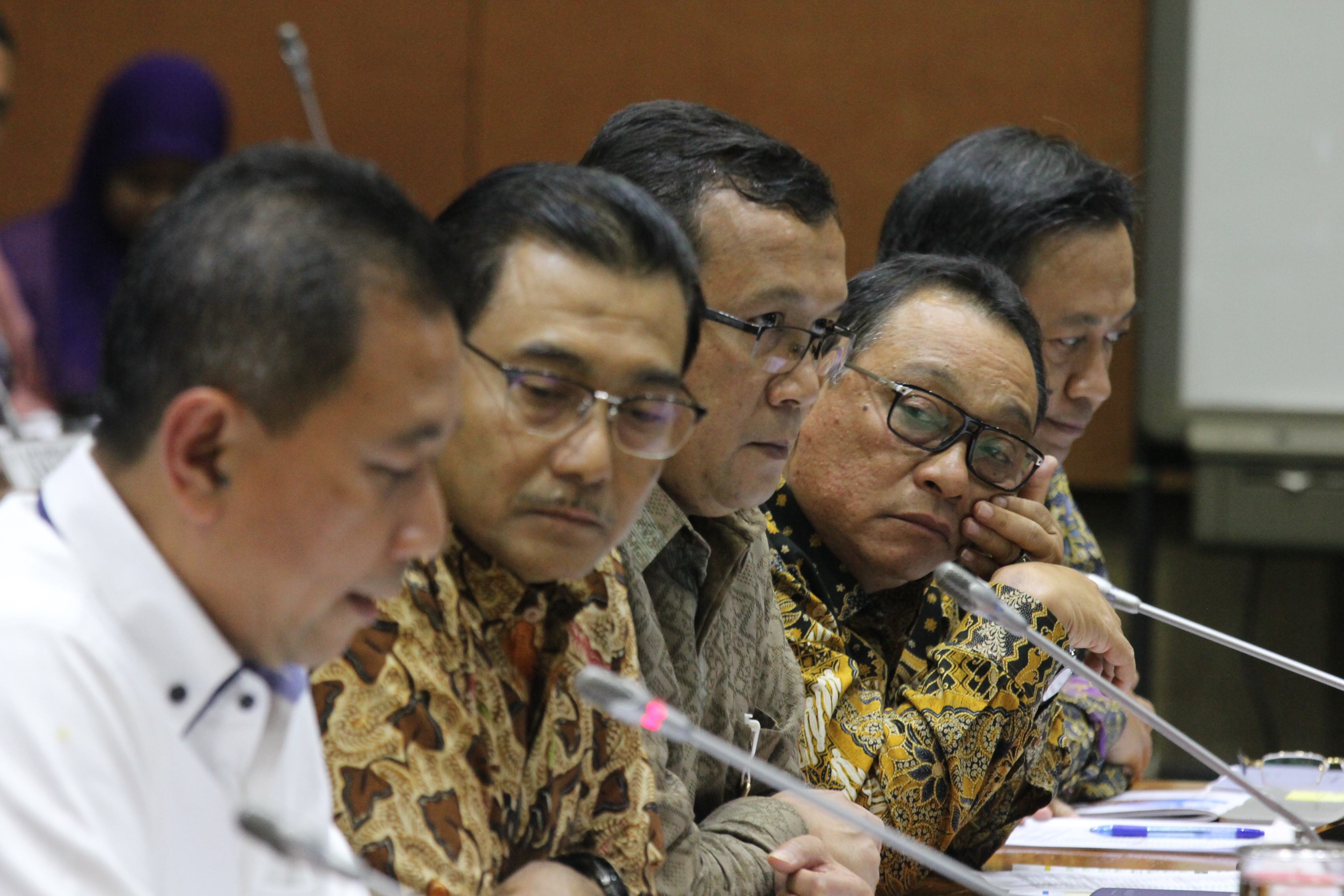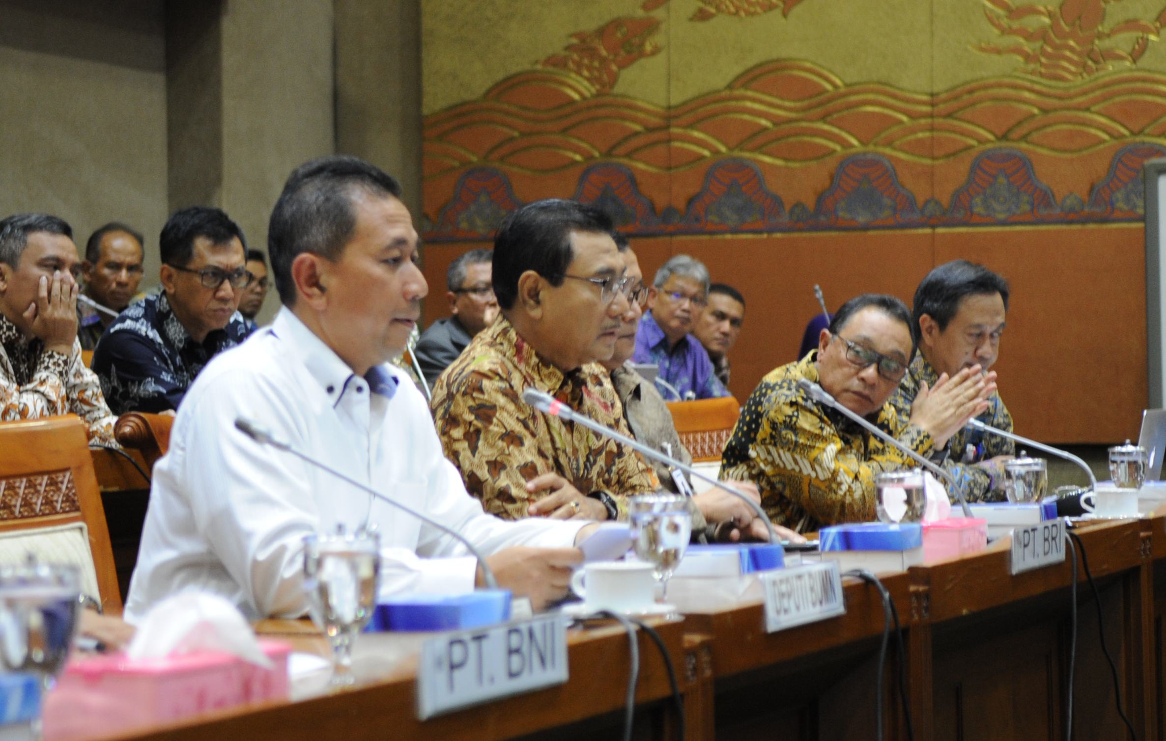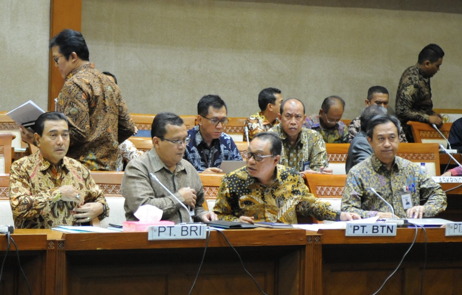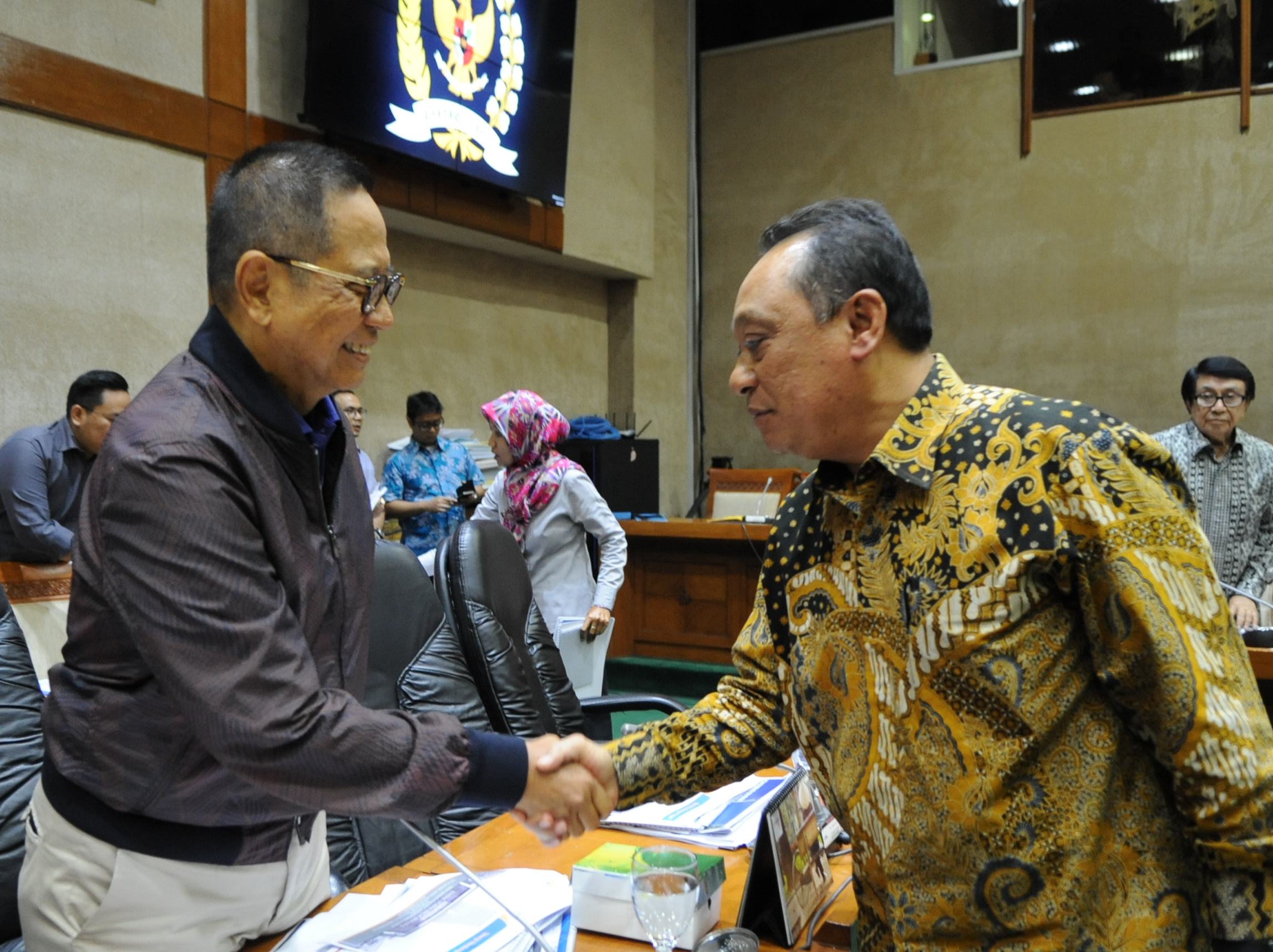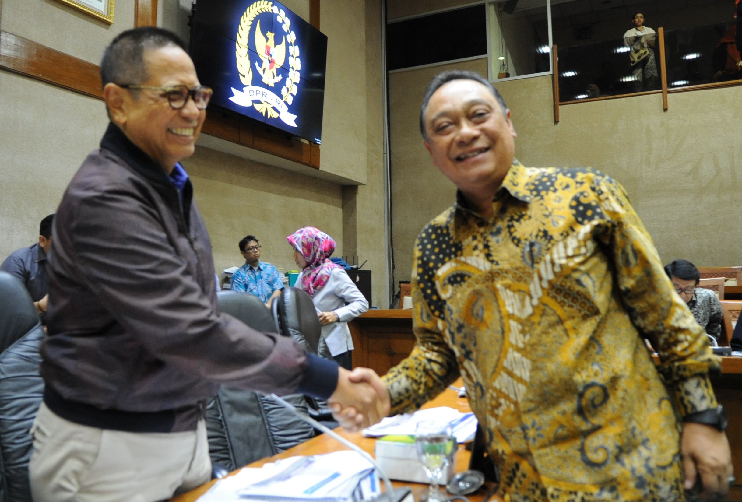 Pimpinan Komisi VI Dito Ganinduto berjabat tangan dengan Direktur Utama Bank BTN Maryono sebelum dimulainya RDP,  di gedung DPR,  Jakarta,  Kamis (6/9).  PT Bank Tabungan Negara (Persero) Tbk mengusulkan perkiraan besaran deviden perseroan sekitar 20% kepada pemerintah melalui Komisi VI DPR RI.  Usulan ini disampaikan oleh Direktur Utama BTN sekaligus Ketua Himpunan Bank Milik Negara (Himbara) Maryono dalam Rapat Dengar Pendapat antara Komisi VI DPR RI dengan Kementrian BUMN dan Bank-Bank BUMN. Usulan besaran deviden yang disampaikan BTN mempertimbangkan untuk menjaga komitmen perseroan dalam mendukung program sejuta rumah dan kecukupan modal perseroan. BTN tetap optimis kinerja perseroan on the track sampai dengan akhir tahun 2018 dan tidak terganggu dengan sentimen negatif yang diakibatkan oleh gejolak ekonomi dunia. AKTUAL/Eko S Hilman