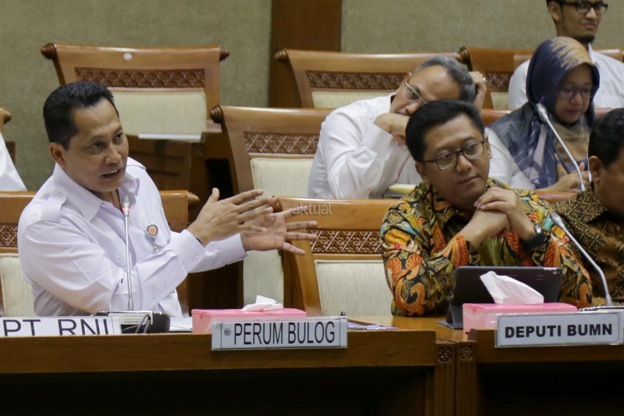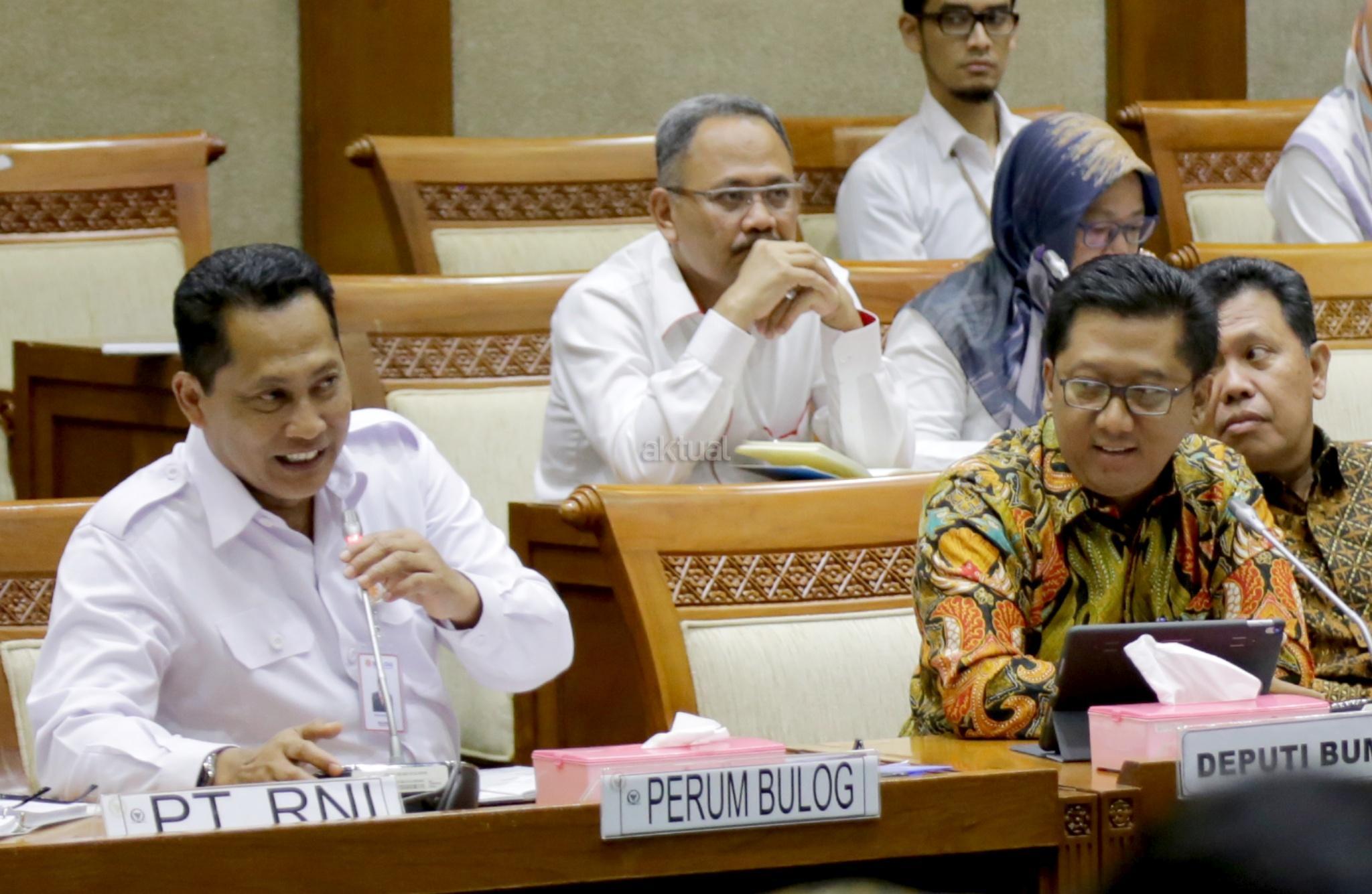 Dirut Bulog Budi Waseso (kiri) mengikuti rapat dengar pendapat (RDP) dengan Komisi VI DPR di Kompleks Parlemen, Senayan, Jakarta, Senin (21/5). Rapat perdana antara Budi Waseso yang baru diangkat sebagai Dirut Bulog dengan DPR itu membahas ketersediaan stok serta stabilitas harga pangan di bulan Ramadhan sekaligus menjelang Idul Fitri. AKTUAL/Tino Oktaviano