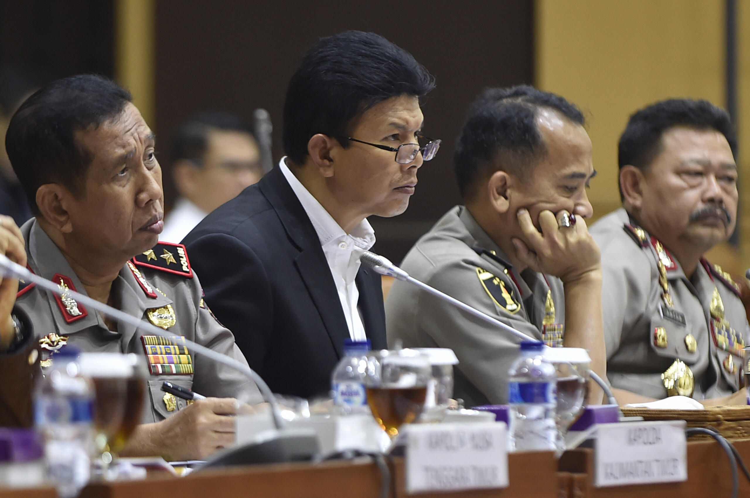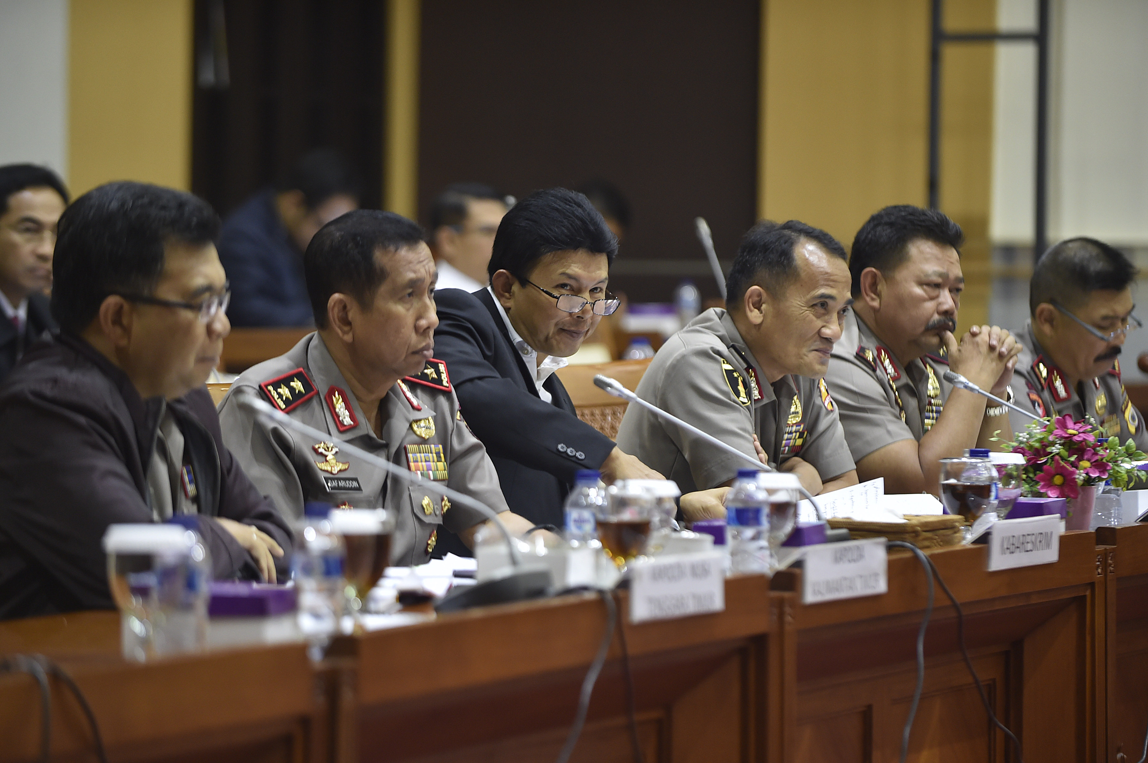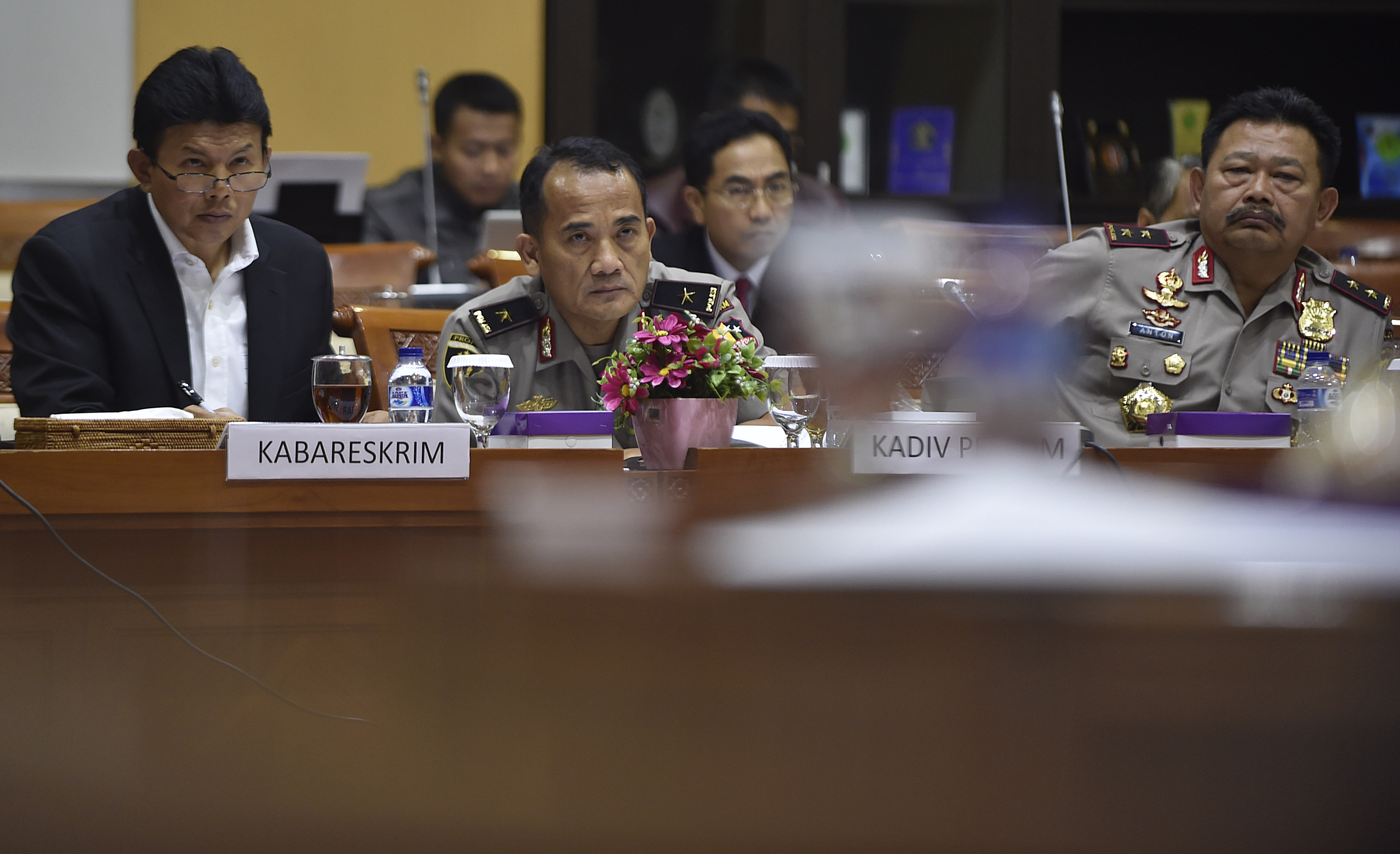 Kabareskrim Komjen Pol Ari Dono Sukmanto (kiri) didampingi Kadiv Propam Mabes Polri Irjen Pol Mochamad Iriawan (tengah) dan Kapolda Jatim Irjen Pol Anton Setiadji mendengarkan pertanyaan anggota Komisi III dalam rapat dengar pendapat umum (RDPU) di Komplek Parlemen Senayan, Jakarta, Selasa (26/7). Panja Penegakan Hukum Komisi III mengundang Kabareskrim dan empat Kapolda dalam rangka membahas kasus di pusat dan daerah, diantaranya penggeledahan kasus suap yang tidak jelas tindakannya dan 43 ribu kasus yang hilang di jalan tidak dilaporkan pada penuntut umum. ANTARA FOTO/Puspa Perwitasari/foc/16.