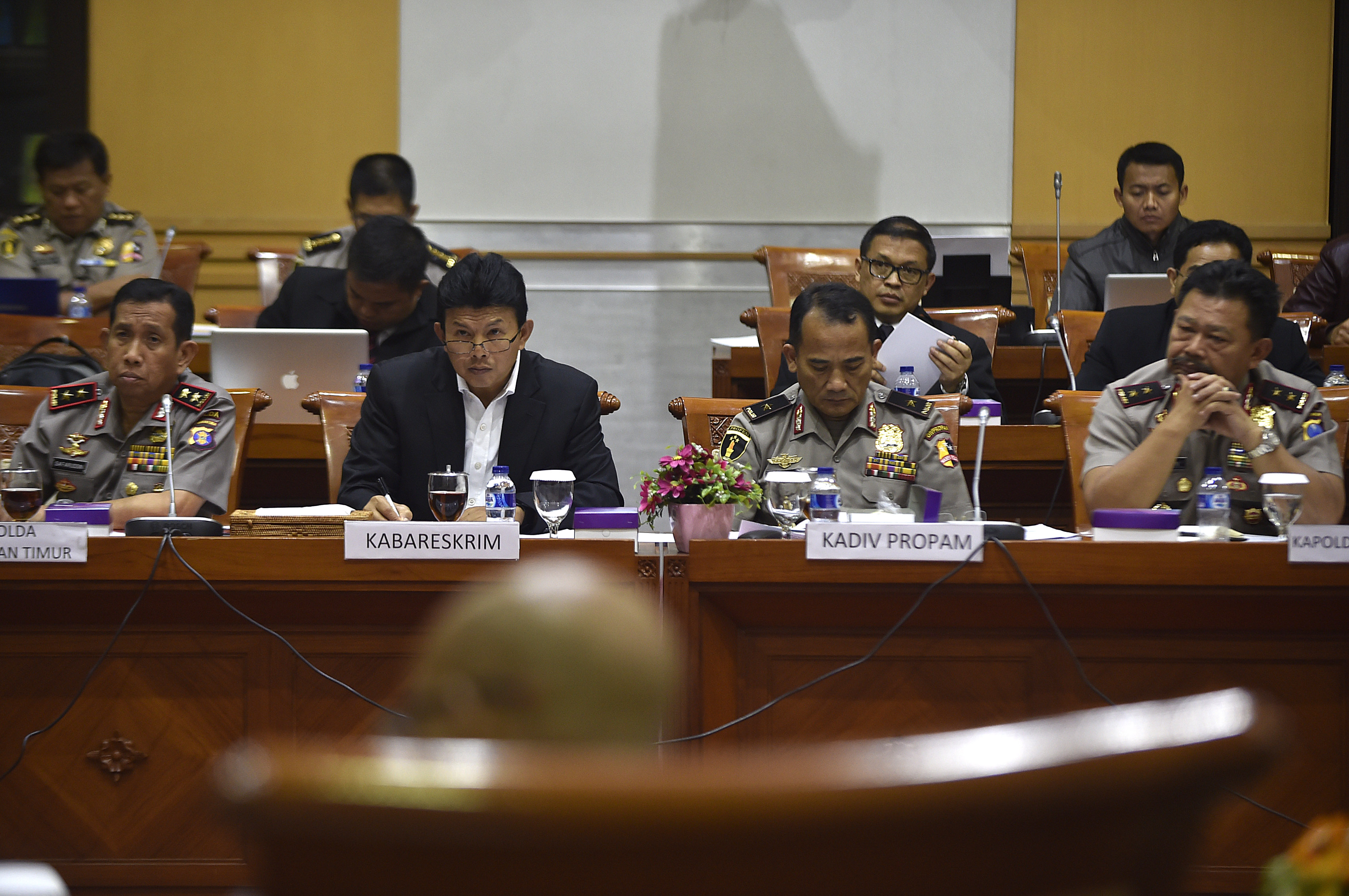 Kabareskrim Komjen Pol Ari Dono Sukmanto (kedua kiri) didampingi Kapolda Kaltim Irjen Pol Safarudin (kiri), Kadiv Propam Mabes Polri Irjen Pol Mochamad Iriawan (kedua kanan) dan Kapolda Jatim Irjen Pol Anton Setiadji mendengarkan pertanyaan anggota Komisi III dalam rapat dengar pendapat umum (RDPU) di Komplek Parlemen Senayan, Jakarta, Selasa (26/7). Panja Penegakan Hukum Komisi III mengundang Kabareskrim dan empat Kapolda dalam rangka membahas kasus di pusat dan daerah, diantaranya penggeledahan kasus suap yang tidak jelas tindakannya dan 43 ribu kasus yang hilang di jalan tidak dilaporkan pada penuntut umum. ANTARA FOTO/Puspa Perwitasari/foc/16.
