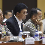 Kabareskrim Komjen Pol Ari Dono Sukmanto (ketiga kiri) didampingi Kapolda NTT Brigjen Pol E. Widyo Sunaryo (kiri), Kapolda Kaltim Irjen Pol Safarudin (kedua kiri), Kadiv Propam Mabes Polri Irjen Pol Mochamad Iriawan (ketiga kanan), Kapolda Jatim Irjen Pol Anton Setiadji (kedua kanan) dan Kapolda Maluku Utara Brigjen Pol Zulkarnain mendengarkan pertanyaan anggota Komisi III dalam rapat dengar pendapat umum (RDPU) di Komplek Parlemen Senayan, Jakarta, Selasa (26/7). Panja Penegakan Hukum Komisi III mengundang Kabareskrim dan empat Kapolda dalam rangka membahas kasus di pusat dan daerah, diantaranya penggeledahan kasus suap yang tidak jelas tindakannya dan 43 ribu kasus yang hilang di jalan tidak dilaporkan pada penuntut umum. ANTARA FOTO/Puspa Perwitasari/foc/16.