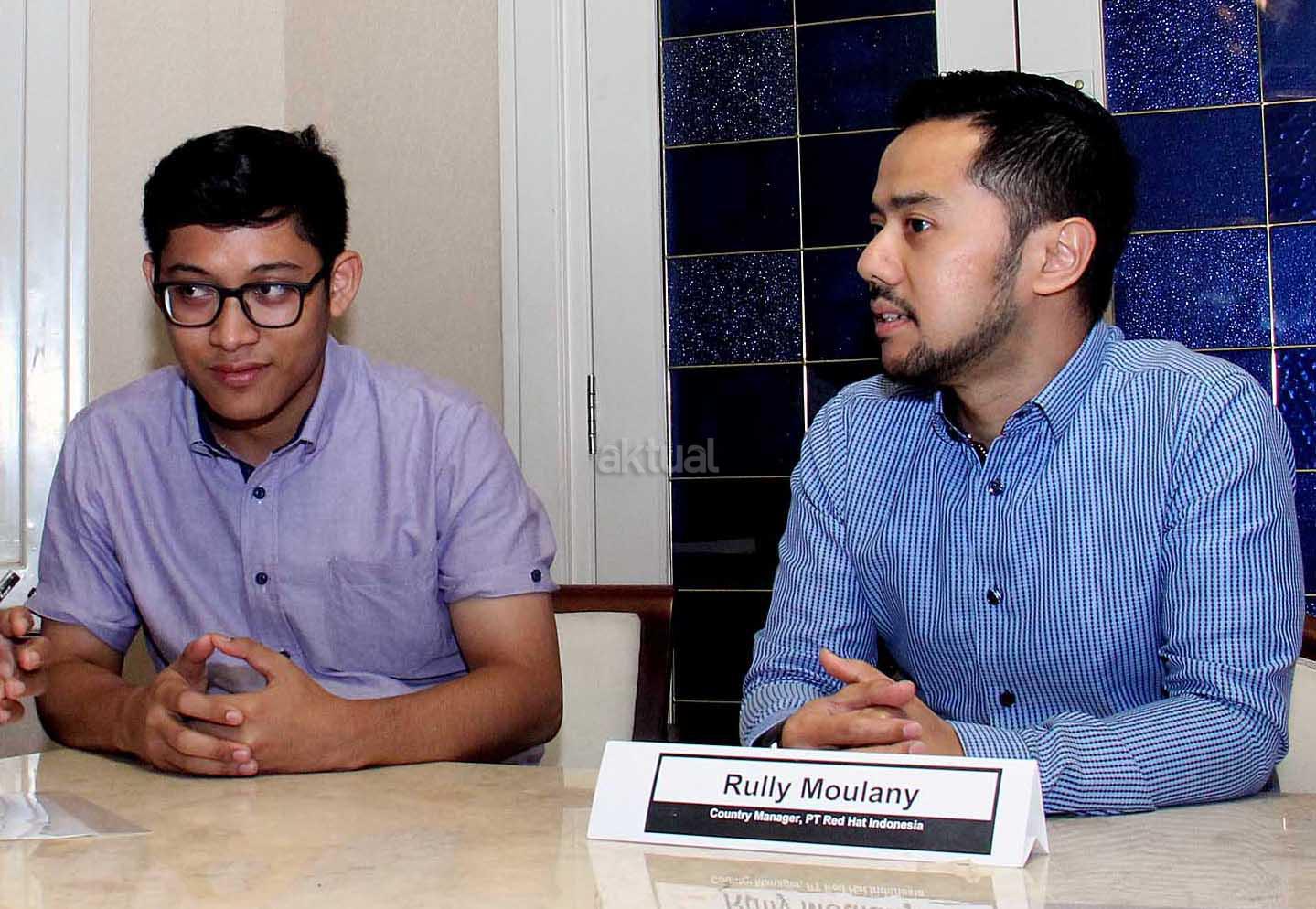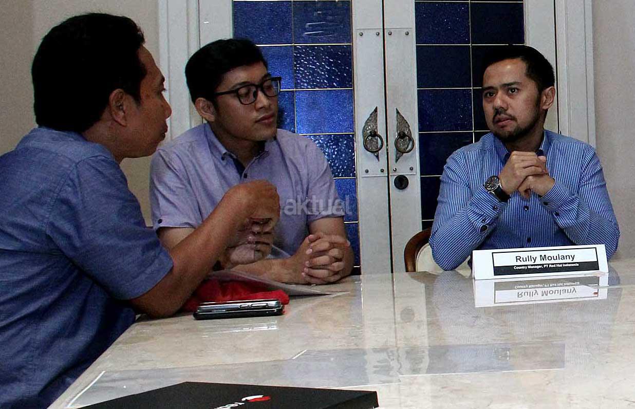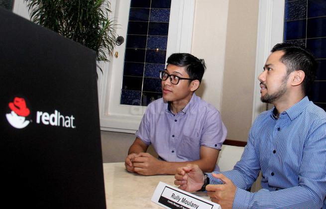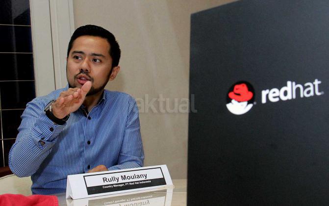 Country Manager PT. Red Hat Indonesia, Rully Moulany (kanan) memaparkan kinerja perusahaan Red Hat secara global maupun indonesia saat jumpa persnya di Jakarta, Rabu (16/12/2015). Rully mengatakan bahwa Red Hat Indonesia tumbuh baik dan sangat signifikan sebagai salah satu perusahaan terbesar dan dikenal untuk dedikasinya atas perangkat lunak sumber bebas.
