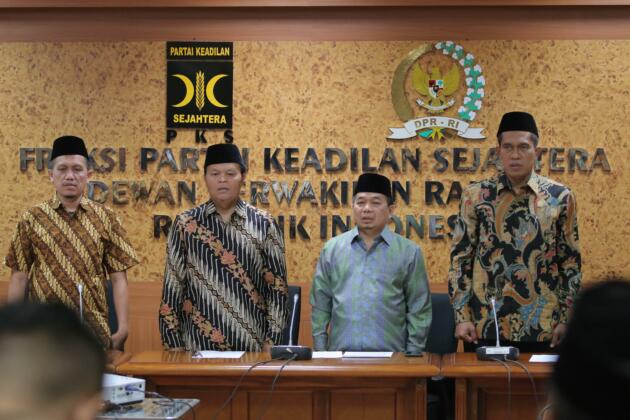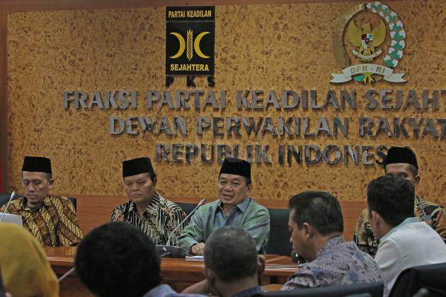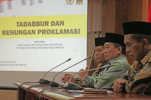 Ketua Fraksi PKS DPR RI, Jazuli Juwaini (tengah), Wakil Ketu MPR Hidayat Nur Wahid (kiri) dan Ketua Komisi I DPR Abdul Haris Al Anshori (kanan) menghadiri Tadabbur dan Renungan Proklamasi di ruang Fraksi PKS Komplek Parlemen Senayan, Jakarta, Selasa (14/6). Proklamasi Kemerdekaan RI 17 Agustus 1945 bertepatan dengan 9 Ramadhan 1364 H Fraksi PKS mengajak umat islam untuk mensyukuri dan melakukan refleksi atas peran dan Kontribusi Umat Islam dalam Menjaga dan mengisi Kemerdekaan Indonesia. AKTUAL/HO