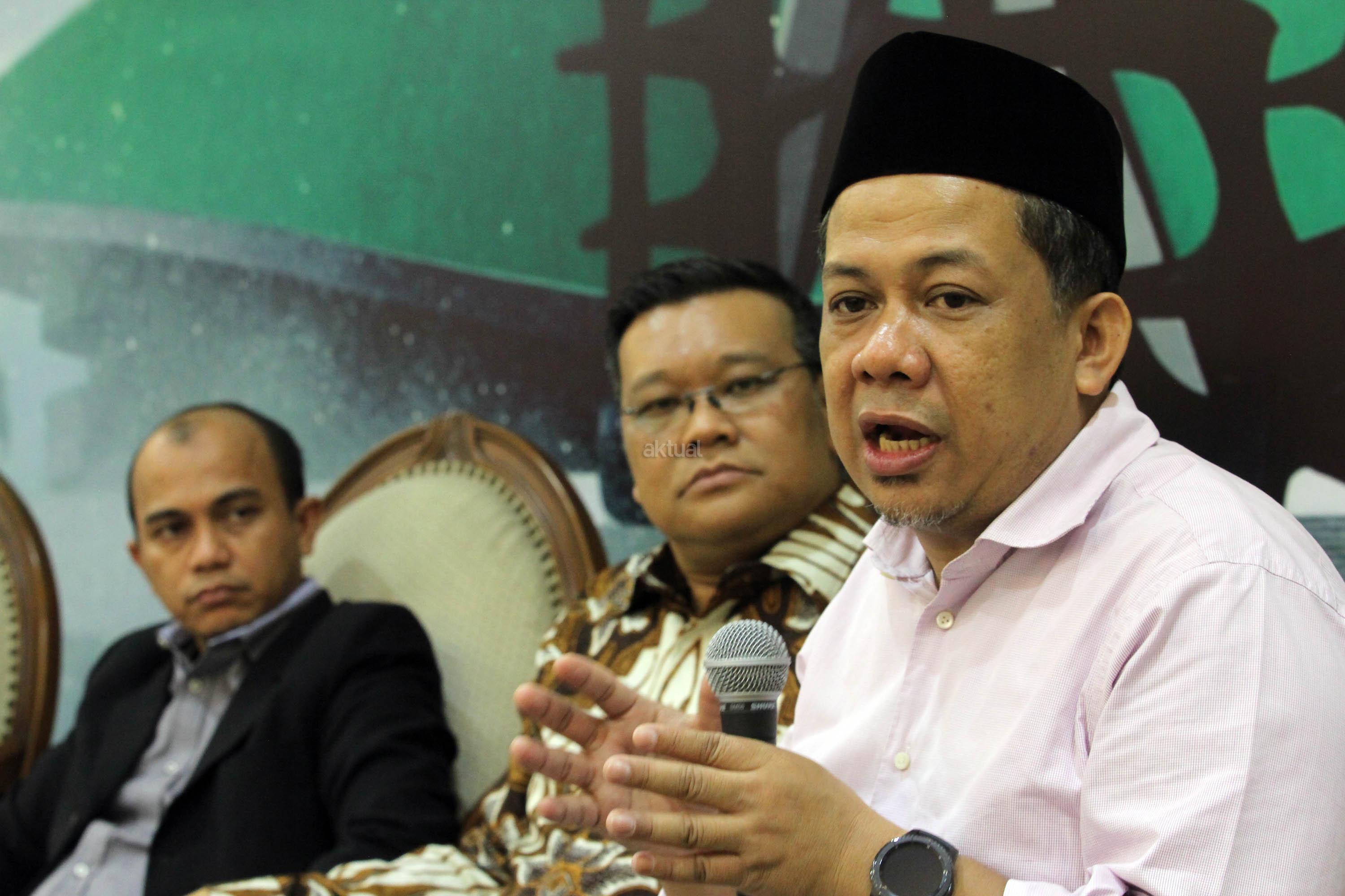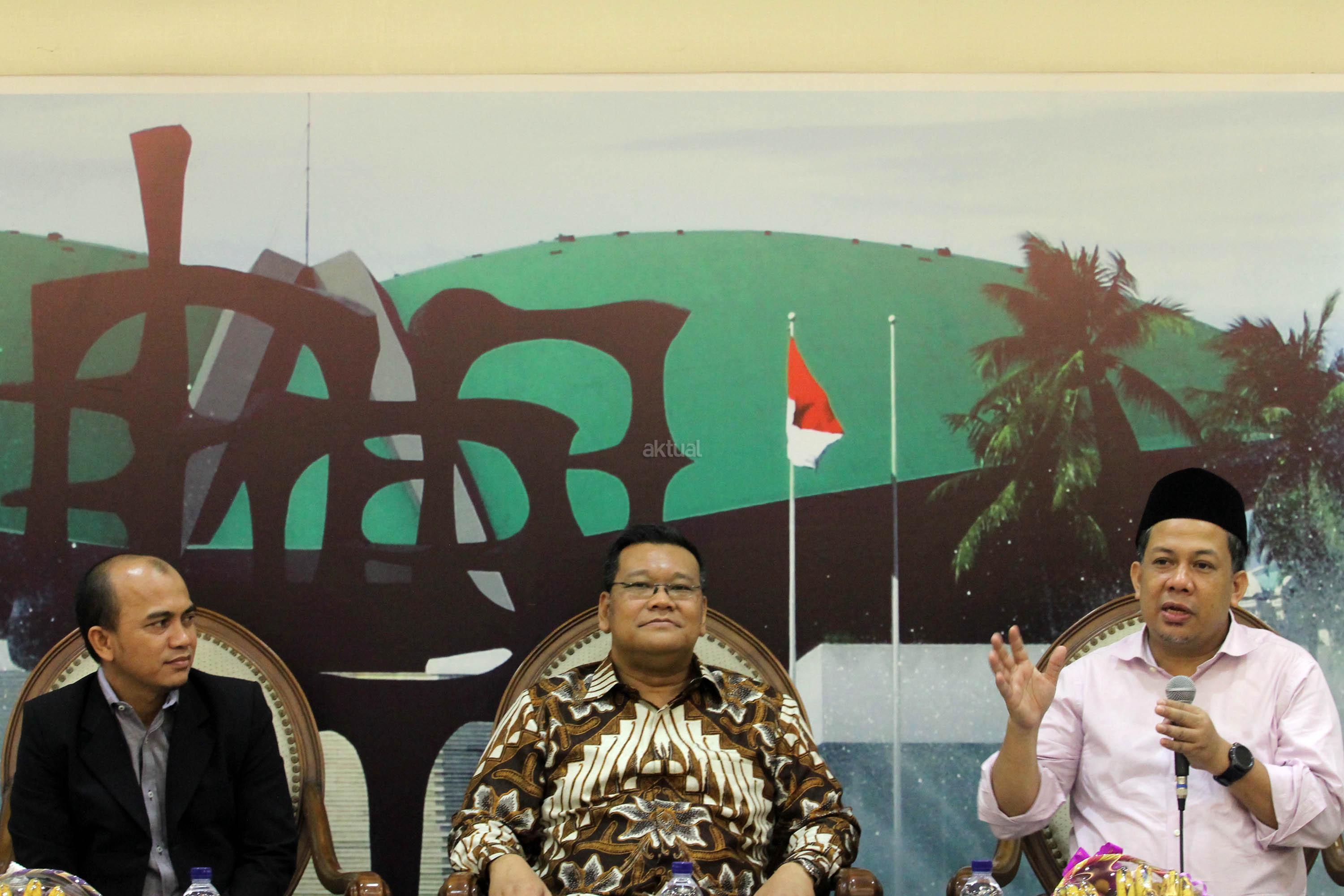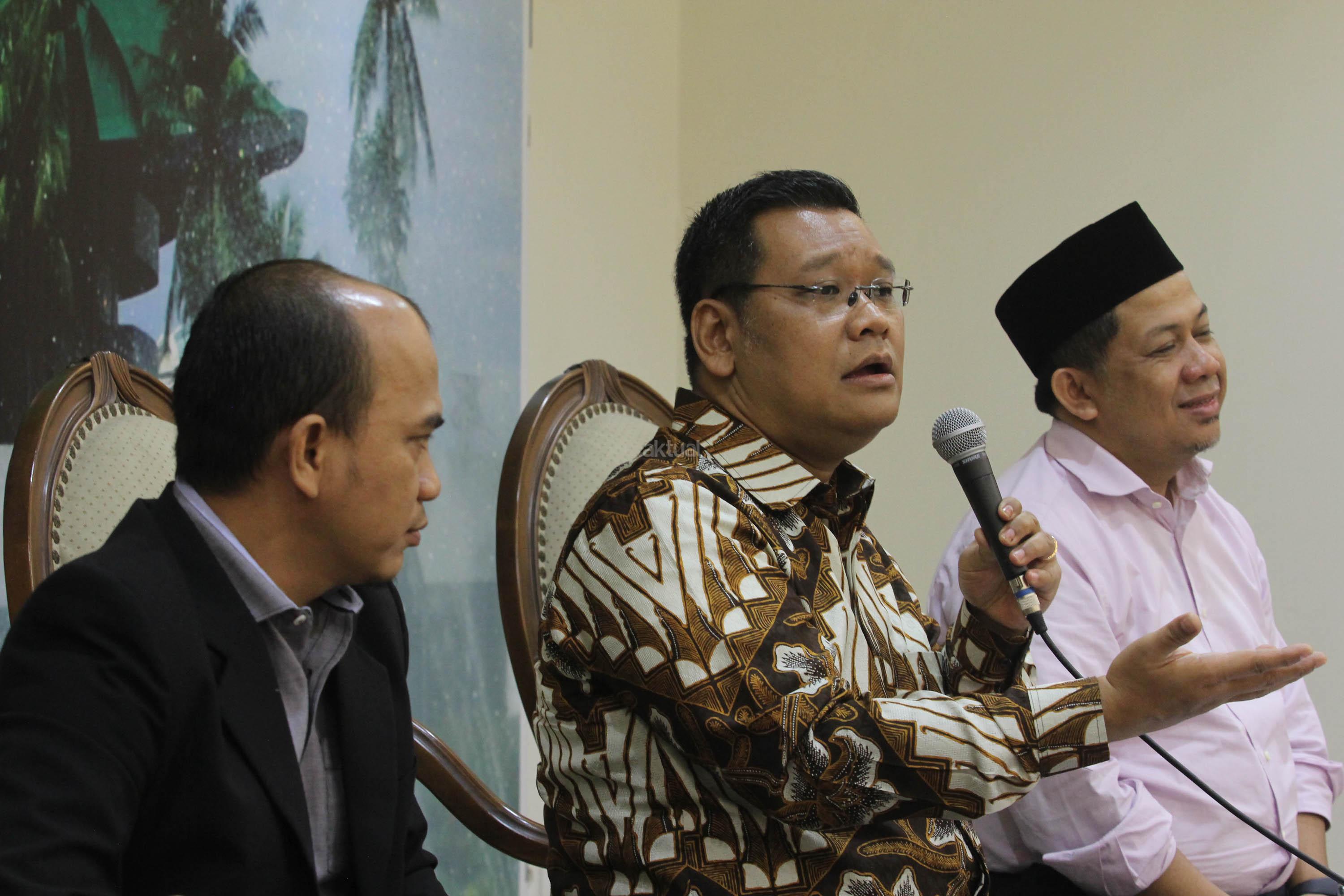 Wakil Ketua DPR Fahri Hamzah (kanan), Anggota Komisi VI DPR Fraksi PDIP Eriko Sotarduga (tengah) dan Pakar Komunikasi Politik/Direktur Eksekutif Polcomm Institute Heri Budianto, menjadi pembicara dalam diskusi publik, di Gedung Nusantara III, Kompleks Parlemen, Jakarta, Jum’at (28/4). Mereka berpendapat soal Rekonsiliasi Pasca Pilkada DKI Jakarta Putaran Kedua, menyebabkan riuhnya kehidupan politik dan sosial akibat perdebatan dan saling tuding antar para pendukung di Media Sosial serta aksi-aksi sejumlah kelompok terkait kasus yang menjerat Hukum Gubernur DKI Jakarta petahana Basuki Tjahaja Purnama. AKTUAL/Tino Oktaviano