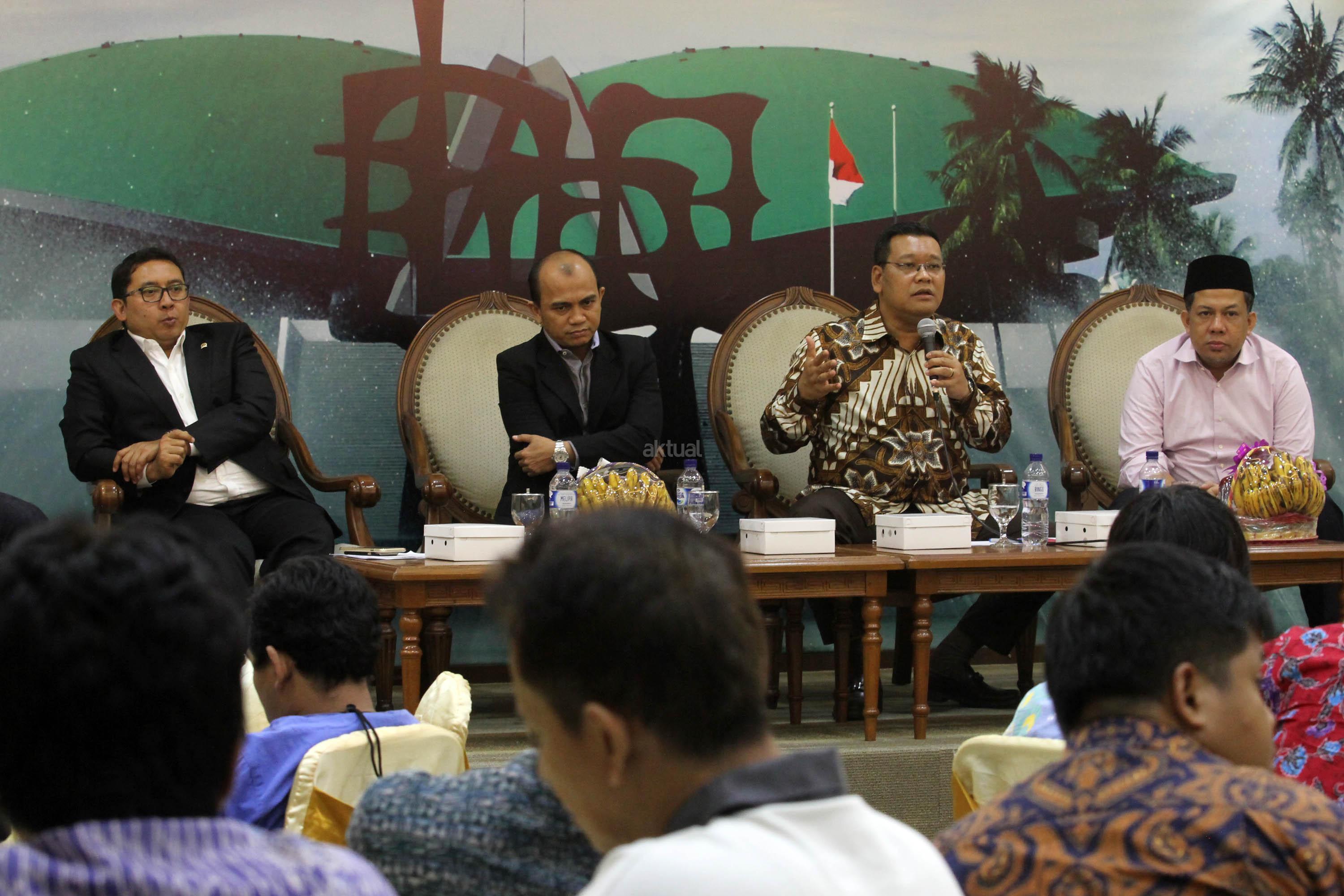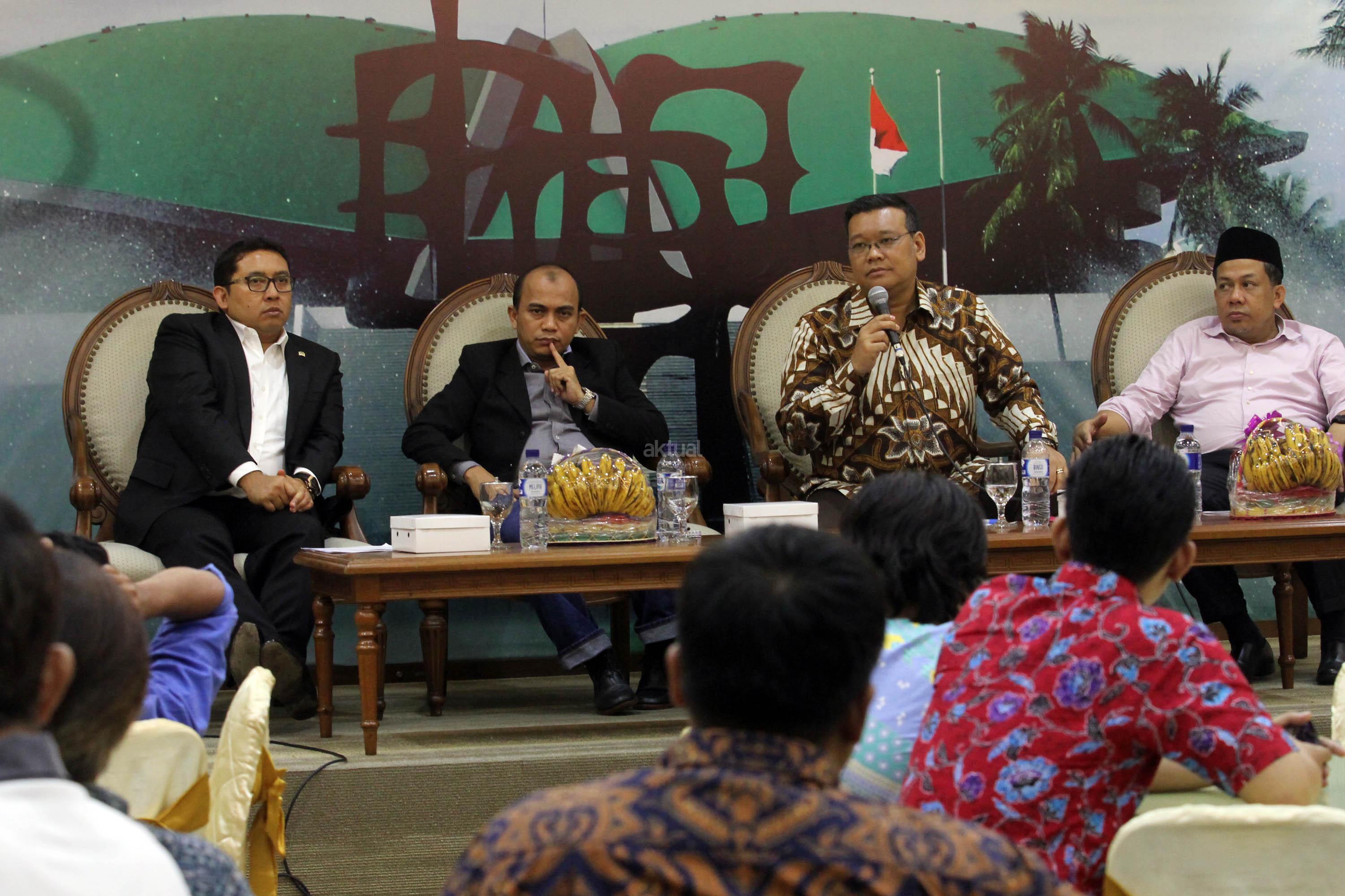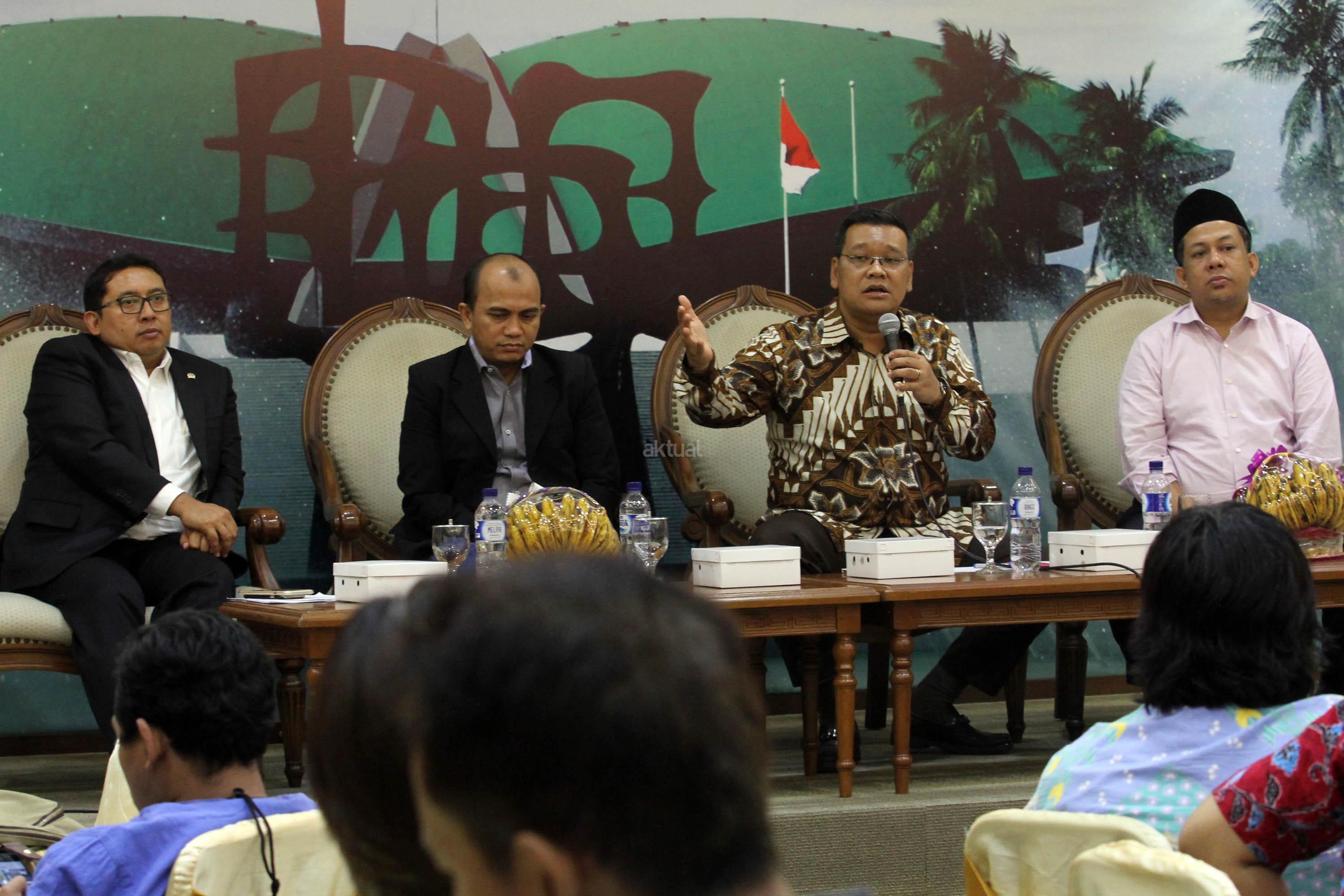 Dari kiri ke kanan, Wakil Ketua DPR Fadli Zon, Pakar Komunikasi Politik/Direktur Eksekutif Polcomm Institute Heri Budianto, Anggota Komisi VI DPR Fraksi PDIP Eriko Sotarduga dan Wakil Ketua DPR Fahri Hamzah, menjadi pembicara dalam diskusi publik, di Gedung Nusantara III, Kompleks Parlemen, Jakarta, Jum’at (28/4). Mereka berpendapat soal Rekonsiliasi Pasca Pilkada DKI Jakarta Putaran Kedua, menyebabkan riuhnya kehidupan politik dan sosial akibat perdebatan dan saling tuding antar para pendukung di Media Sosial serta aksi-aksi sejumlah kelompok terkait kasus yang menjerat Hukum Gubernur DKI Jakarta petahana Basuki Tjahaja Purnama. AKTUAL/Tino Oktaviano