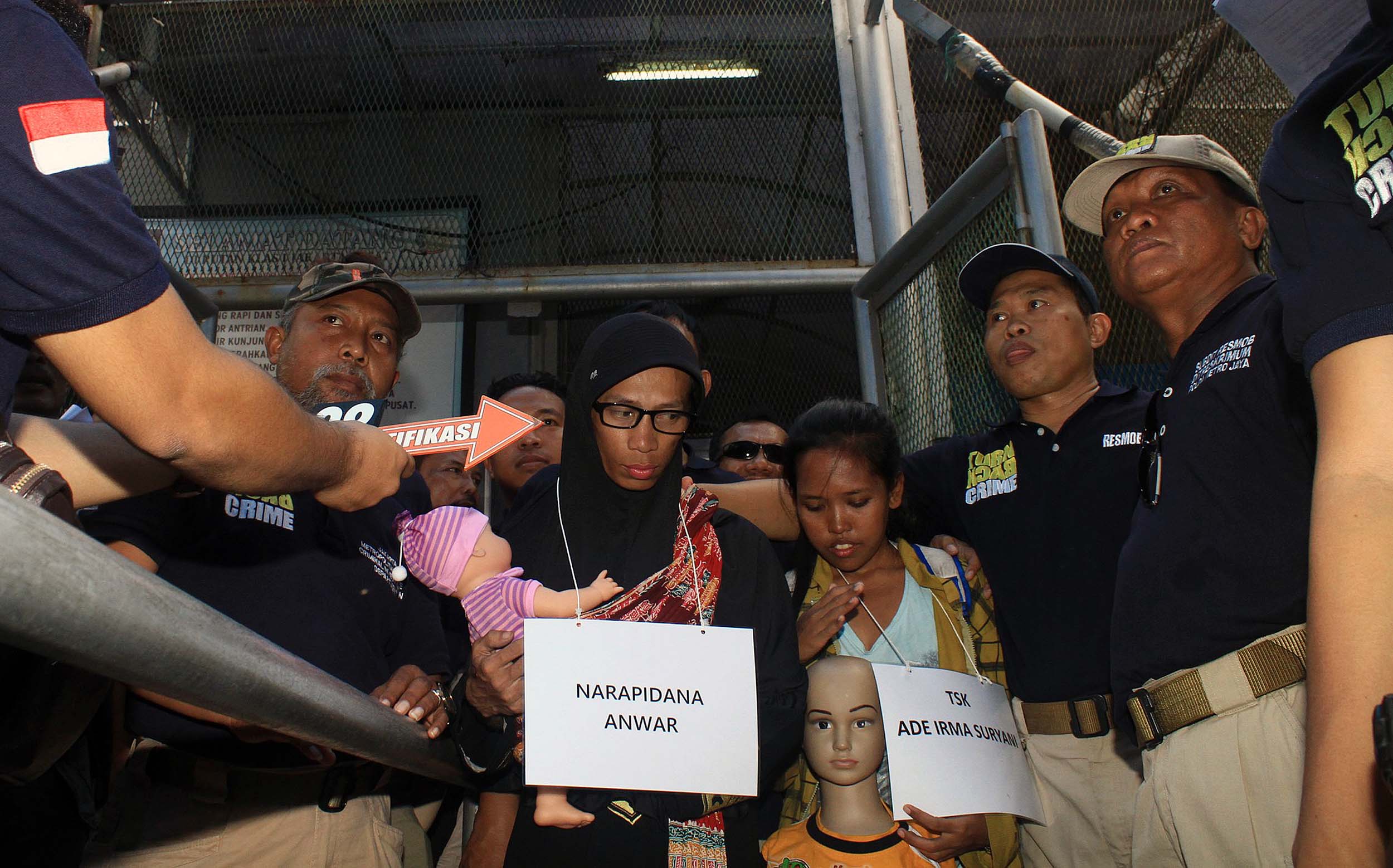 Anwar alias Rizal dan istrinya (tengah) saat mengikuti rekontruksi kejadian di Rutan Salemba, Jakarta, Minggu (17/7/2016). Dalam rekonstruksi kejadian ini Anwar dan istrinya memperagakan sebanyak 36 adegan.