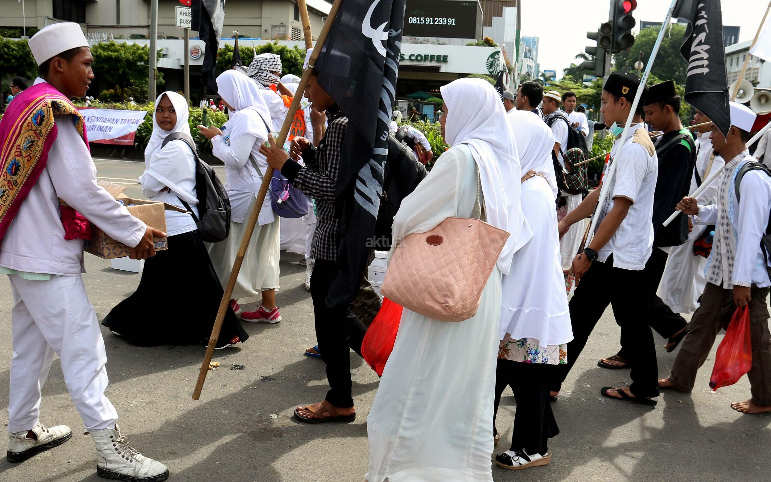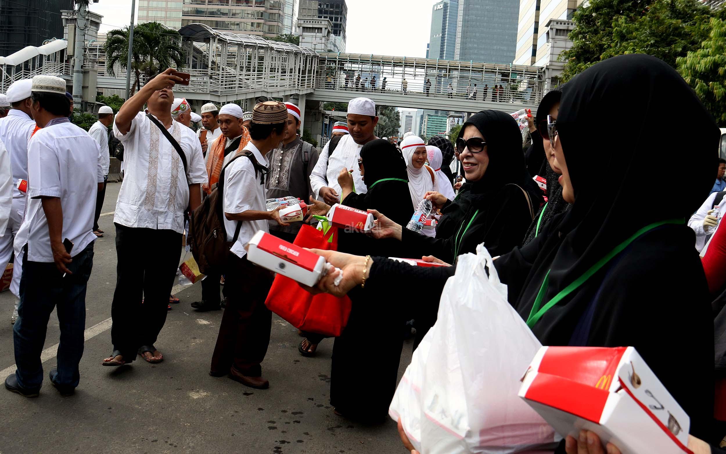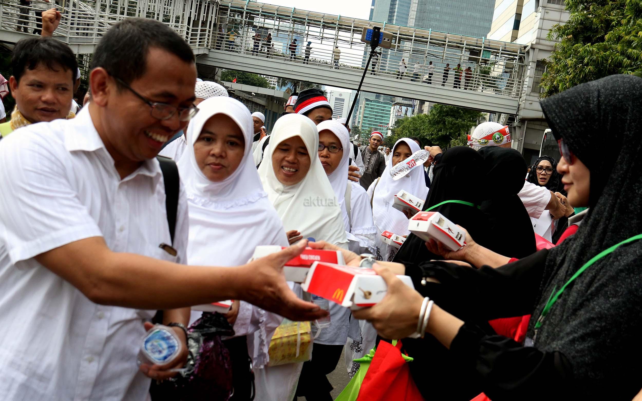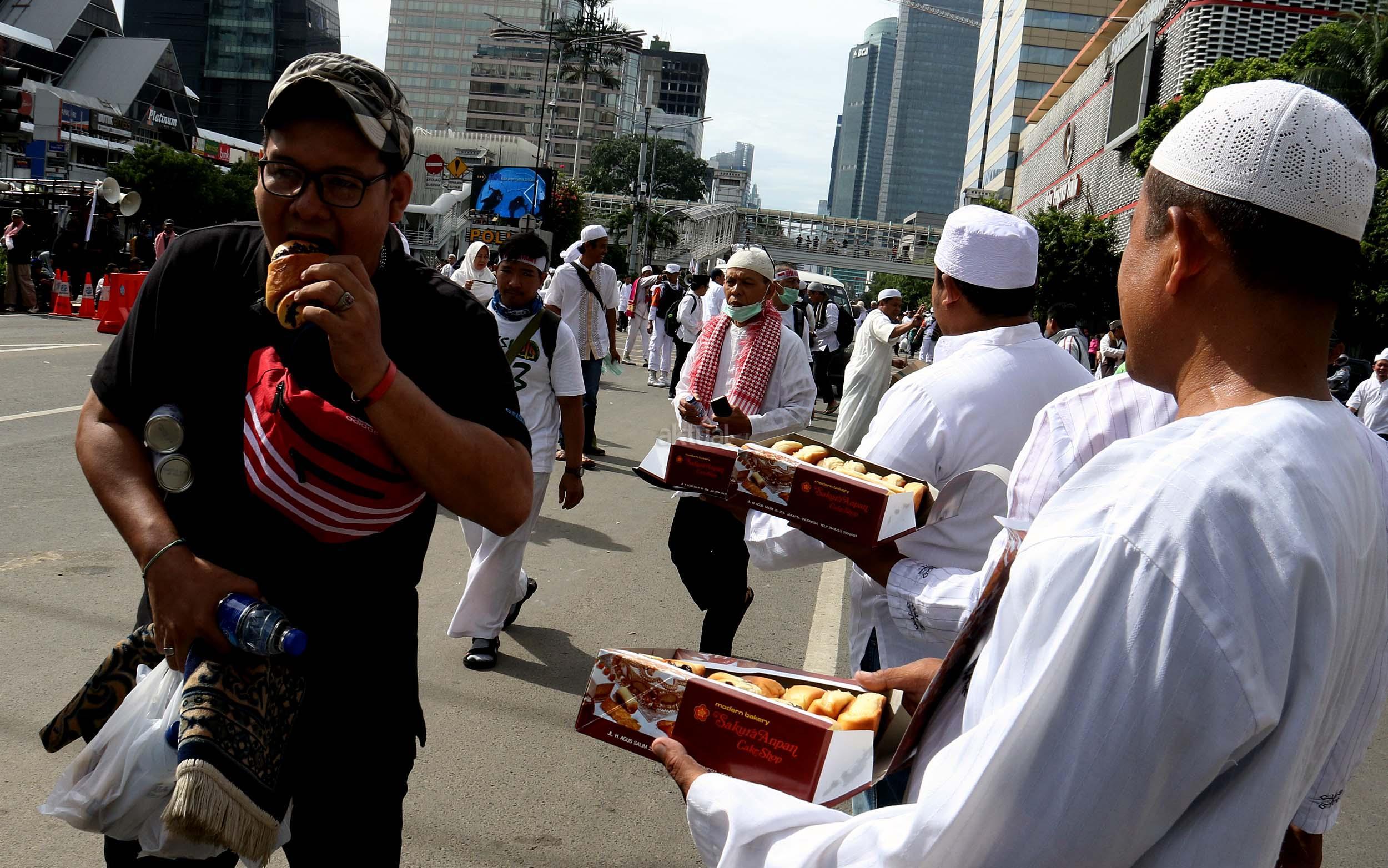 Sejumlah relawan membagikan makanan dan minuman kepada para peserta aksi super damai di Jalan. MH. Thamrin, Jakarta, Jumat (2/12/2016). Para peserta doa bersama juga disambut dengan suguhan sarapan gratis dari sejumlah relawan baik yang berasal dari ormas maupun donatur perorangan. Sarapan gratis itu berupa roti, kue, kurma, nasi uduk, dan air mineral. AKTUAL/Munzir