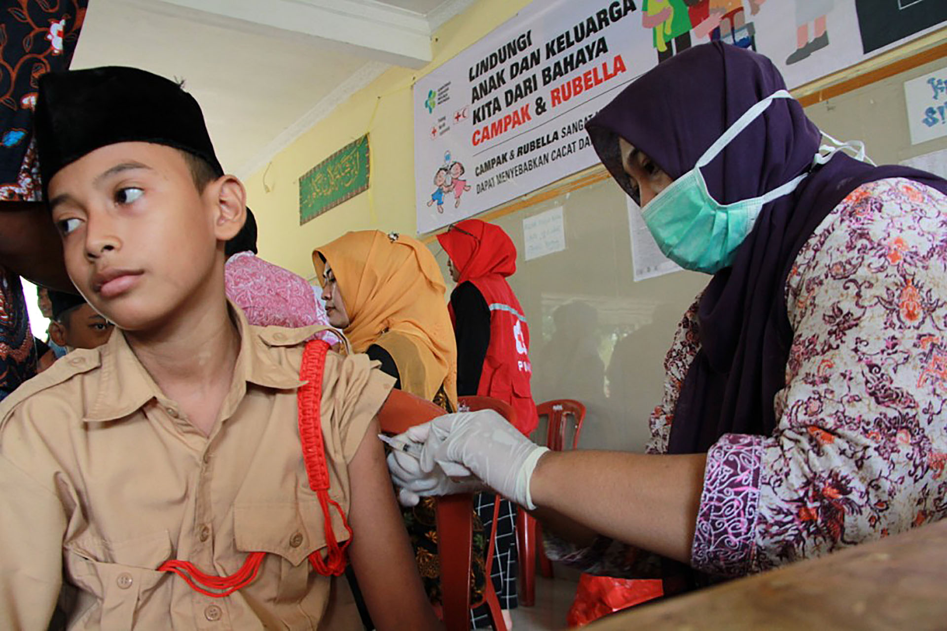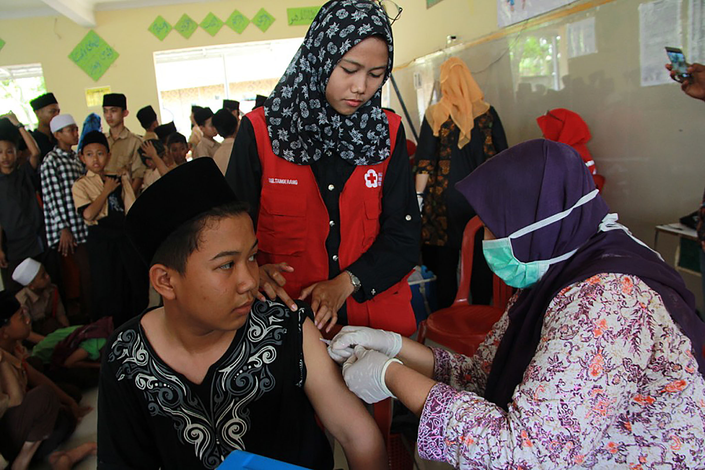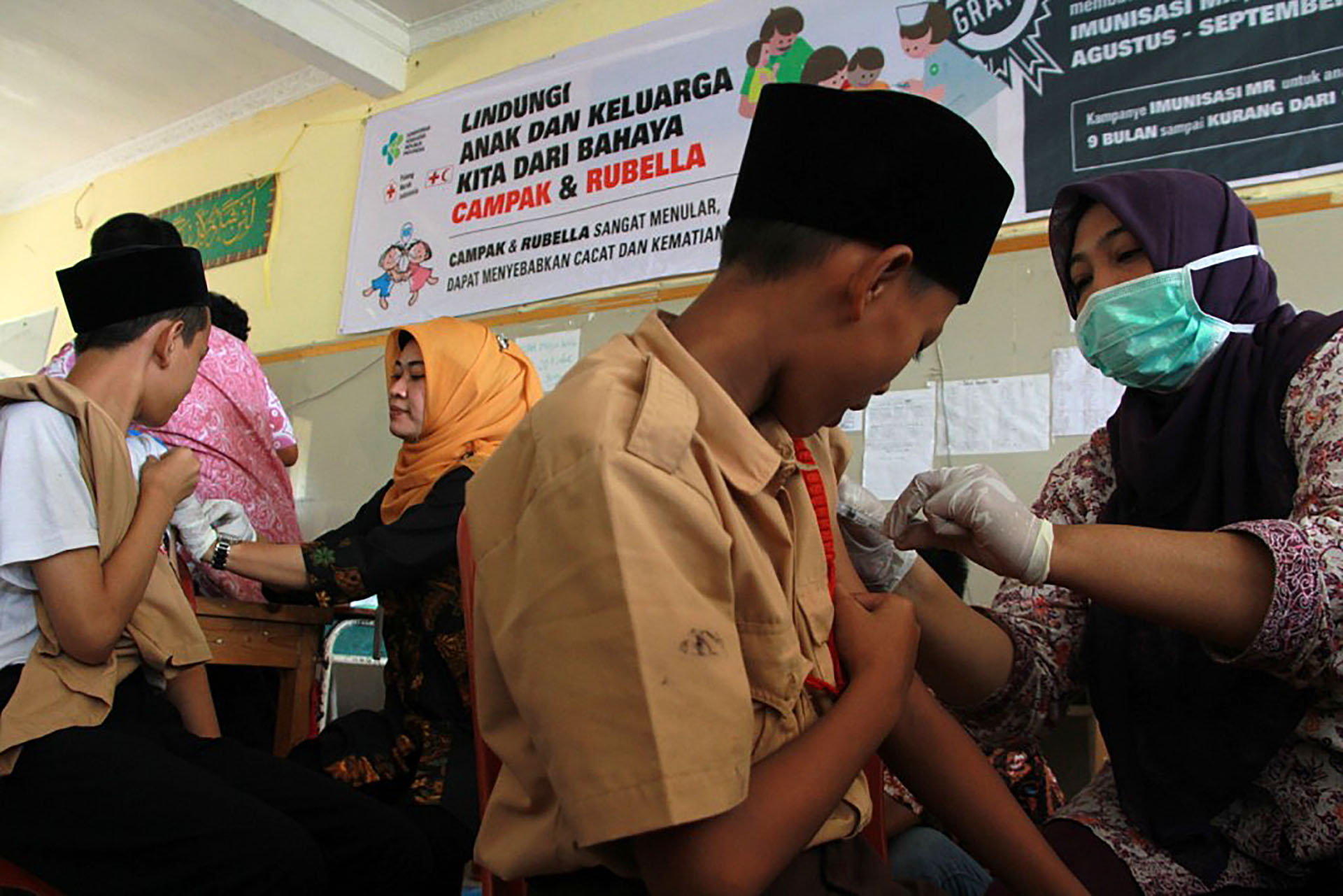 Relawan Palang Merah Indonesia (PMI) Kabupaten Tangerang bersama Dinas kesehatan KabupatencTangerang, Provinsi Banten melakukan vaksinasi Campak dan Rubella kepada 400 anak di Pesantren Miftahul Khaer, Kabupaten Tangerang, Banten, Kamis (28/9/2017). Kegiatan ini adalah upaya untuk mengeliminasi Campak Dan Rubella, agar Indonesia bebas dari Campak Rubella pada tahun 2020. PMI berupaya membantu Pemerintah agar Indonesia bebas dari Campak Dan rubella, selain membantu kampanye melalui rumah ke rumah, PMI bersama dinas kesehatan setempat juga melakukan jemput Bola dengan mendatangi tempat tempat yang belum dijangkau. Kegiatan vaksinasi ini dimulai sejak Agustus sampai dengan September difokuskan ke wilayah Banten Dan Jawa Barat. AKTUAL/PMI