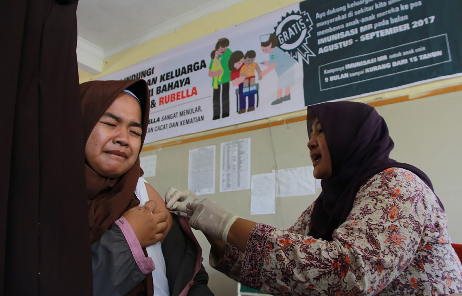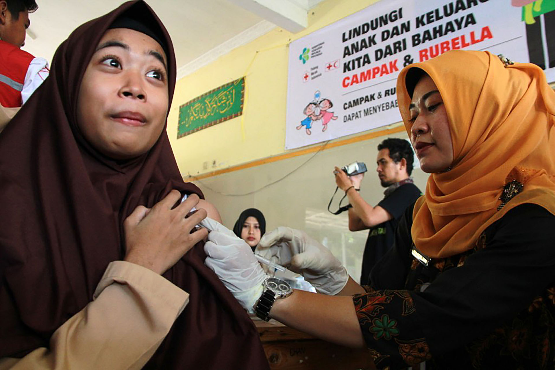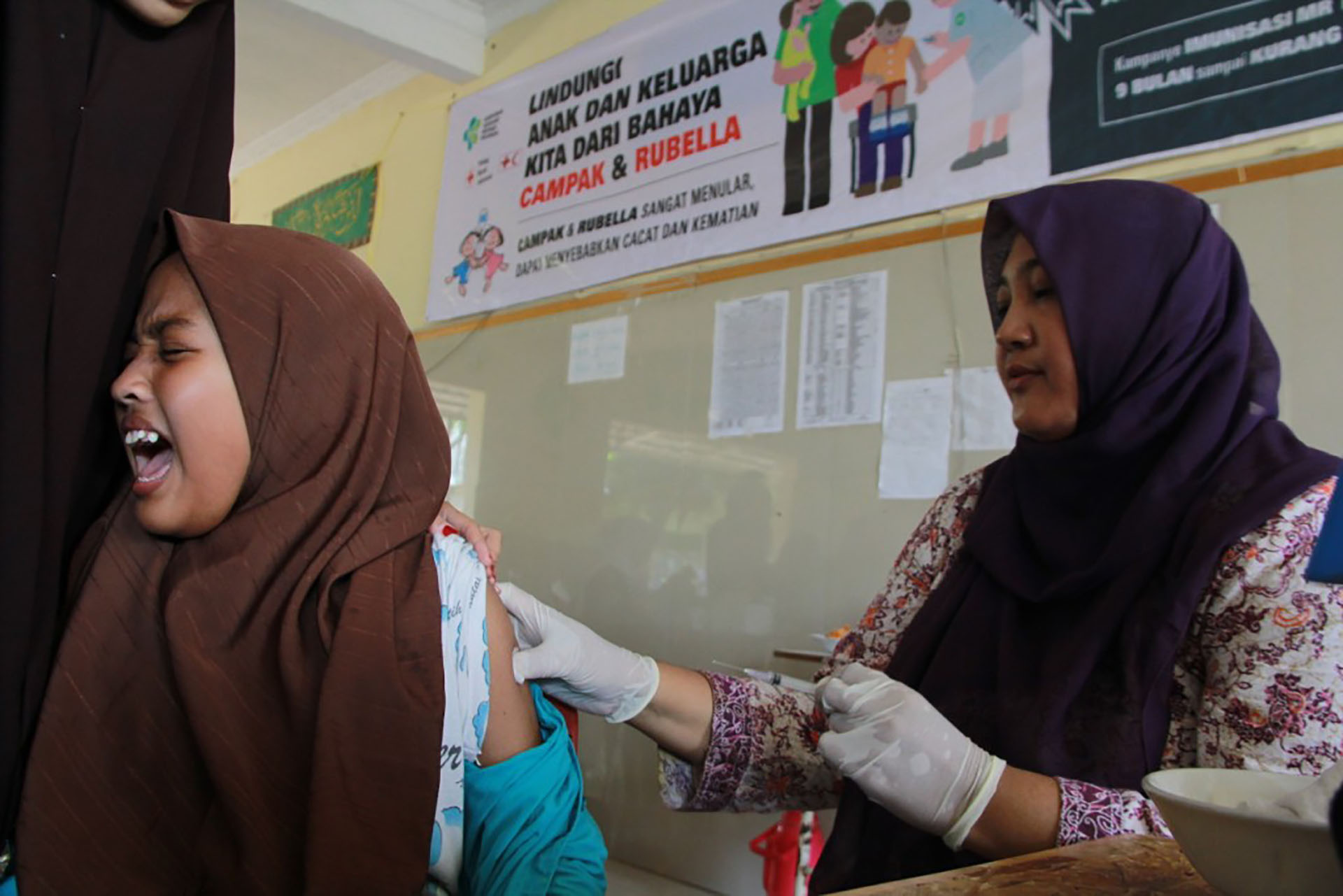 Relawan Palang Merah Indonesia (PMI) Kabupaten Tangerang bersama Dinas kesehatan KabupatencTangerang, Provinsi Banten melakukan vaksinasi Campak dan Rubella kepada 400 anak di Pesantren Miftahul Khaer, Kabupaten Tangerang, Banten, Kamis (28/9/2017). Kegiatan ini adalah upaya untuk mengeliminasi Campak Dan Rubella, agar Indonesia bebas dari Campak Rubella pada tahun 2020. PMI berupaya membantu Pemerintah agar Indonesia bebas dari Campak Dan rubella, selain membantu kampanye melalui rumah ke rumah, PMI bersama dinas kesehatan setempat juga melakukan jemput Bola dengan mendatangi tempat tempat yang belum dijangkau. Kegiatan vaksinasi ini dimulai sejak Agustus sampai dengan September difokuskan ke wilayah Banten Dan Jawa Barat. AKTUAL/PMI