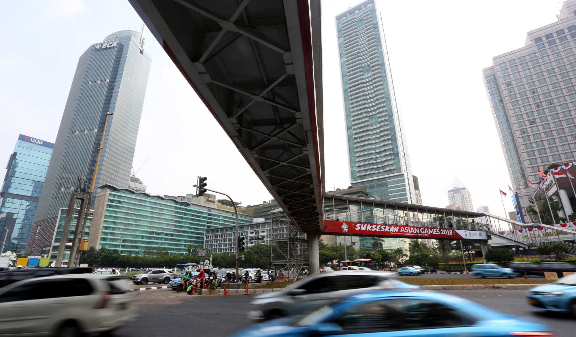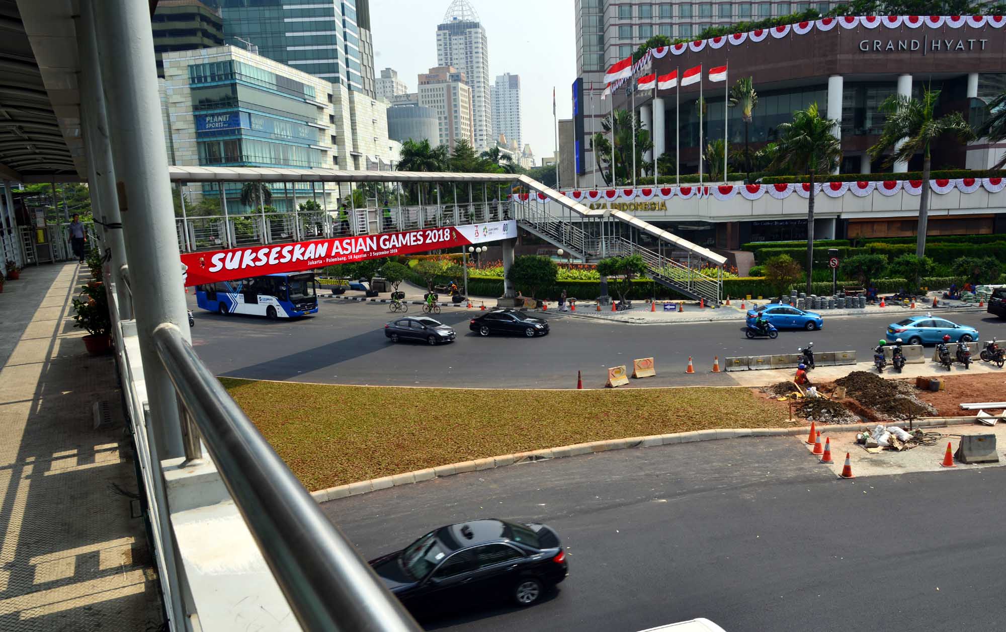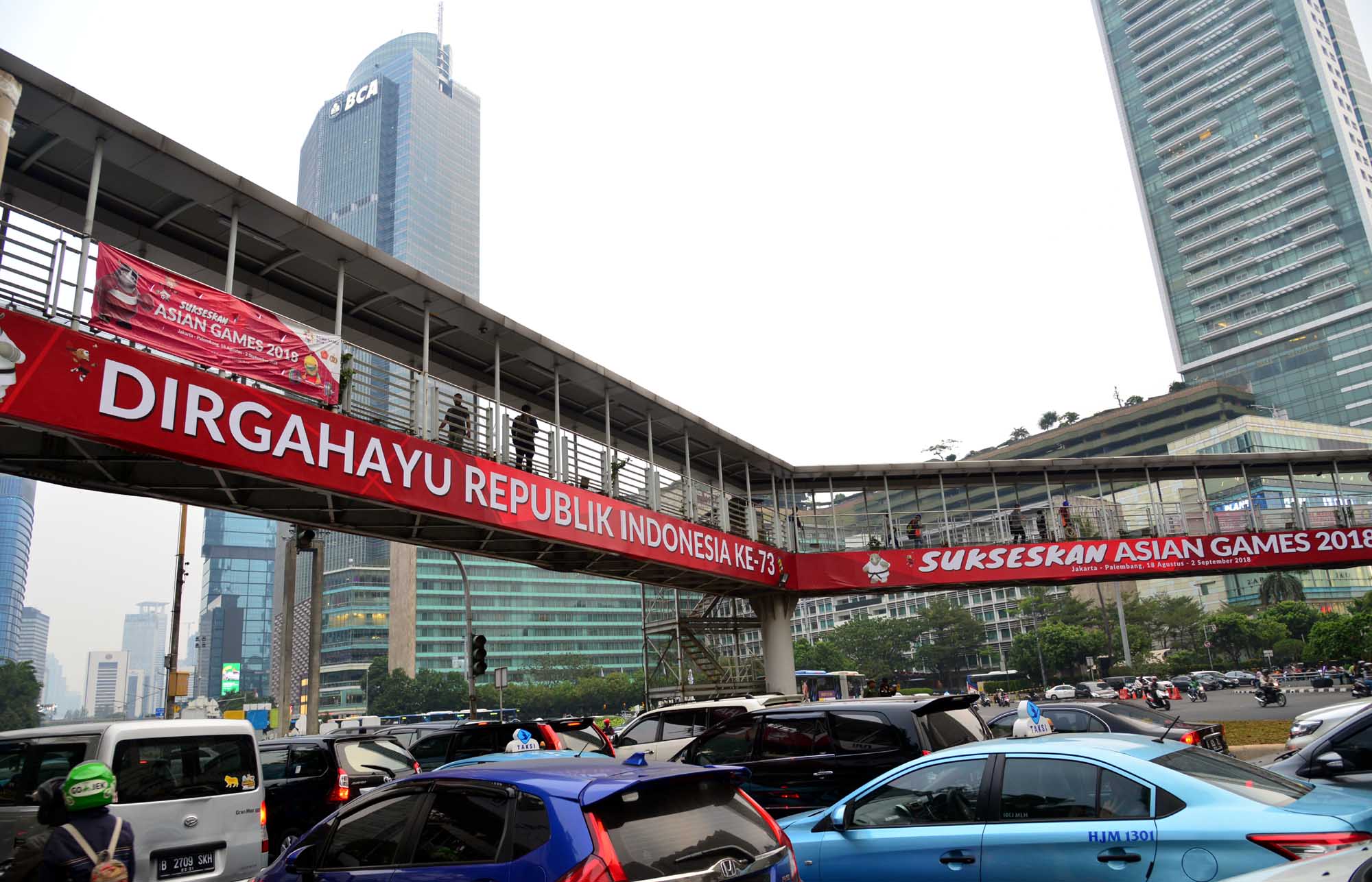 Warga melintasi Jembatan Penyebrangan Orang (JPO) di Bundaran HI, Jakarta, Selasa (24/7). Gubernur DKI Jakarta Anies Baswedan berencana akan melakukan pembongkaran JPO Bundaran HI agar tidak menganggu patung selamat datang yang dibangun untuk menyambut peserta Asian Games. Nantinya usai dirobohkan, dilokasi tersebut akan dibangun ‘Pelican Crossing’ untuk memudahkan pejalan kaki menyeberang jalan. AKTUAL/Tino Oktaviano