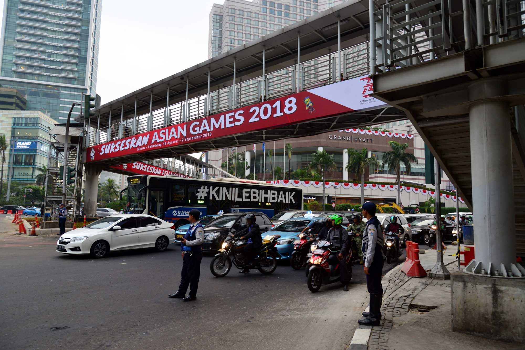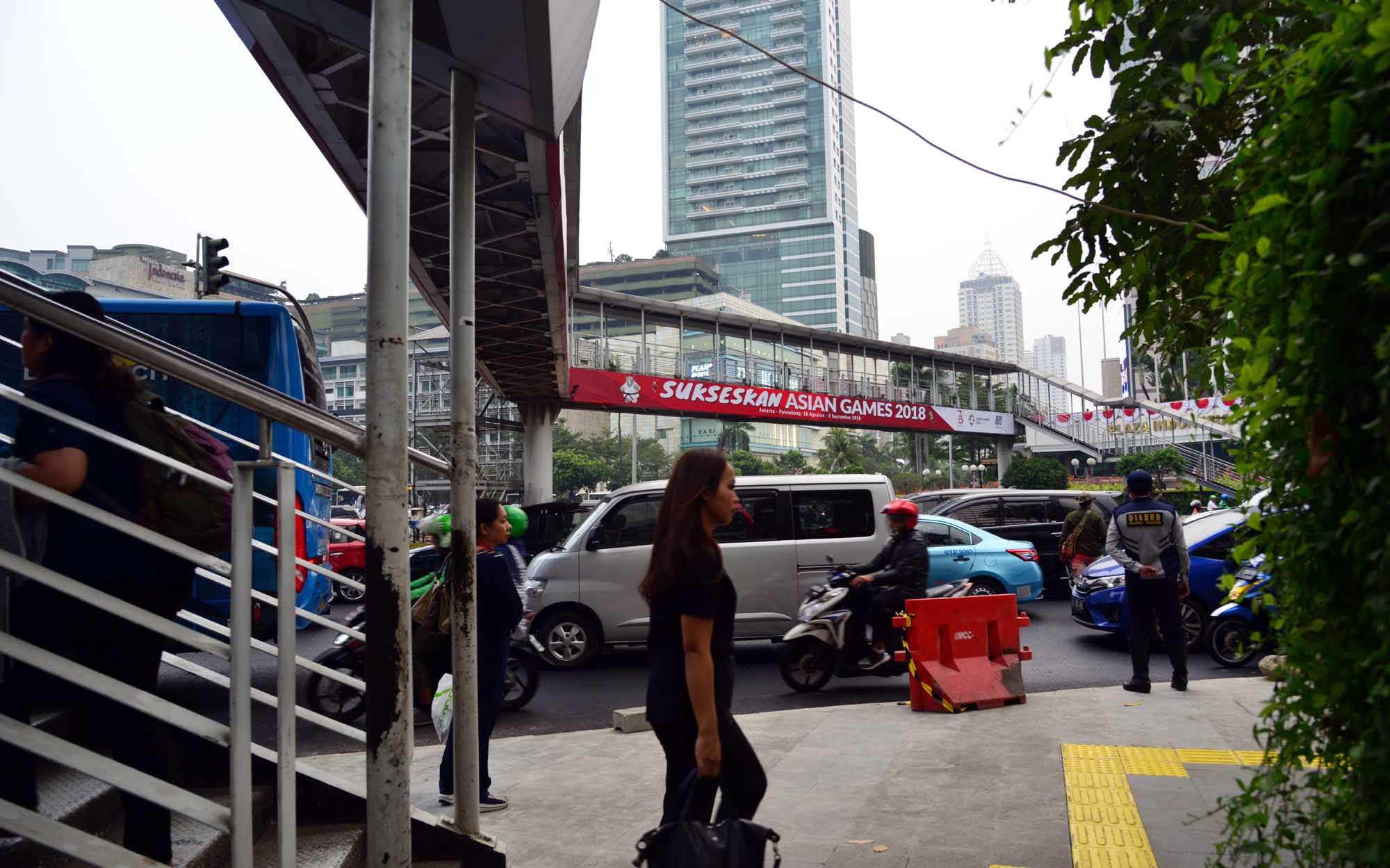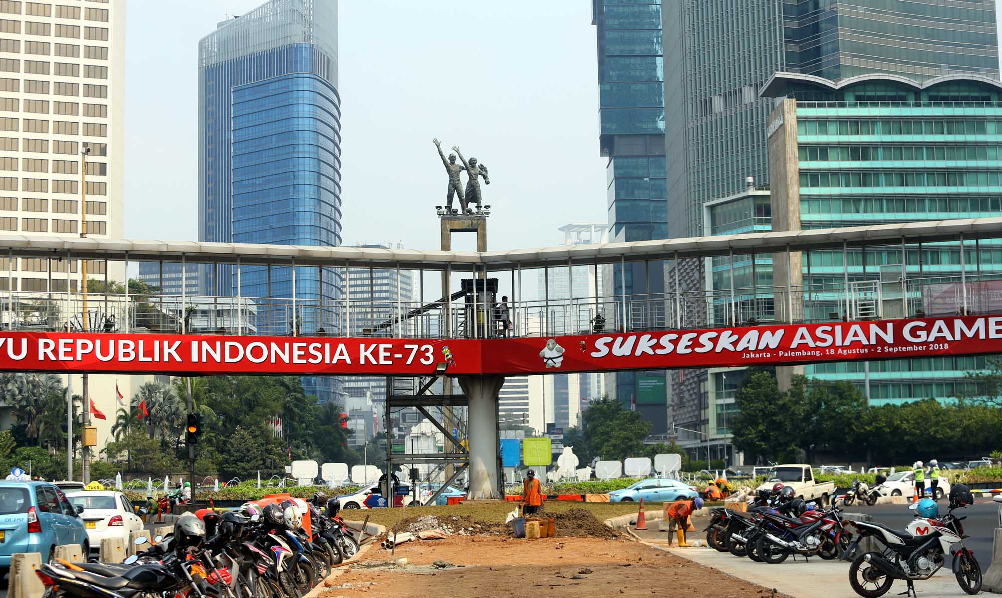 Warga melintasi Jembatan Penyebrangan Orang (JPO) di Bundaran HI, Jakarta, Selasa (24/7). Gubernur DKI Jakarta Anies Baswedan berencana akan melakukan pembongkaran JPO Bundaran HI agar tidak menganggu patung selamat datang yang dibangun untuk menyambut peserta Asian Games. Nantinya usai dirobohkan, dilokasi tersebut akan dibangun ‘Pelican Crossing’ untuk memudahkan pejalan kaki menyeberang jalan. AKTUAL/Tino Oktaviano