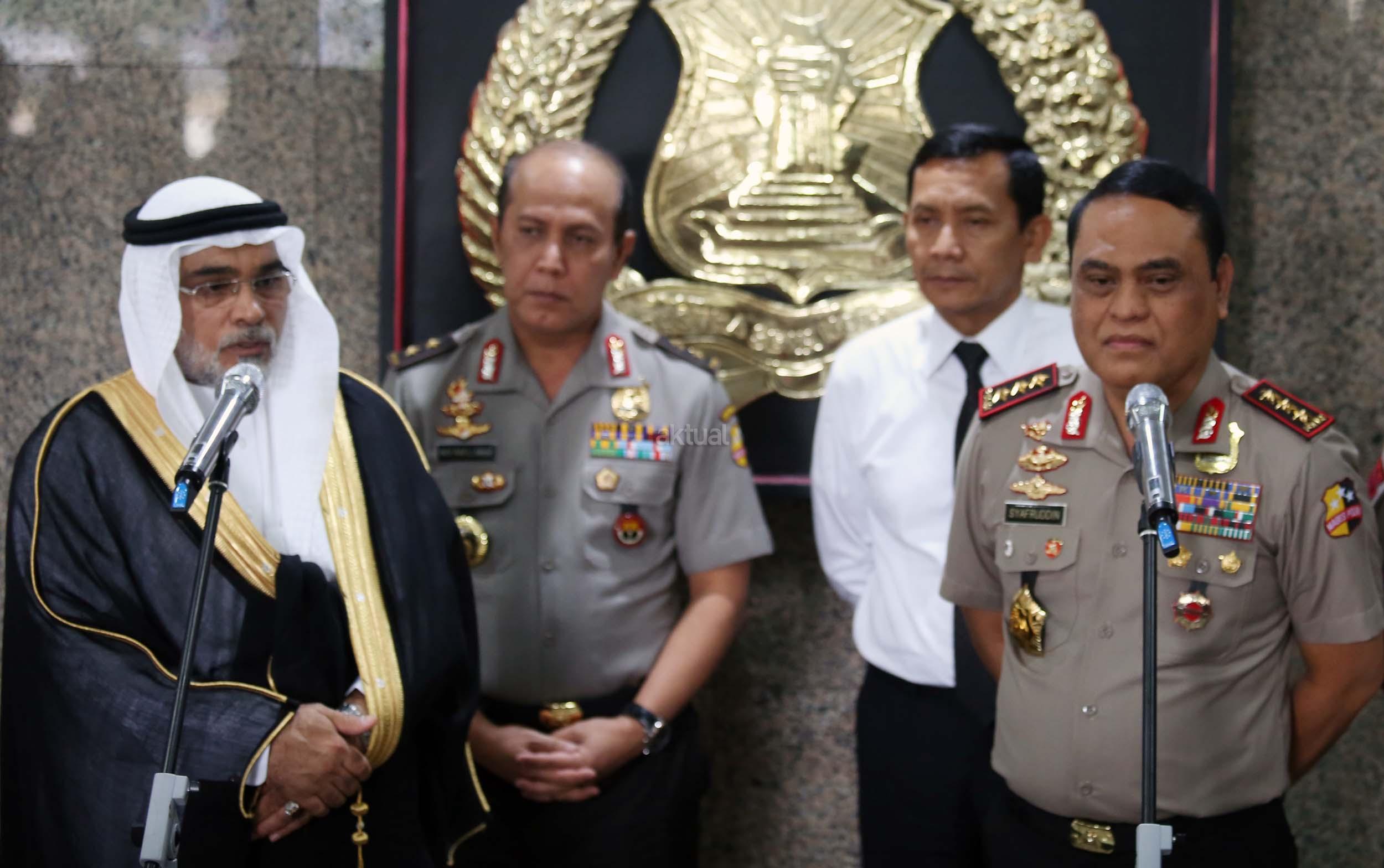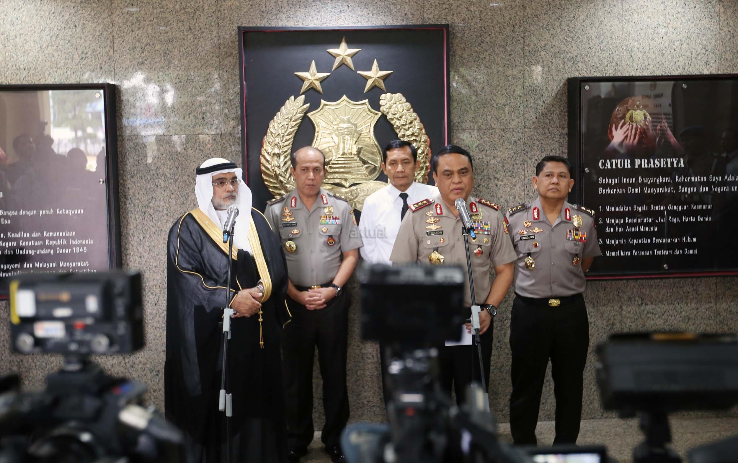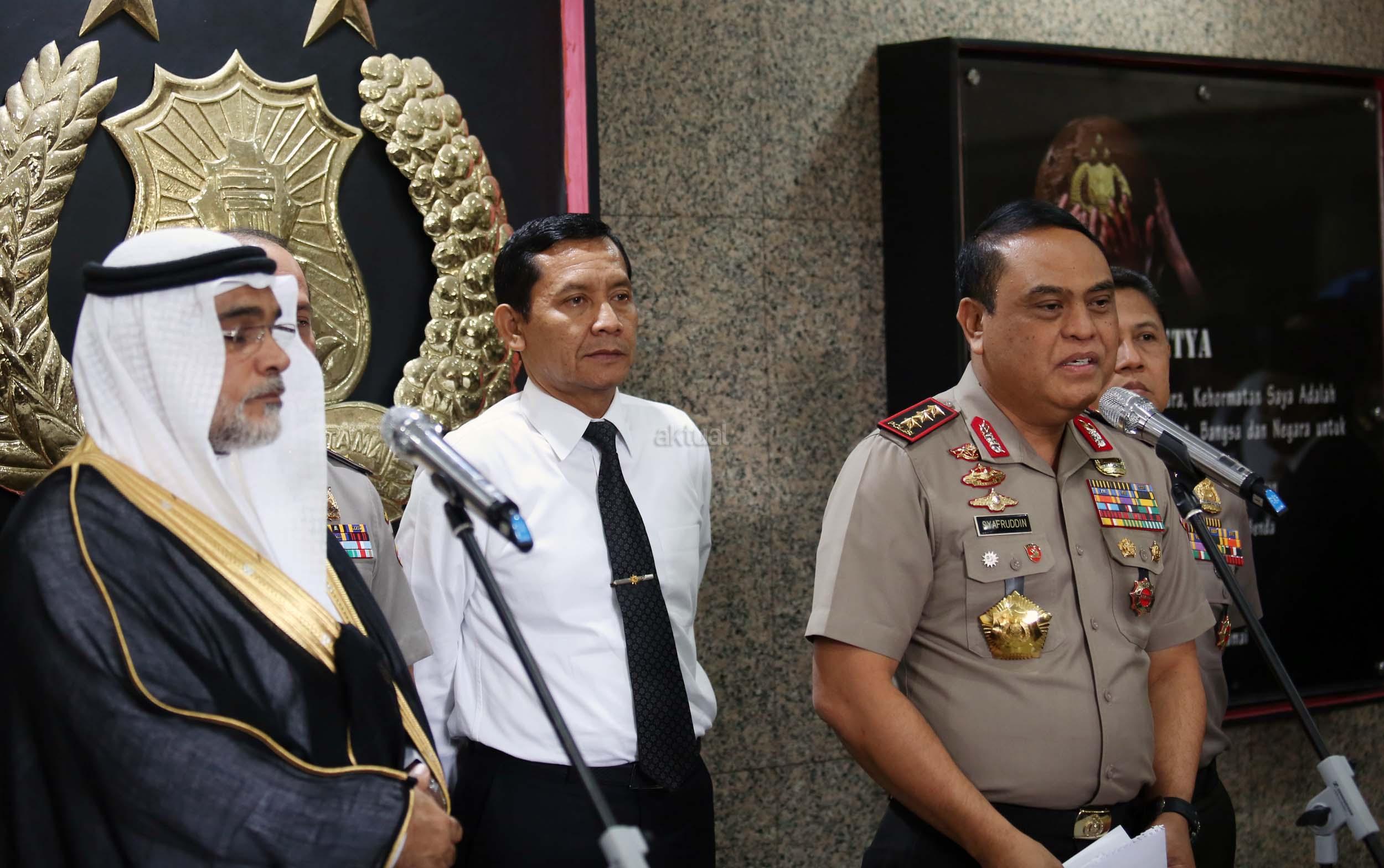 Wakapolri Komjen Pol Syafruddin (kanan), Duta Besar Arab Saudi Osama bin Mohammed Abdullah Al Shuaibi (kiri) didampingi Kabaintelkam Polri Komjen Pol Lutfi Lubihanto (kedua kanan) dan Kadivhumas Polri Irjen Pol Boy Rafli Amar memberikan keterangan pers terkait pengamanan Raja Salman di Mabes Polri, Jakarta, Senin (27/2/2017). Polri menyatakan sebanyak 10 ribu personel gabungan Polri-TNI bakal dikerahkan di tiga lokasi yang dikunjungi Raja Salman yakni Jakarta, Bogor (Jawa Barat) dan Bali.