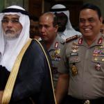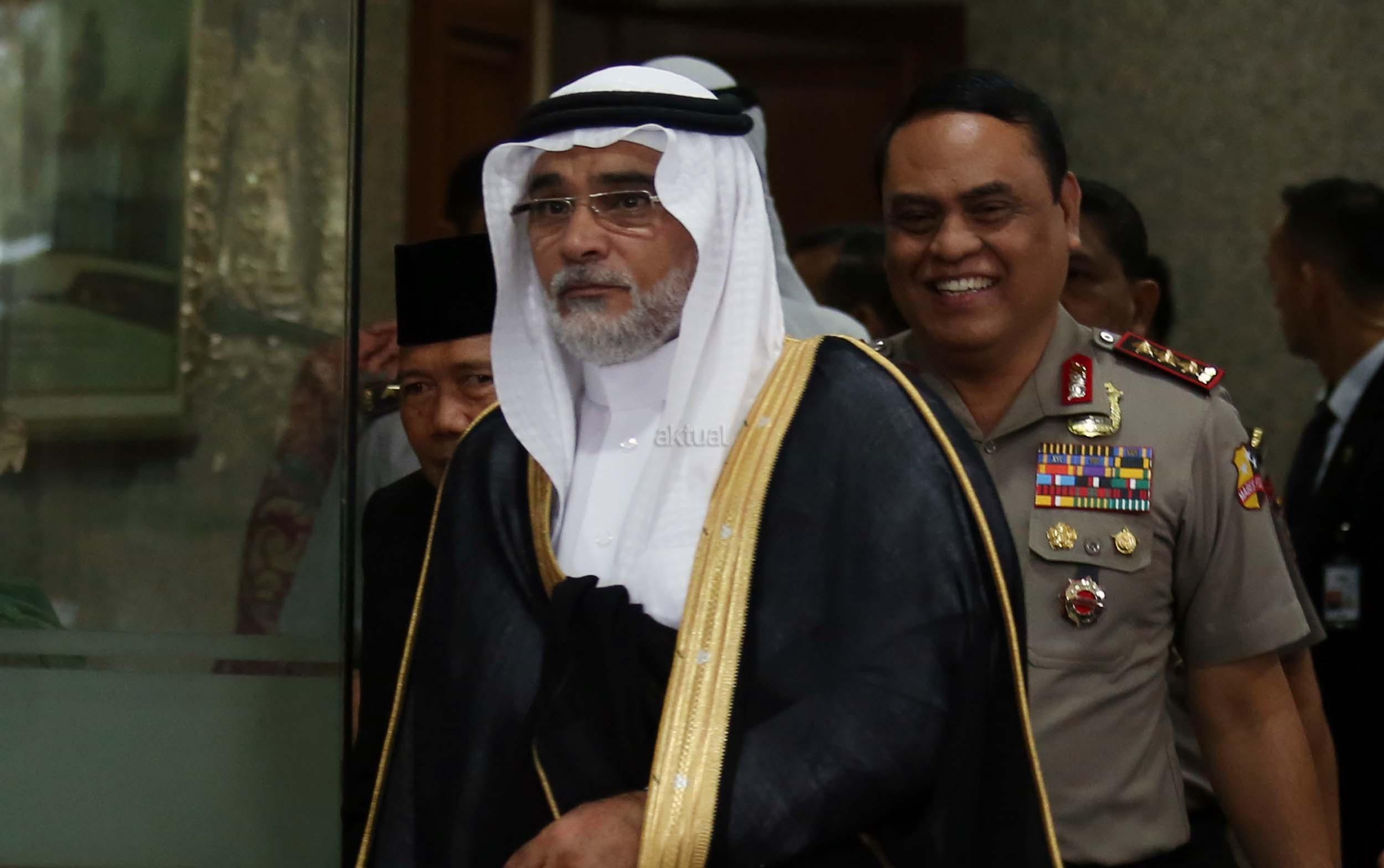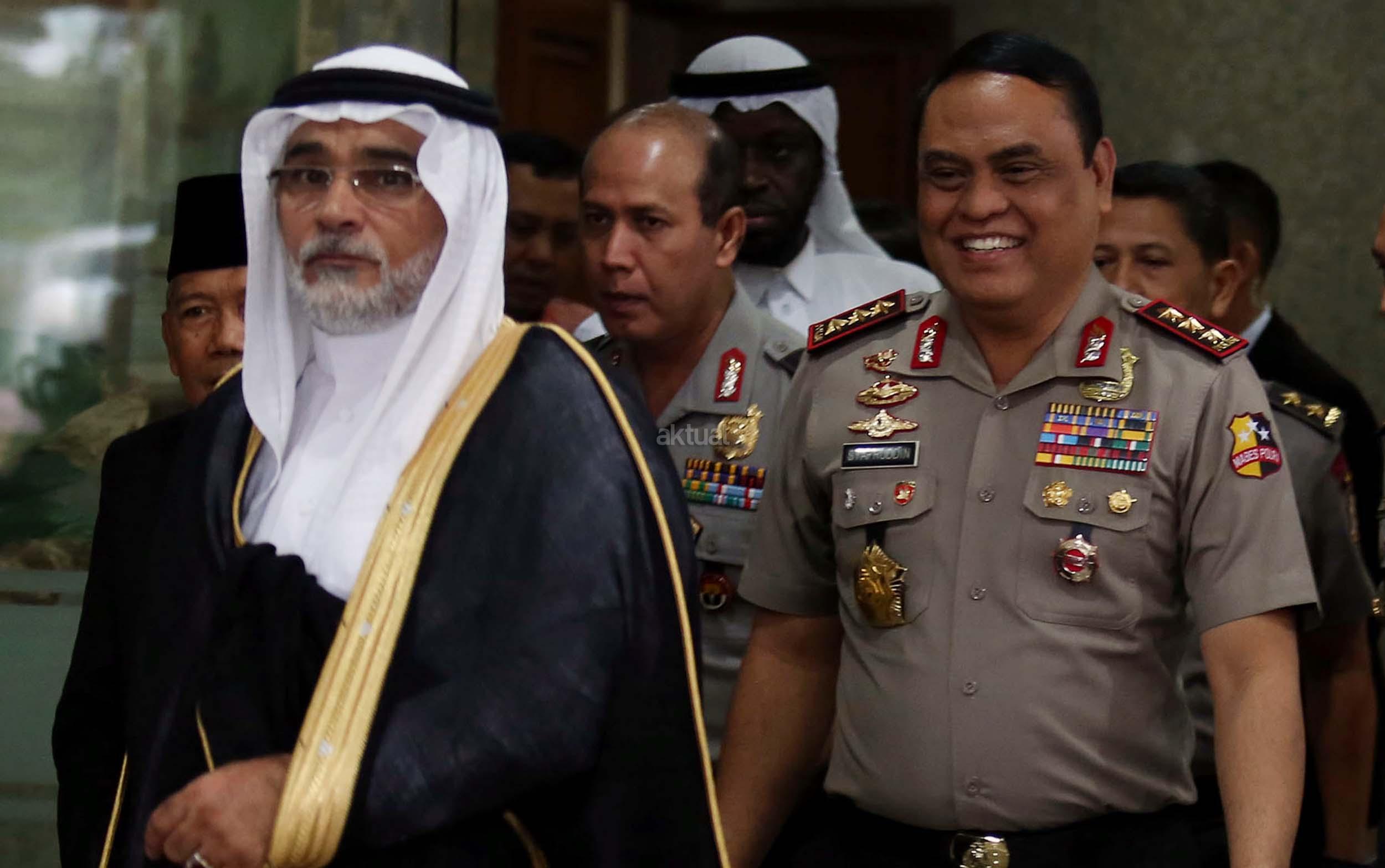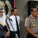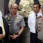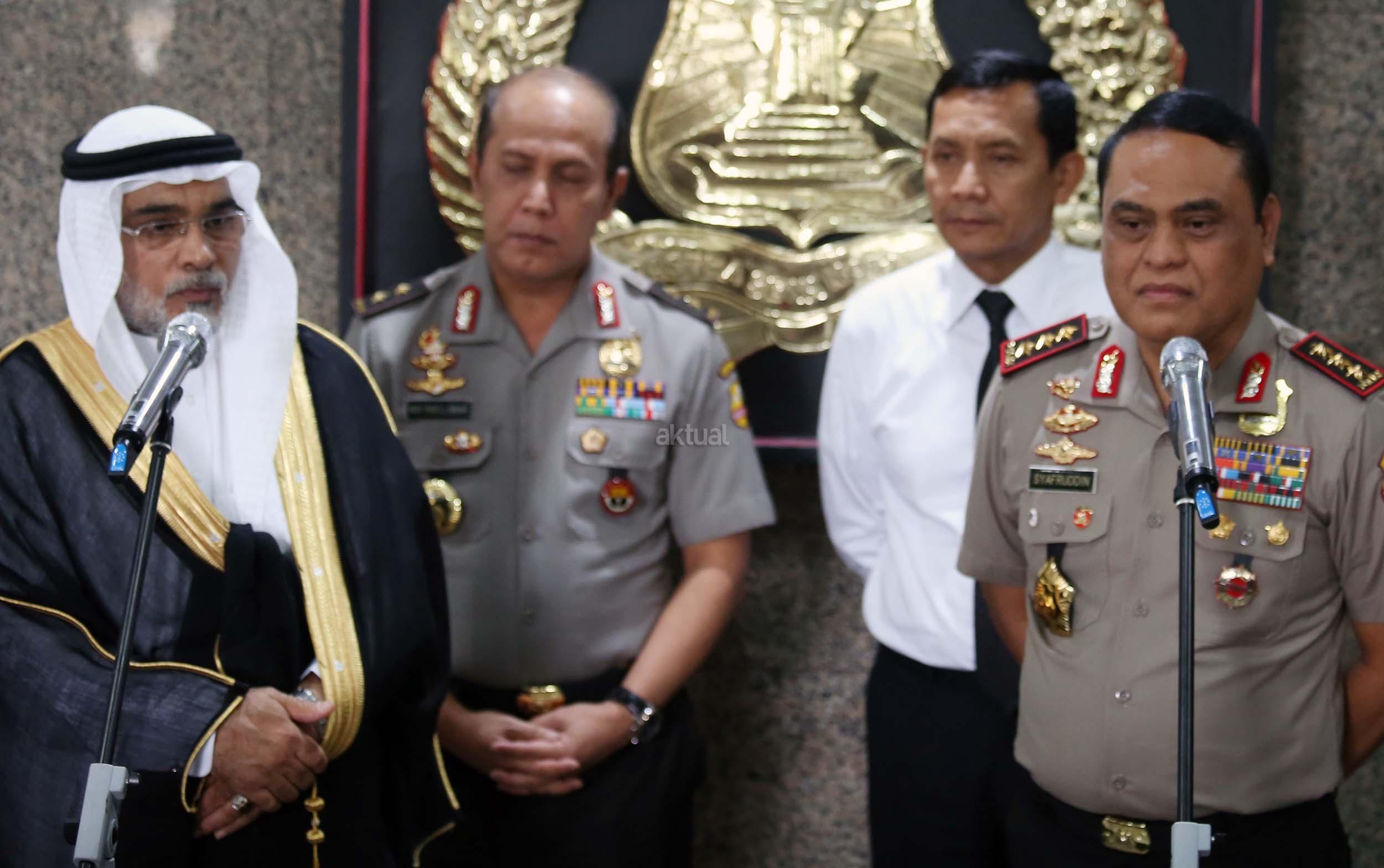 Wakapolri Komjen Pol Syafruddin (kanan), Duta Besar Arab Saudi Osama bin Mohammed Abdullah Al Shuaibi (kiri) didampingi Kabaintelkam Polri Komjen Pol Lutfi Lubihanto (kedua kanan) dan Kadivhumas Polri Irjen Pol Boy Rafli Amar memberikan keterangan pers terkait pengamanan Raja Salman di Mabes Polri, Jakarta, Senin (27/2/2017). Polri menyatakan sebanyak 10 ribu personel gabungan Polri-TNI bakal dikerahkan di tiga lokasi yang dikunjungi Raja Salman yakni Jakarta, Bogor (Jawa Barat) dan Bali.