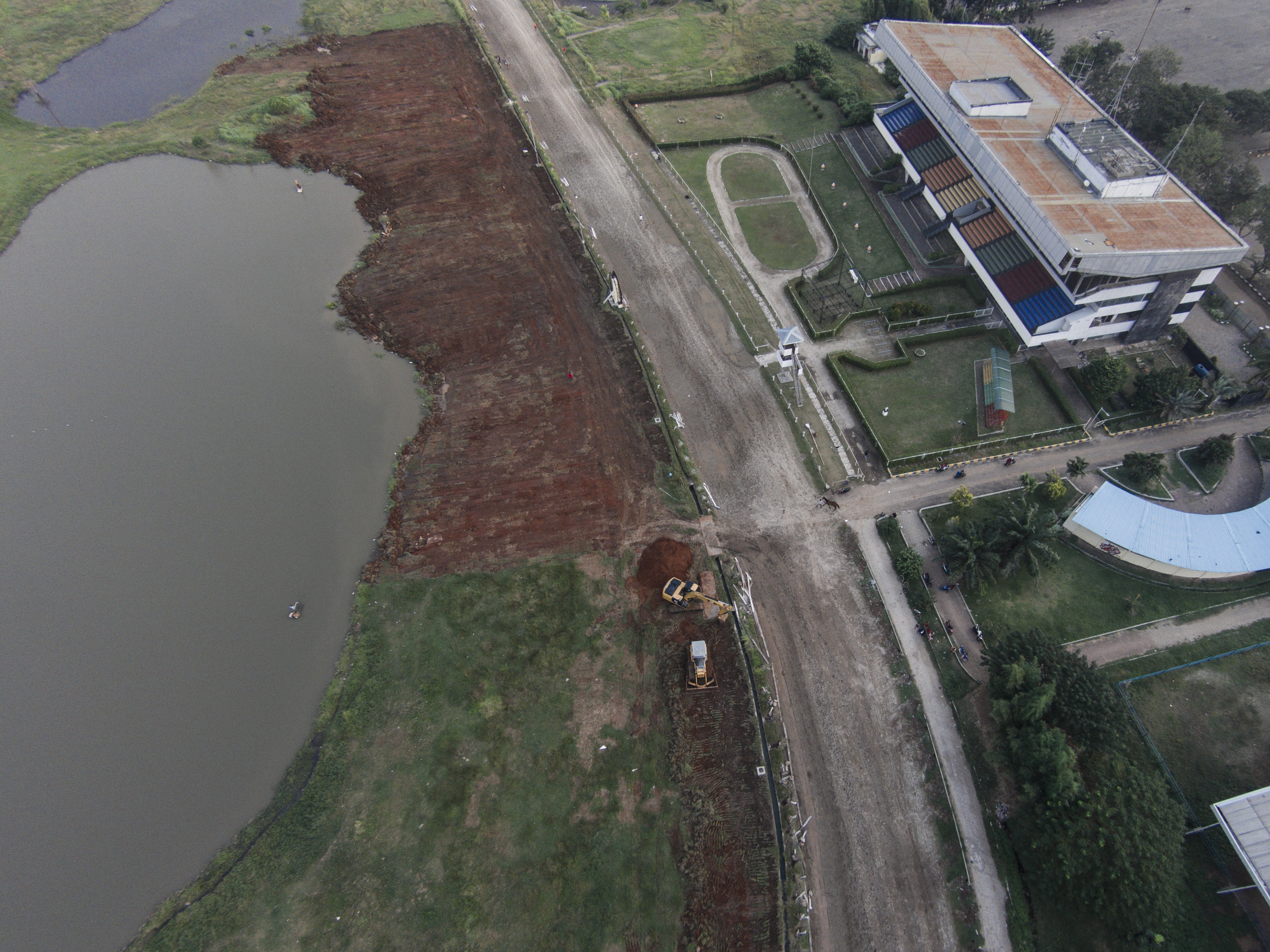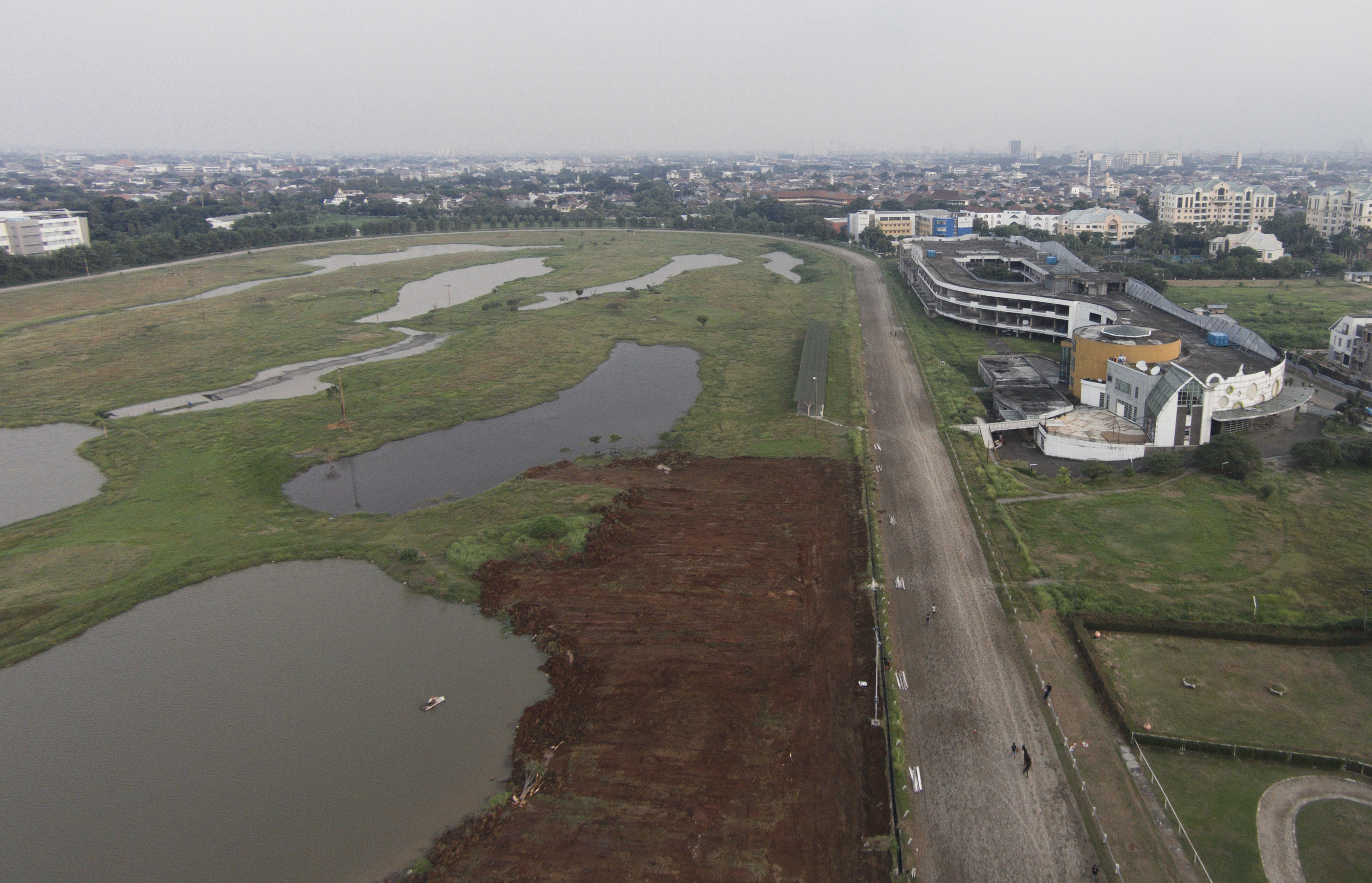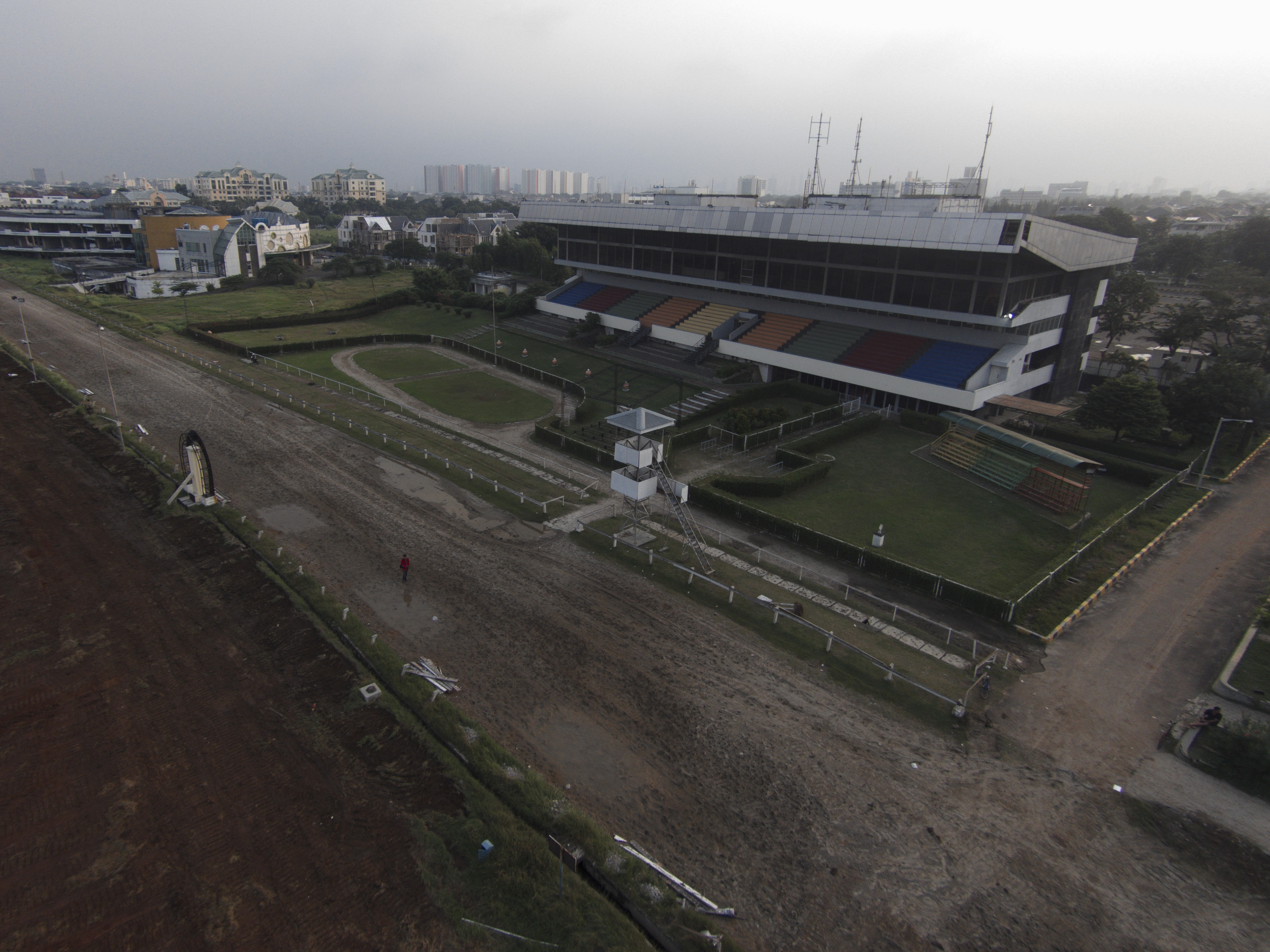 Foto aerial Jakarta International Equestrian Park yang mulai direnovasi di Jakarta, Jumat (24/6). Renovasi wahana ketangkasan berkuda berstandar internasional seluas 35 hektar tersebut dipersiapkan untuk Asian Games 2018. ANTARA FOTO/Rosa Panggabean/ama/16.
