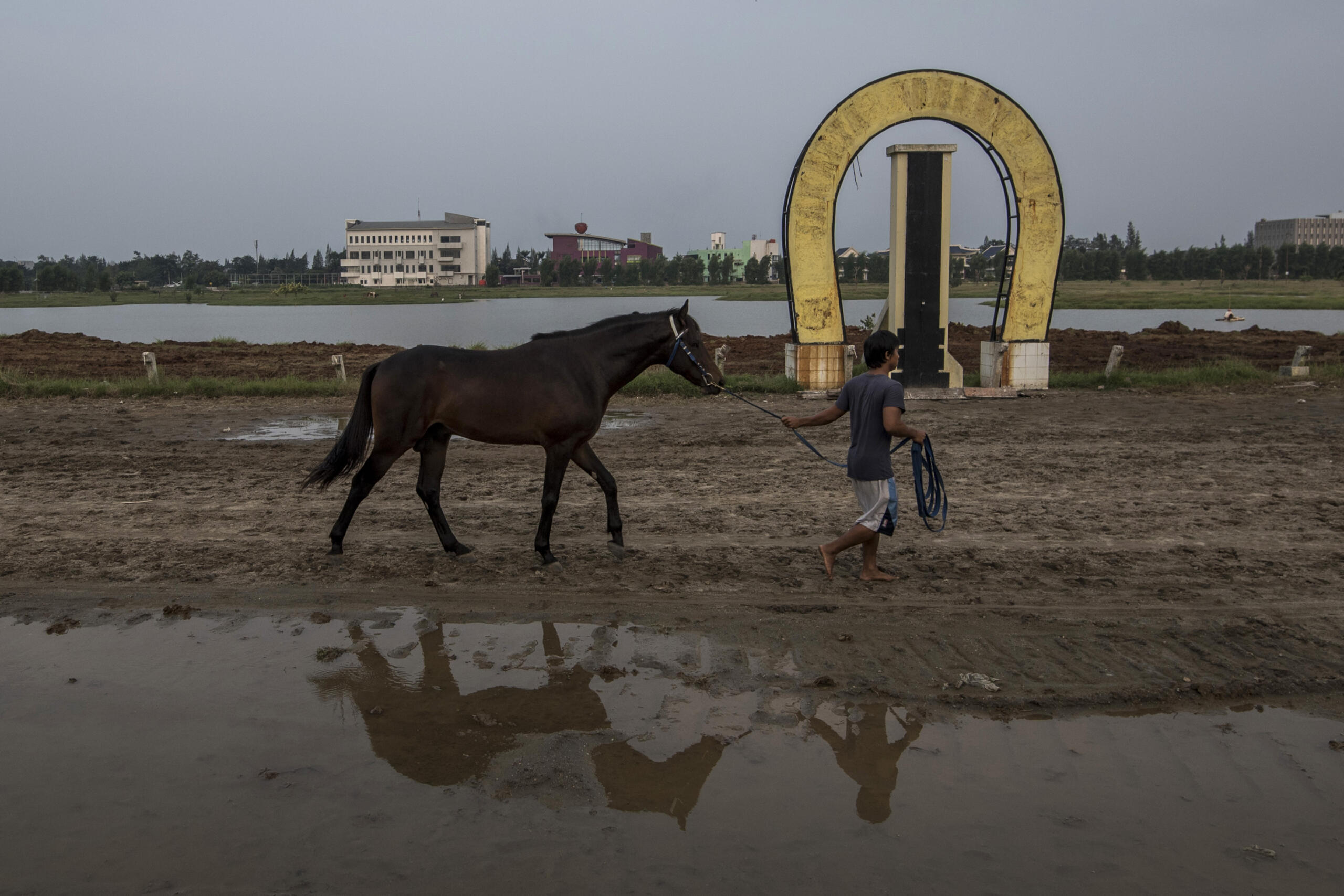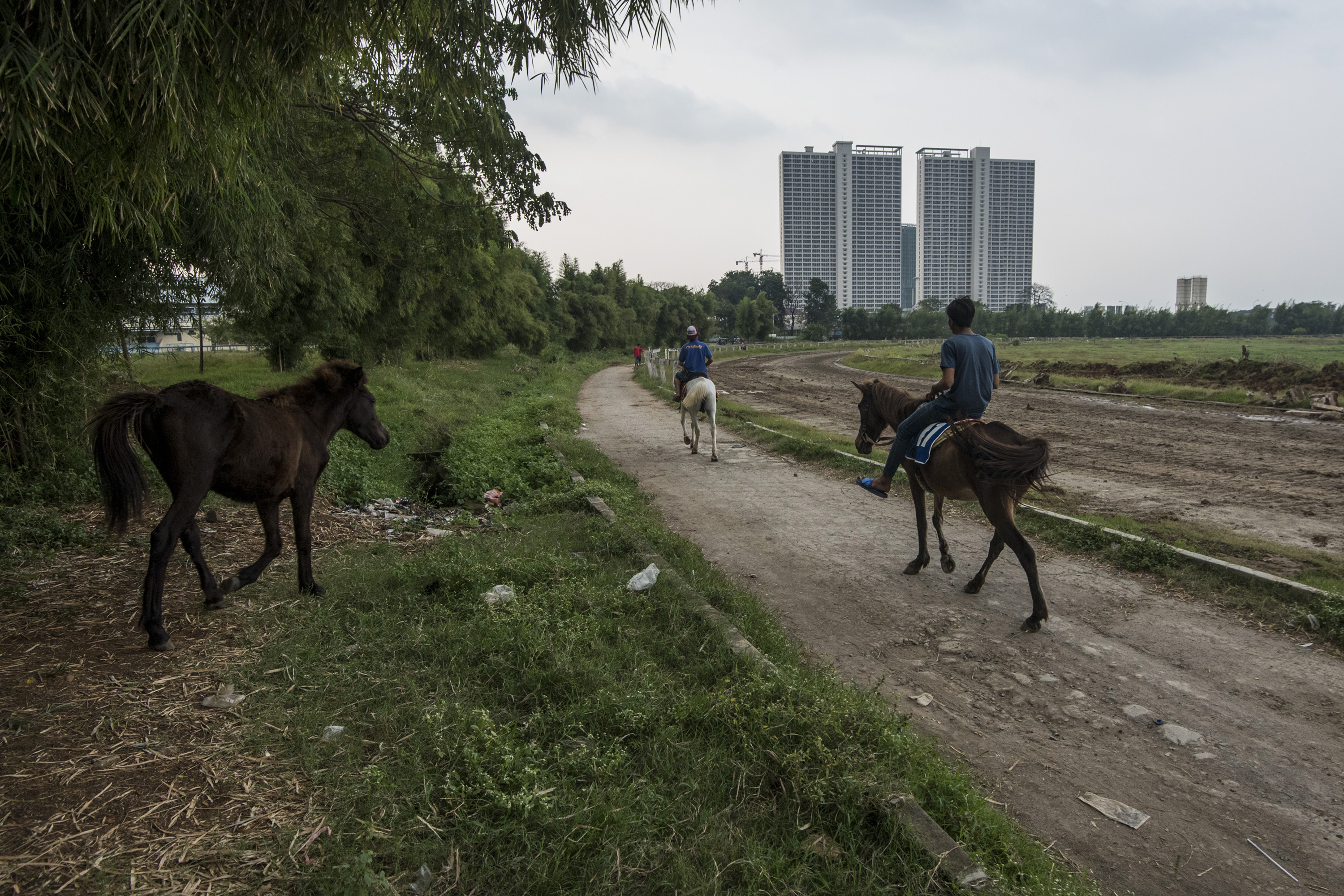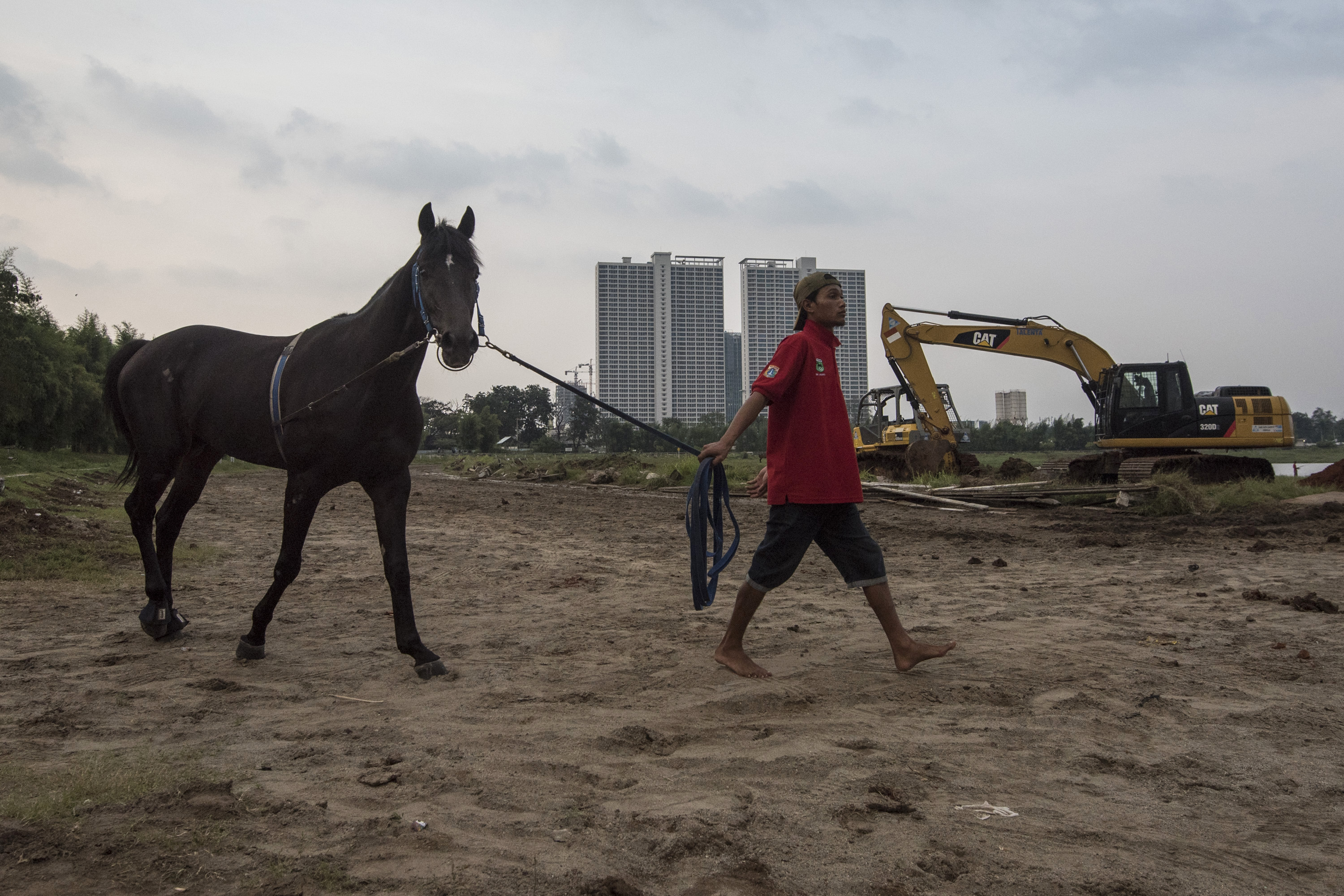 Warga membawa kuda berkeliling Jakarta International Equestrian Park yang mulai direnovasi di Pulomas, Jakarta, Jumat (24/6). Renovasi wahana ketangkasan berkuda berstandar internasional seluas 35 hektar tersebut dipersiapkan untuk Asian Games 2018. ANTARA FOTO/Sigid Kurniawan/ama/16.